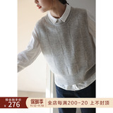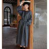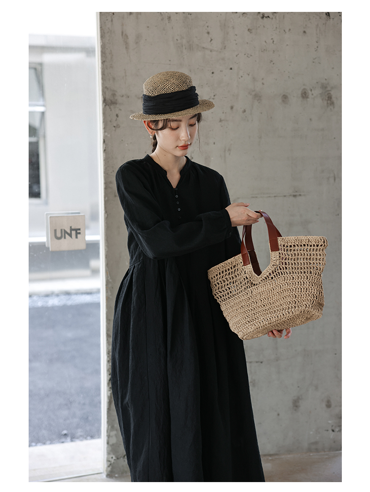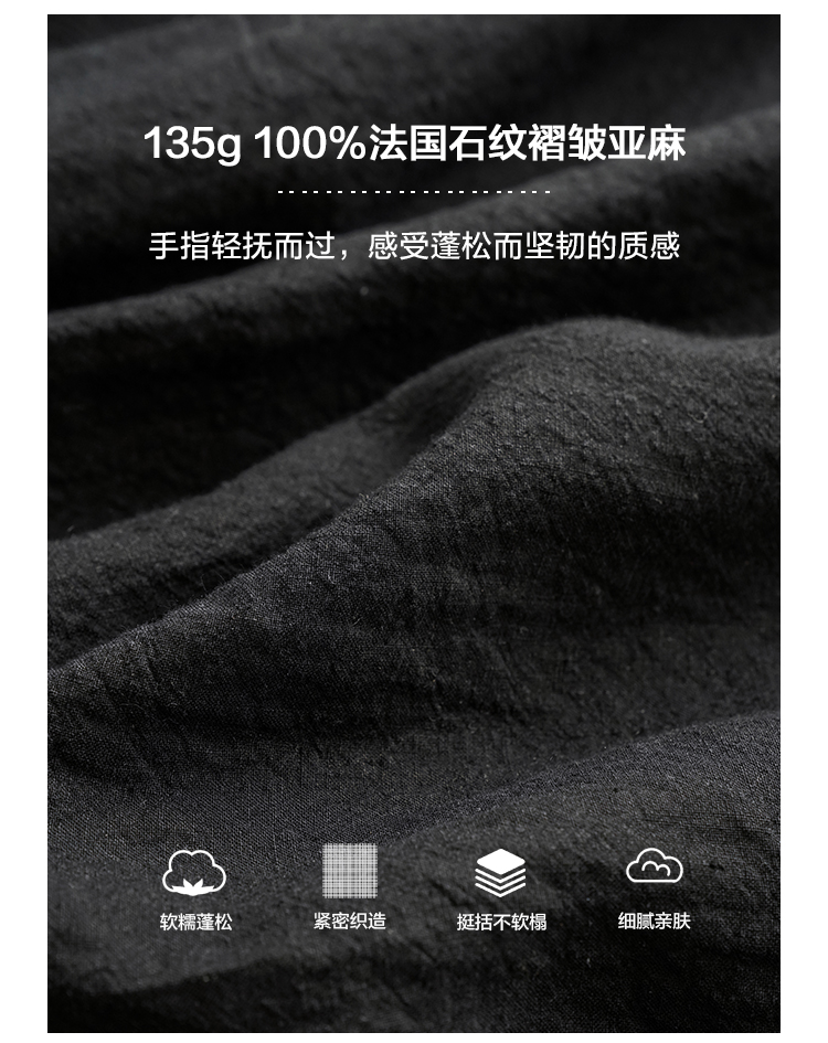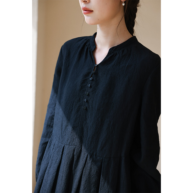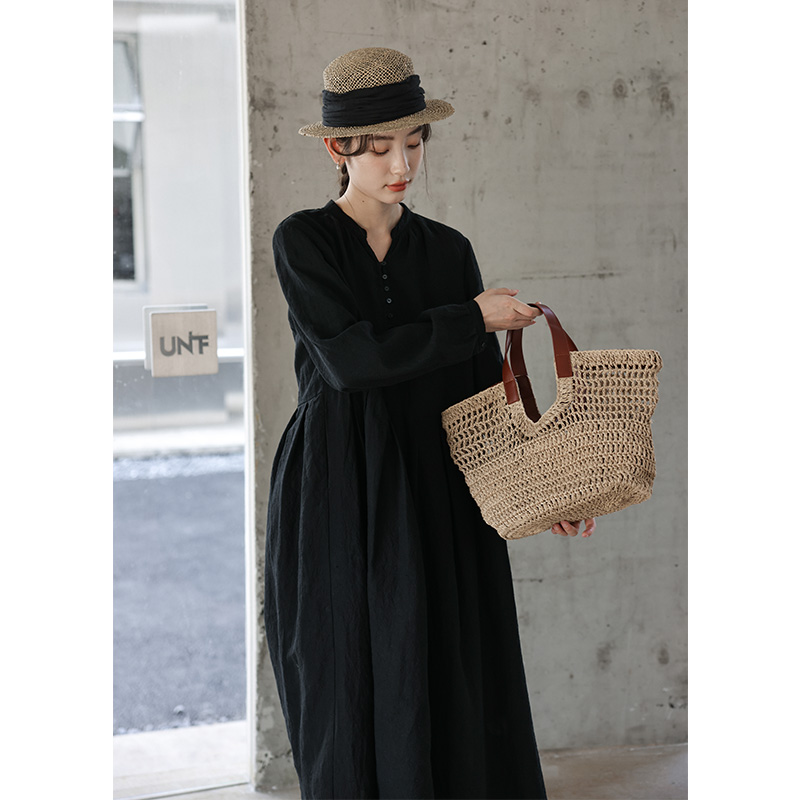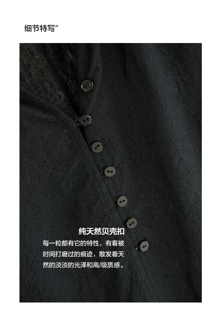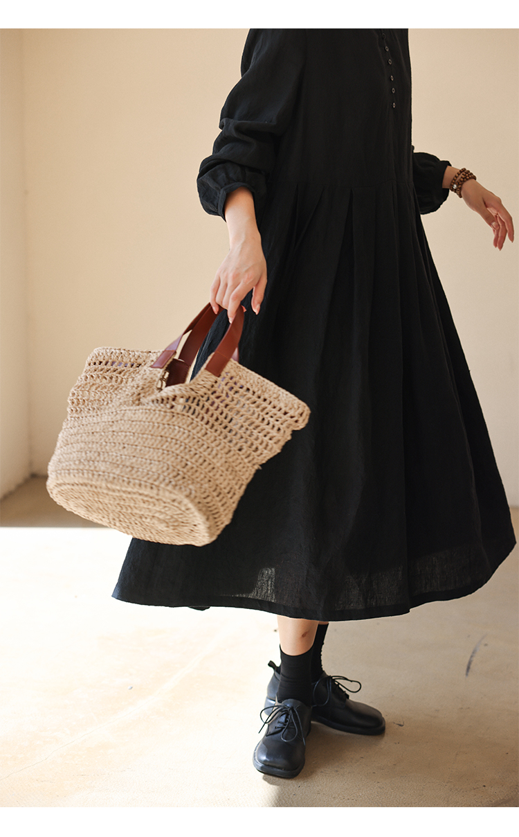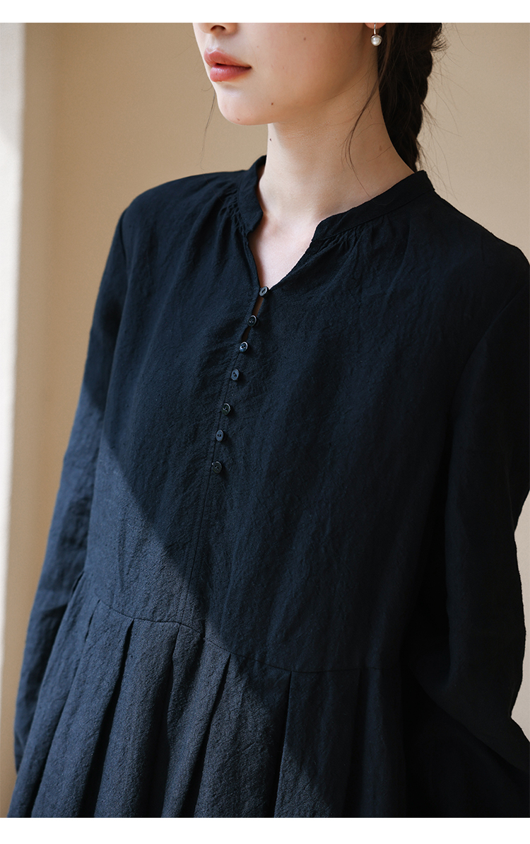 可然琉月 100%法國石紋褶皺亞麻2023秋季新款小黑裙中長版洋裝