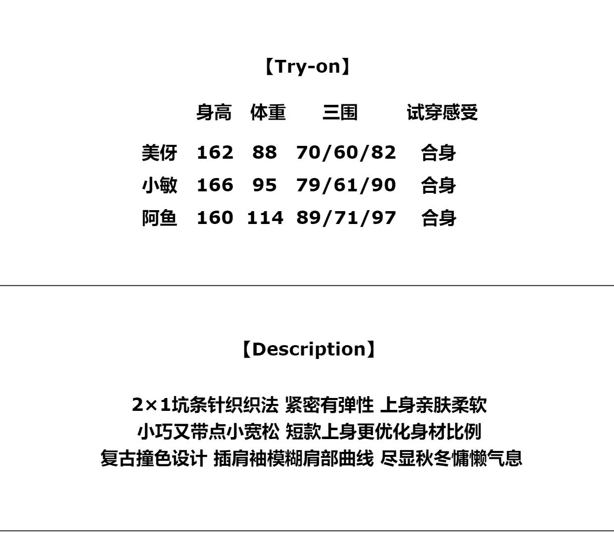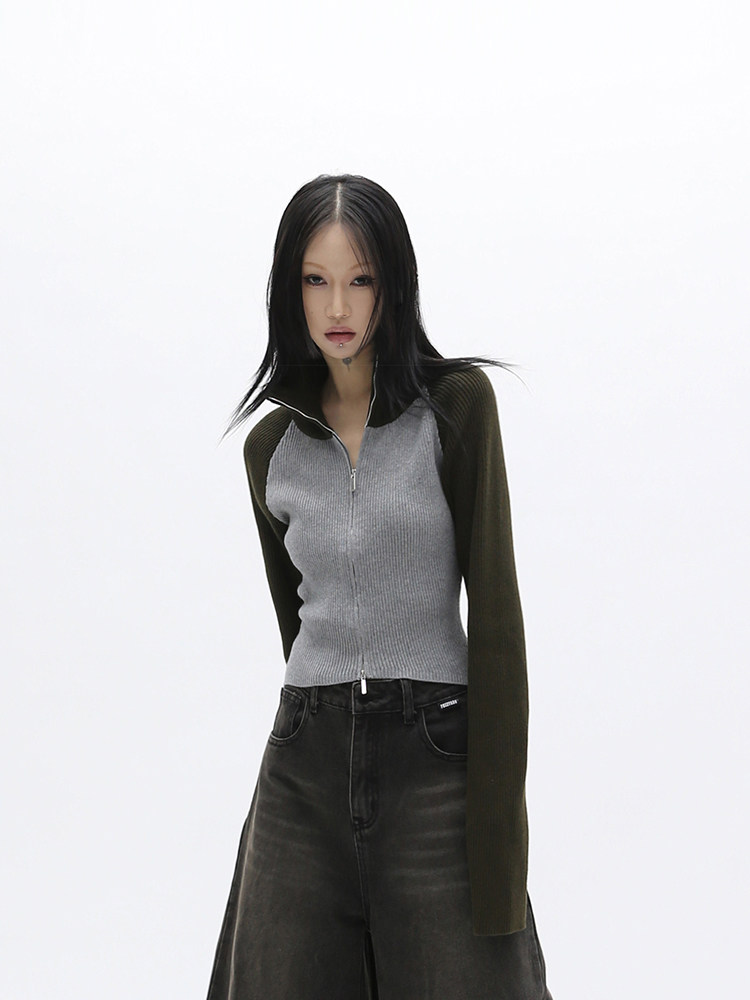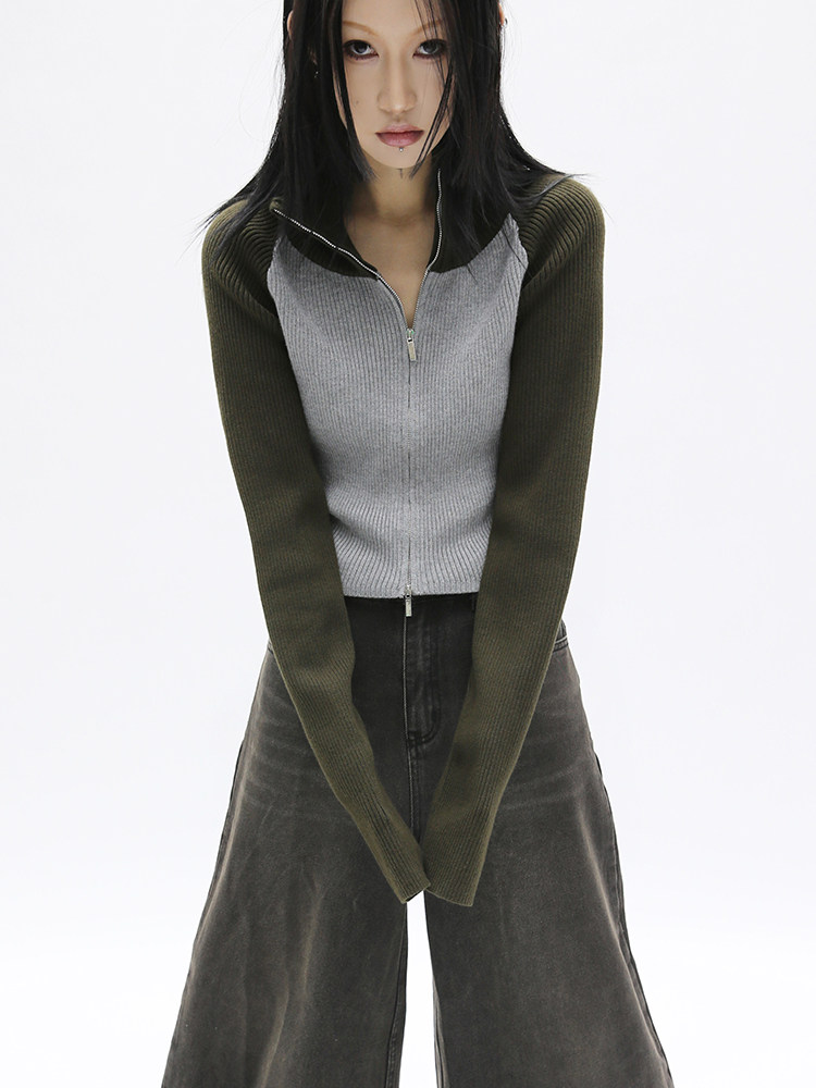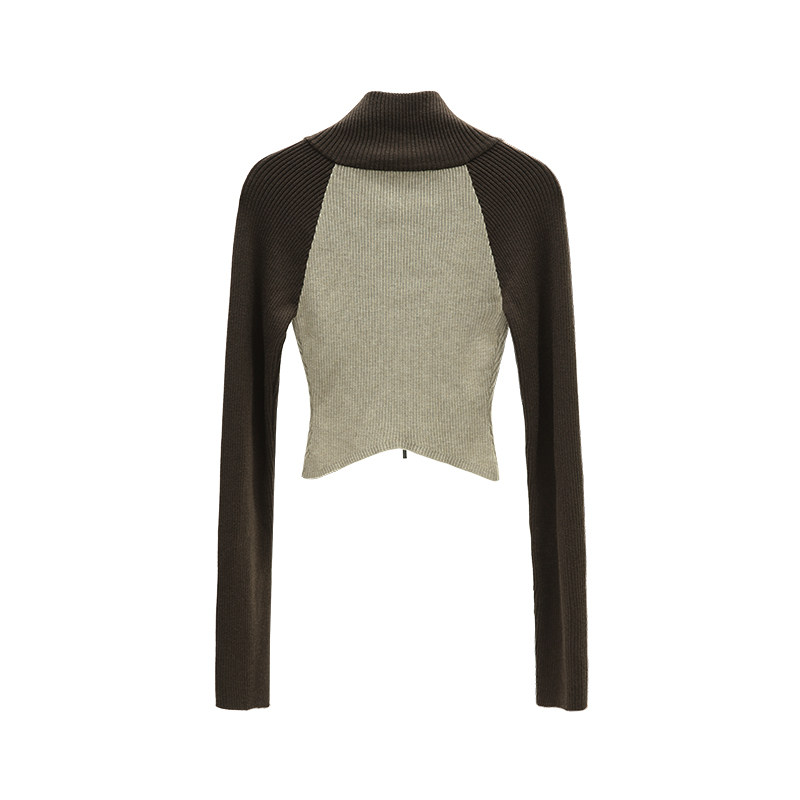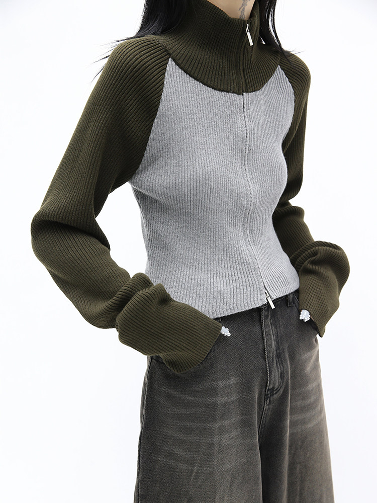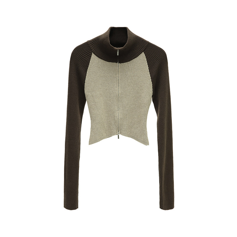 美伢FUZZYKON 加厚短款高領拉鍊復古撞色插肩針織外套杏棕/灰綠