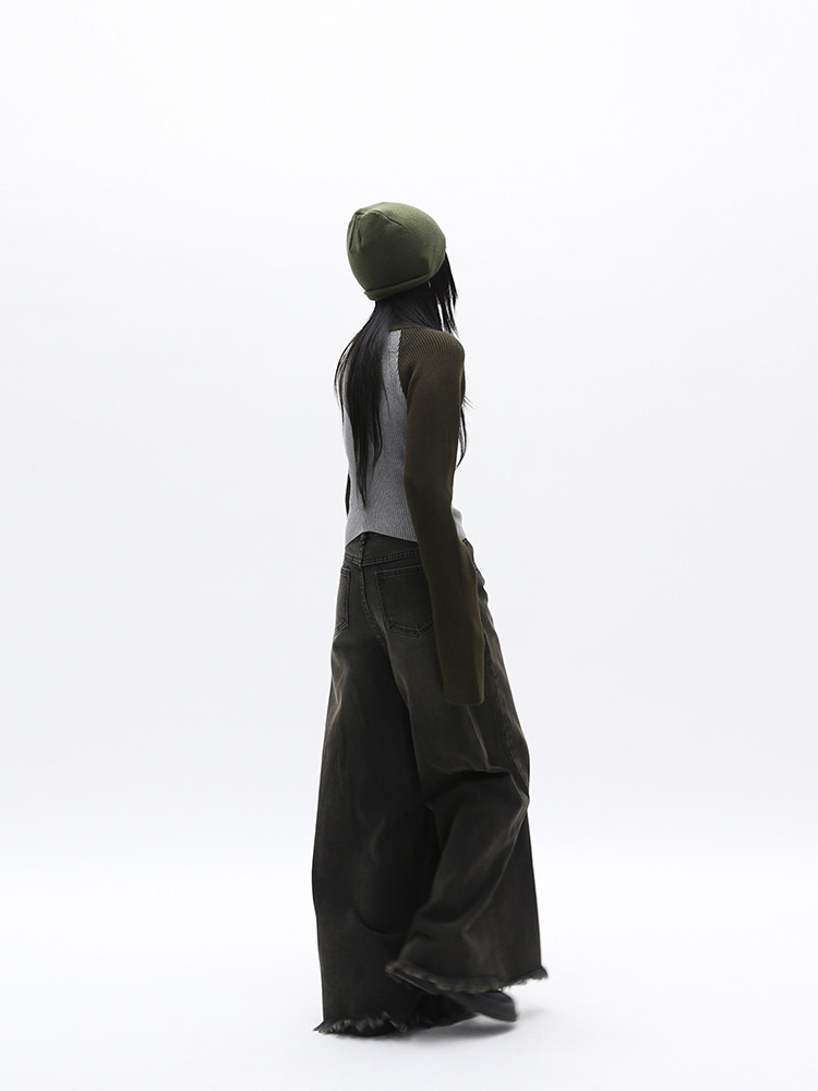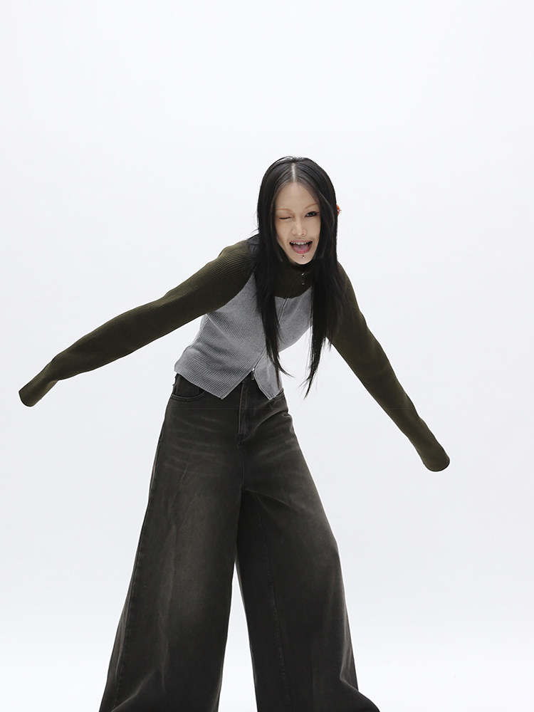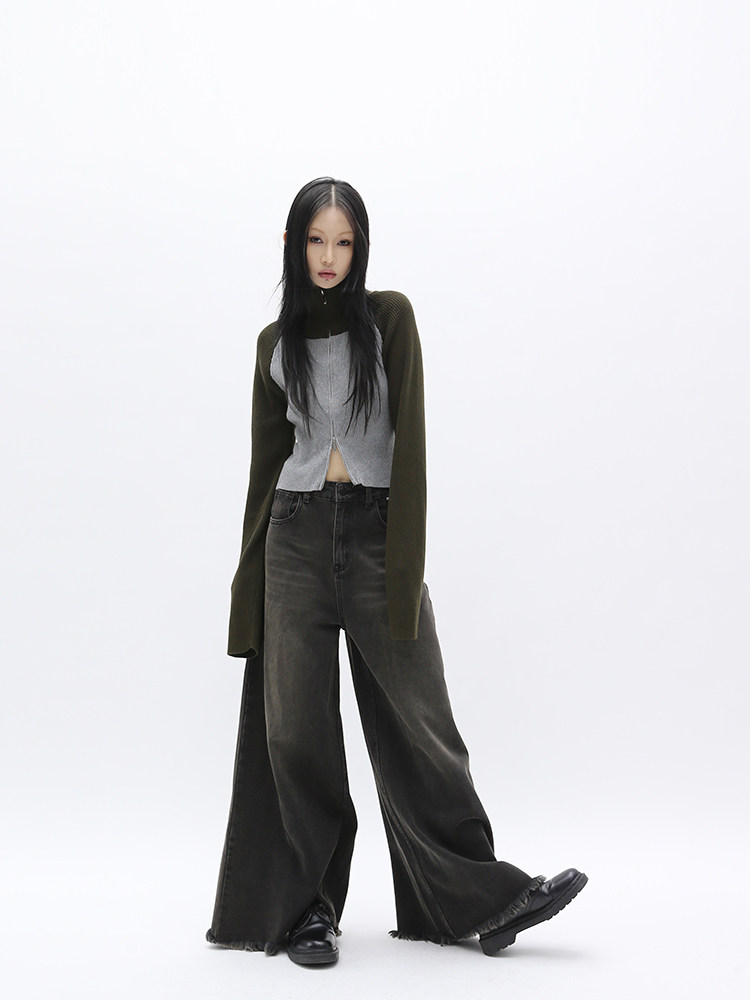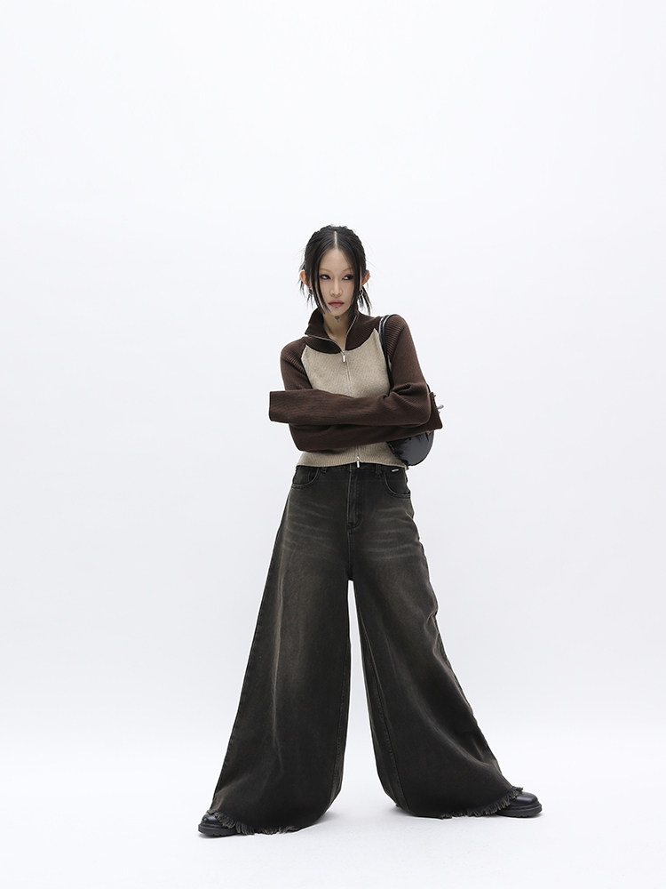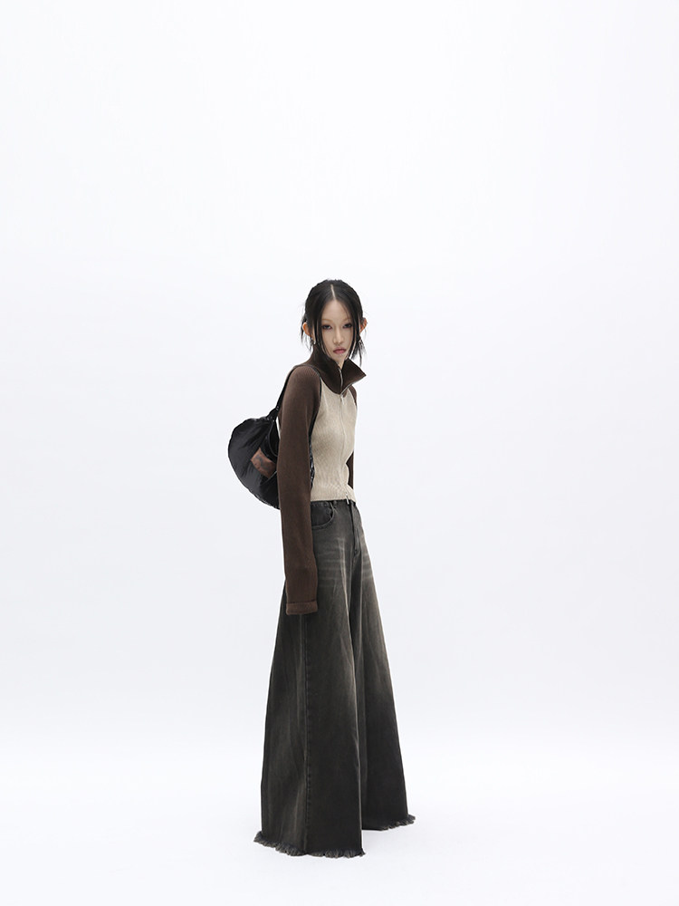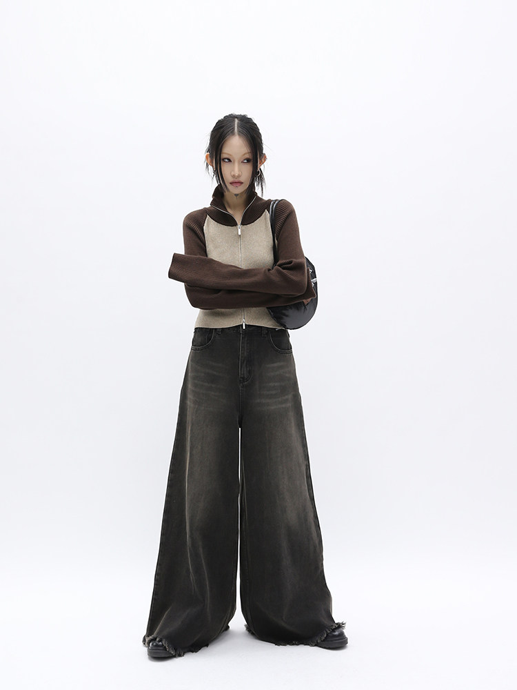 美伢FUZZYKON 加厚短款高領拉鍊復古撞色插肩針織外套杏棕/灰綠