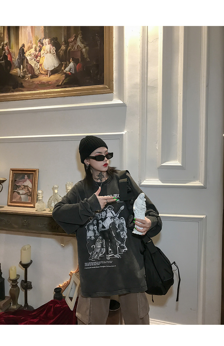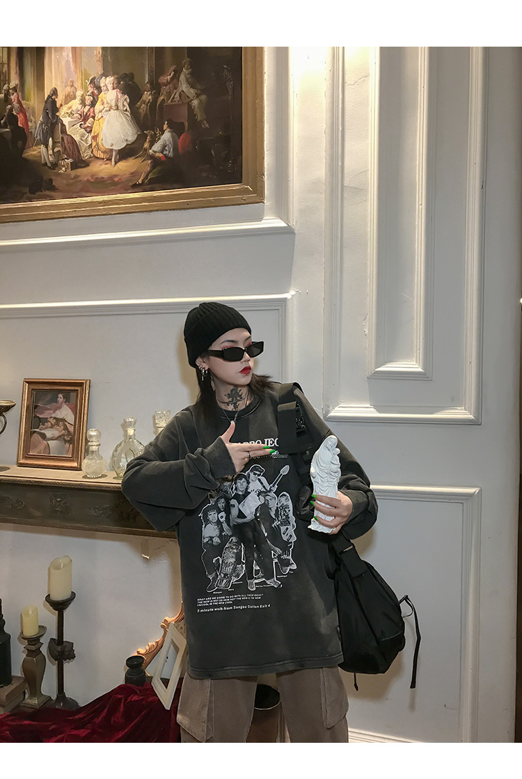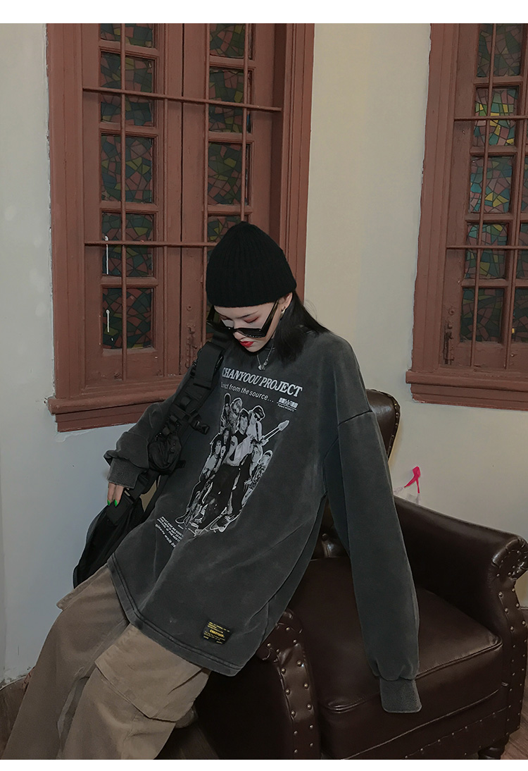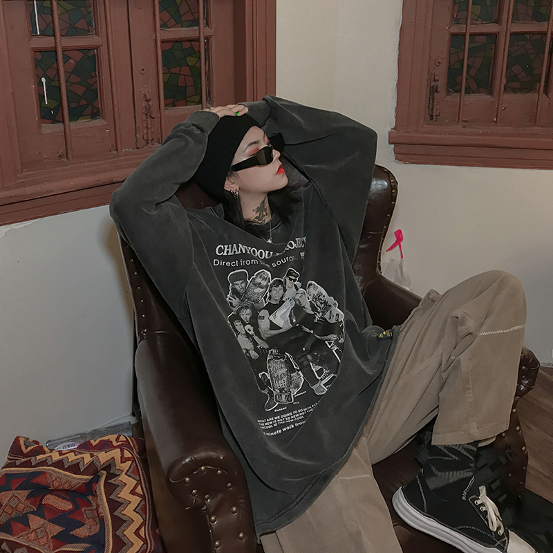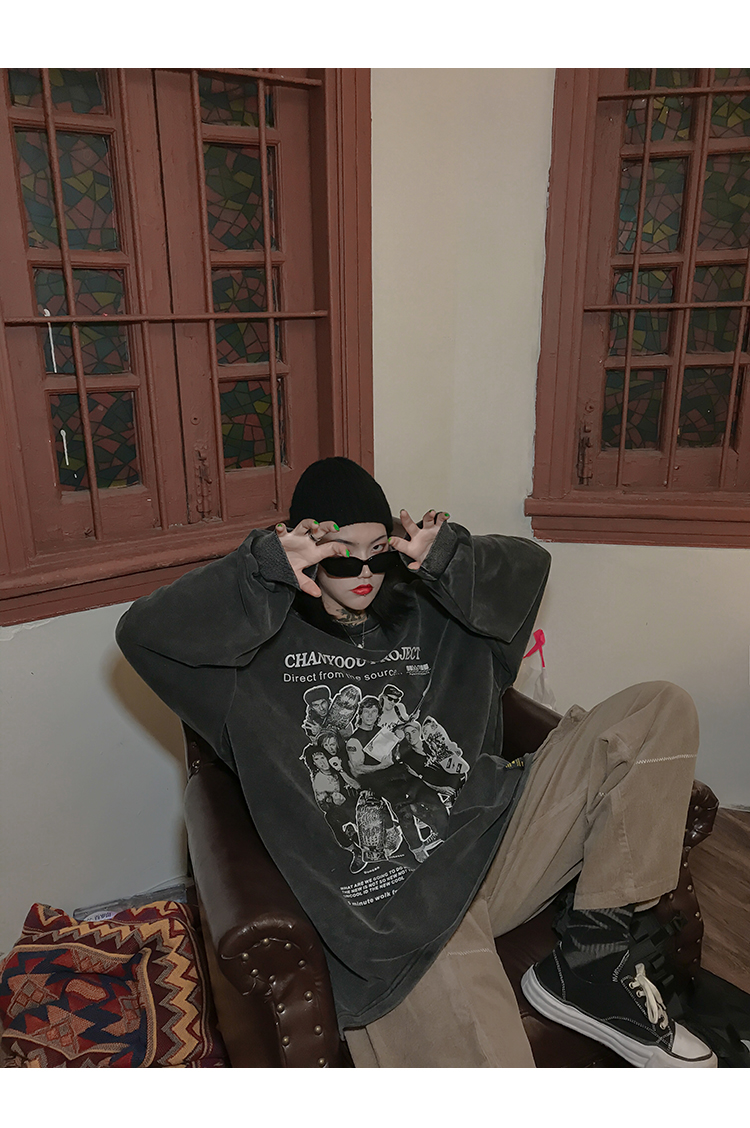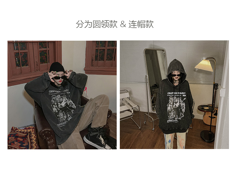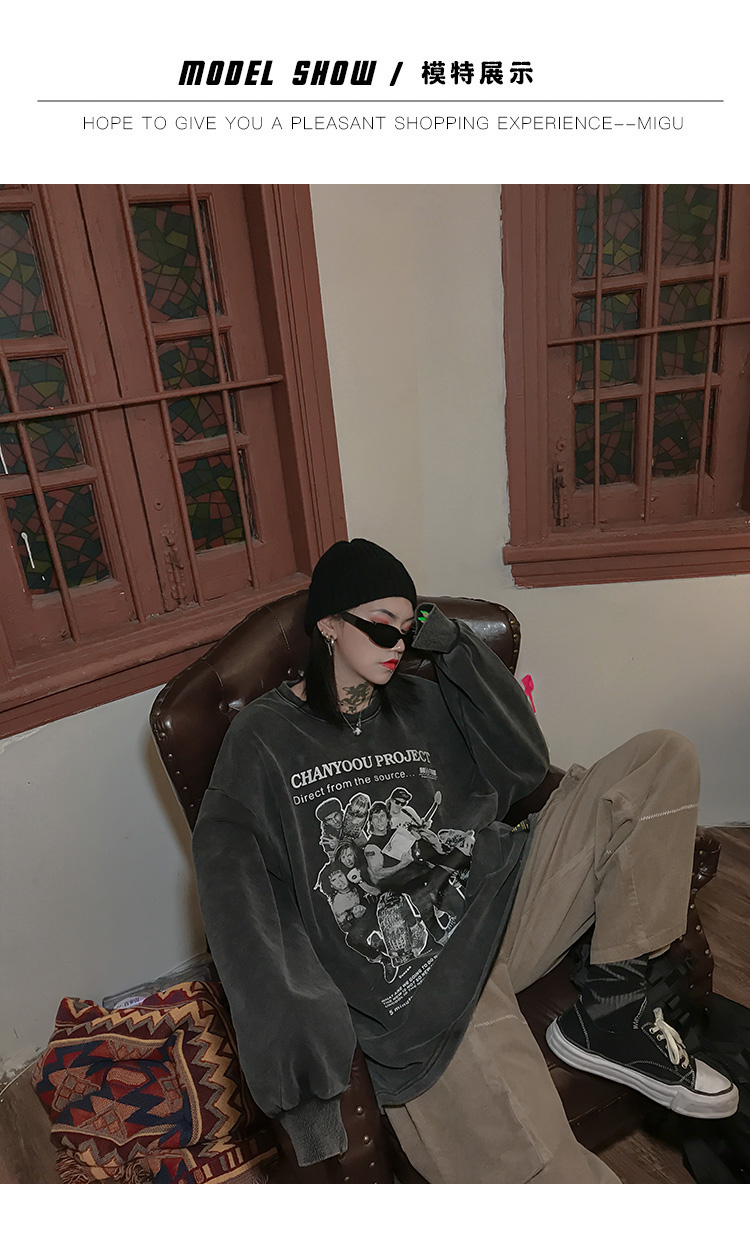migu美式復古圓領無性別衛衣oversize小眾慵懶風男女加絨寬鬆連帽