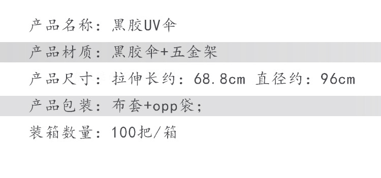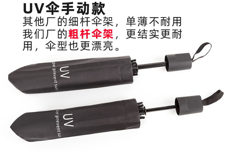 我们厂生产的这款黑胶UV伞手动款采用“加粗杆伞架”,更结实更耐用,伞型也更漂亮。目前市场上其他厂家做的大部分都是细杆伞架,而且还是无码的,成本相差了几毛钱,请大家购买的时候注意区分。