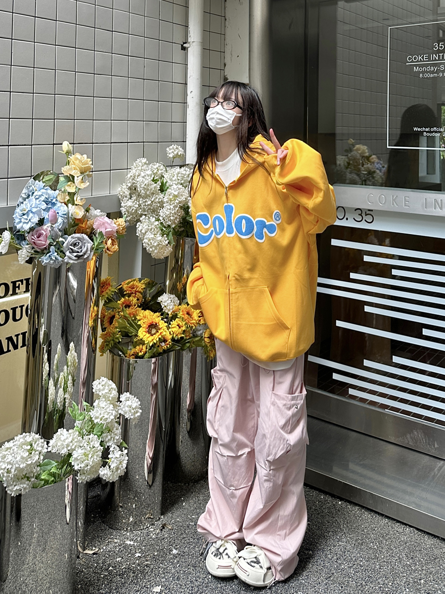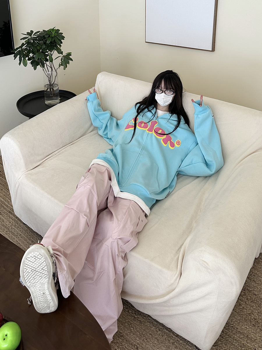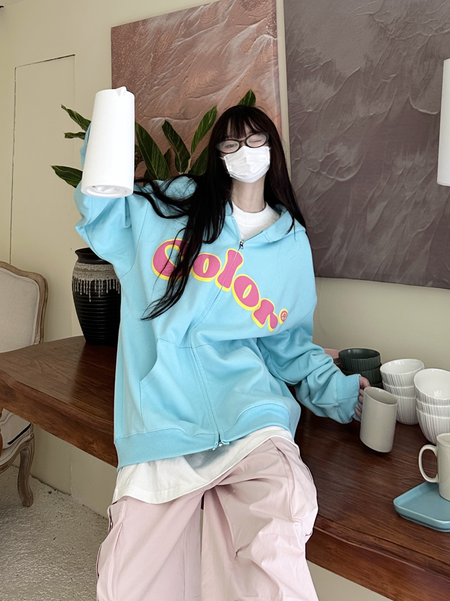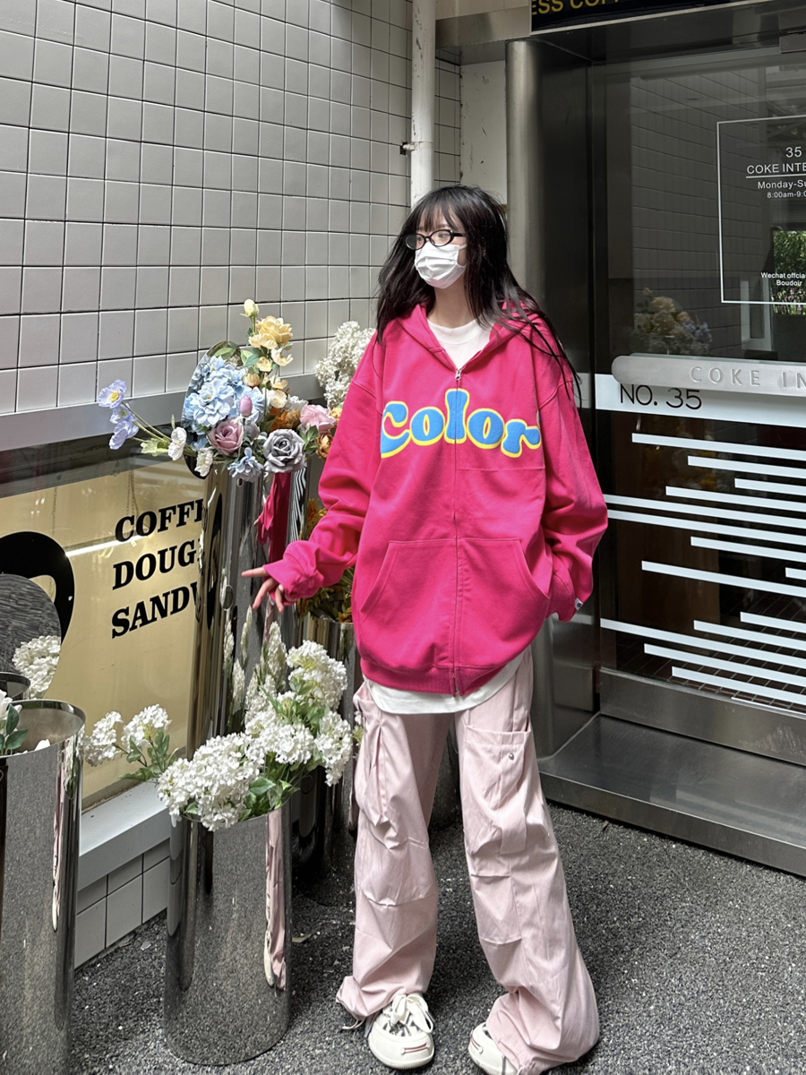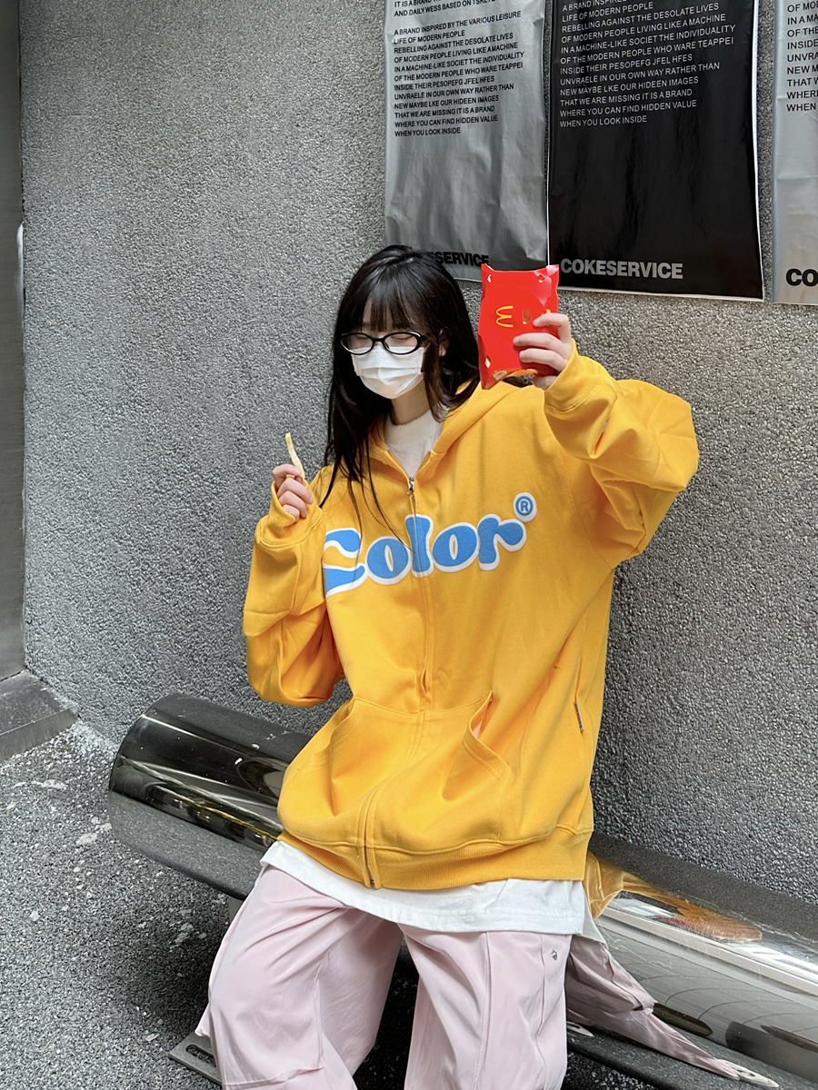 咖哩人秋美式復古彩色高街連帽運動衫外套開衫多巴胺男女學生百搭