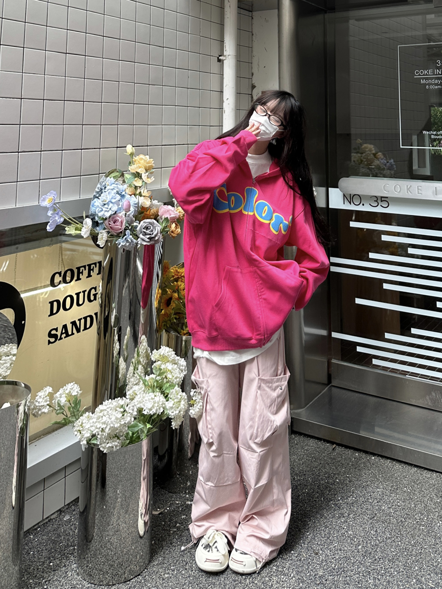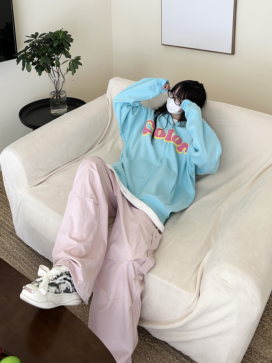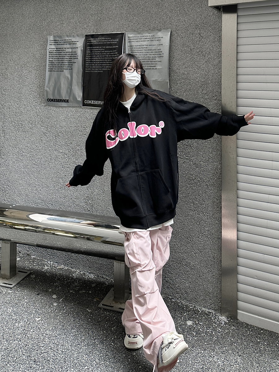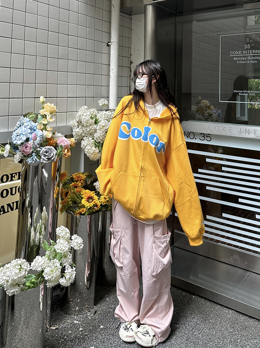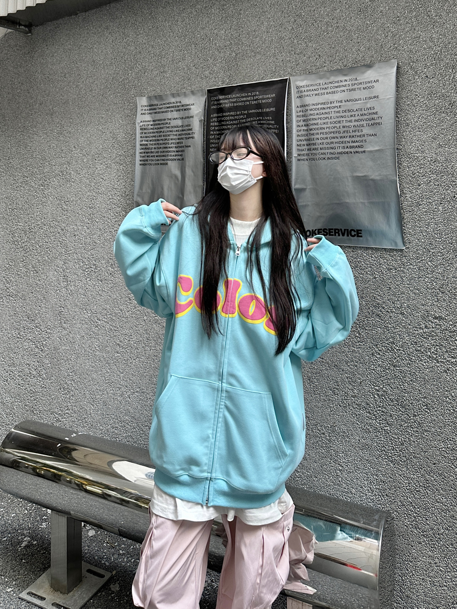 咖哩人秋美式復古彩色高街連帽運動衫外套開衫多巴胺男女學生百搭
