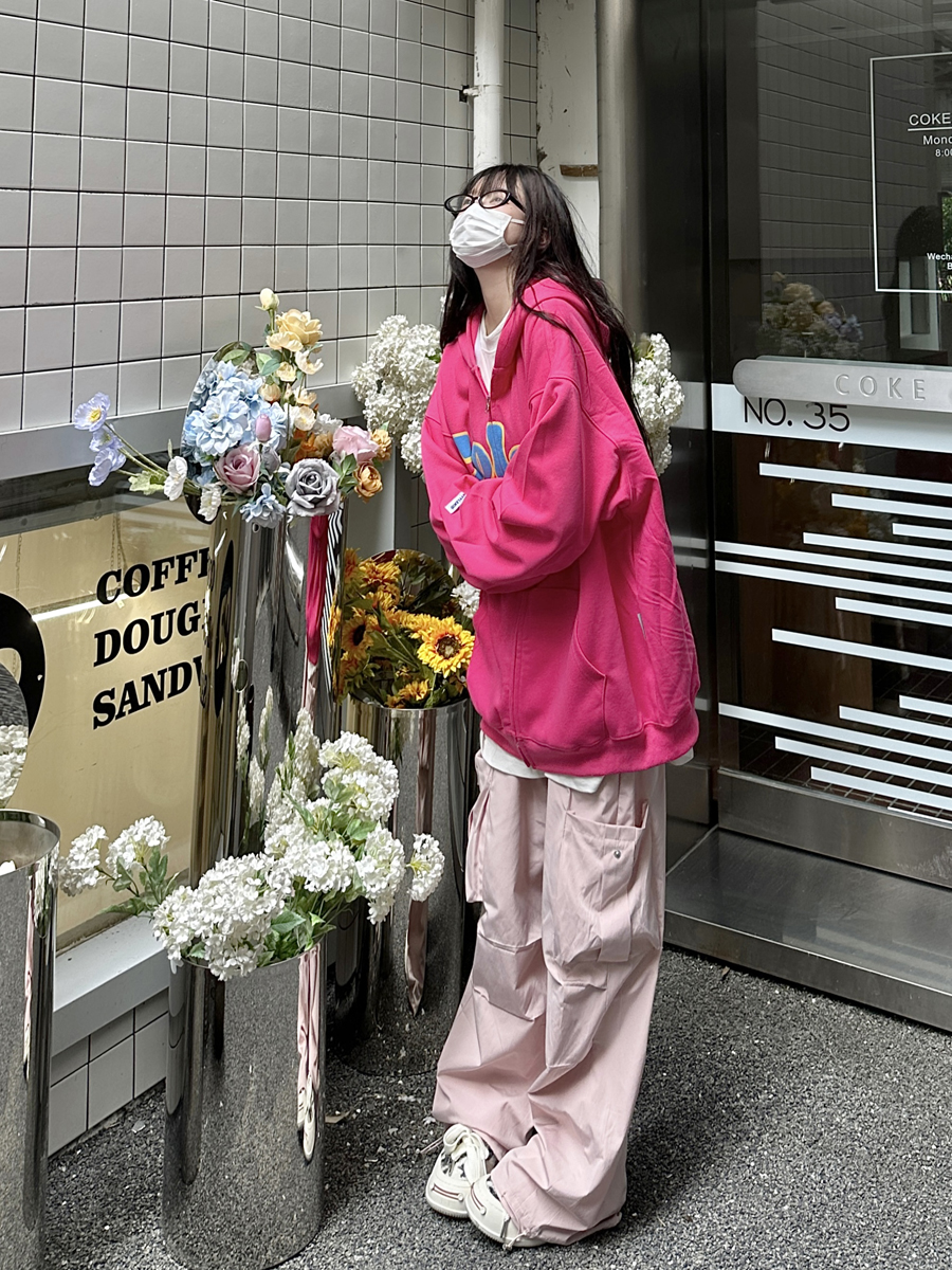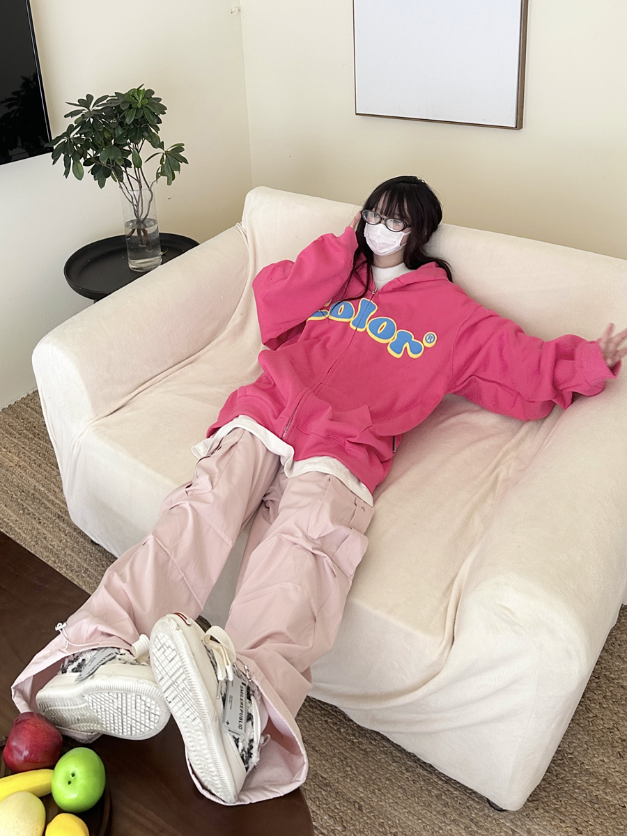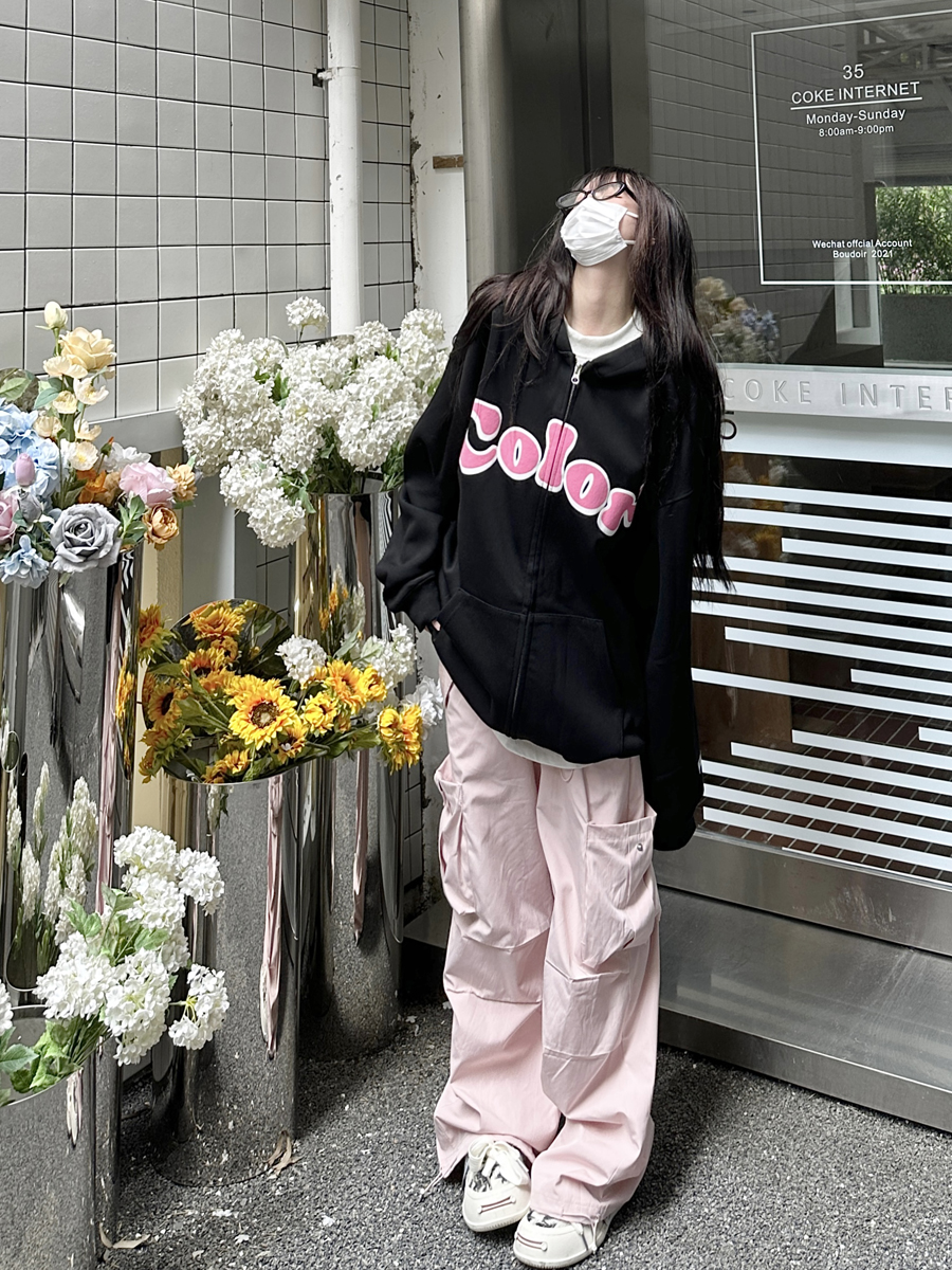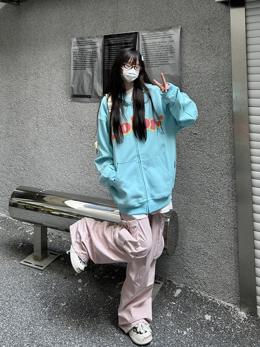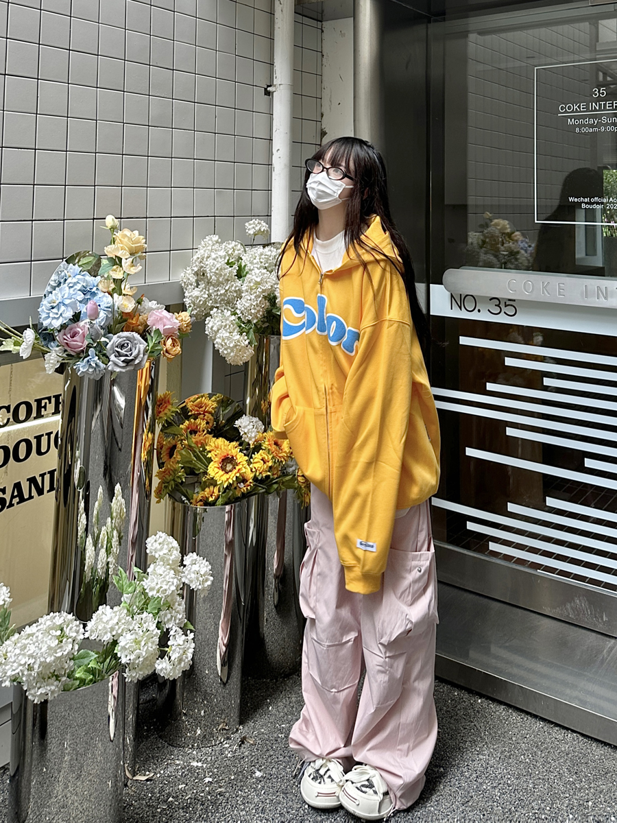 咖哩人秋美式復古彩色高街連帽運動衫外套開衫多巴胺男女學生百搭
