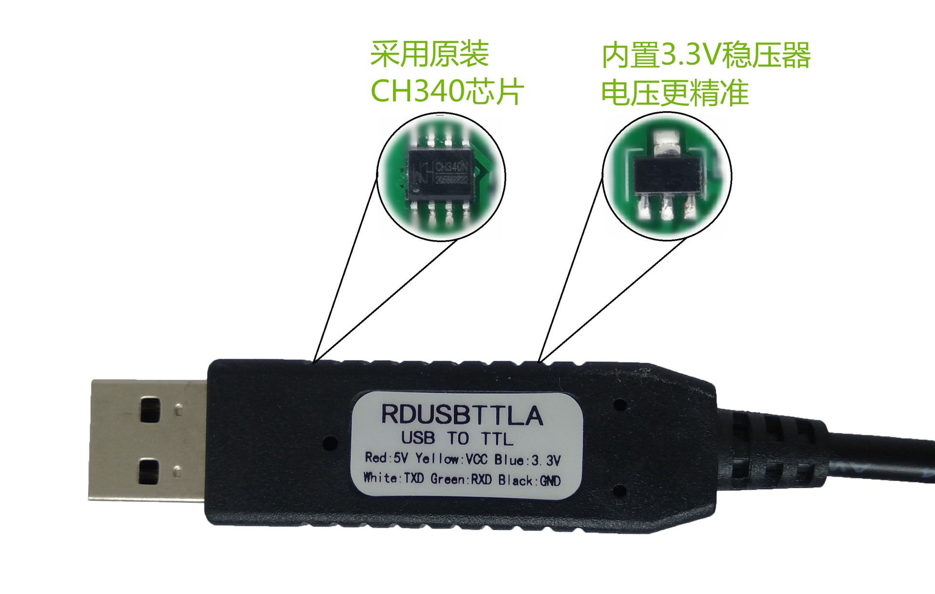 USBTTL电平串口线,采用原装CH340芯片,硬件全双工串口,内置收发缓冲区,支持通讯波特率50bps2Mbps。计算机端Windows操作系统下的串口应用程序完全兼容,无需修改。