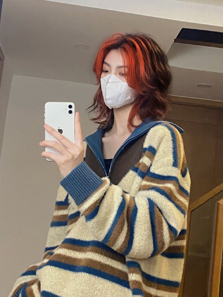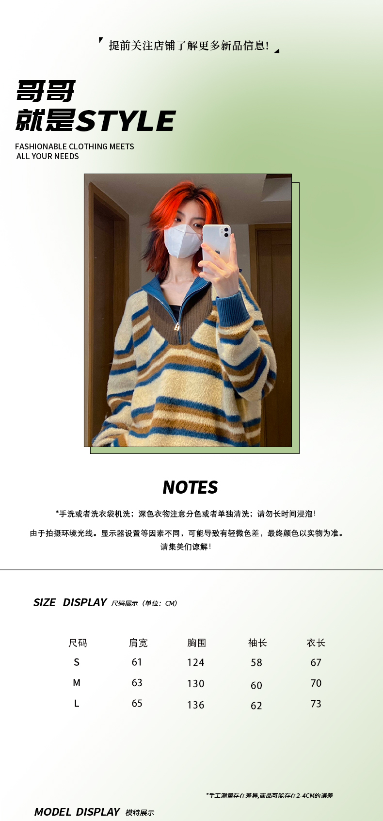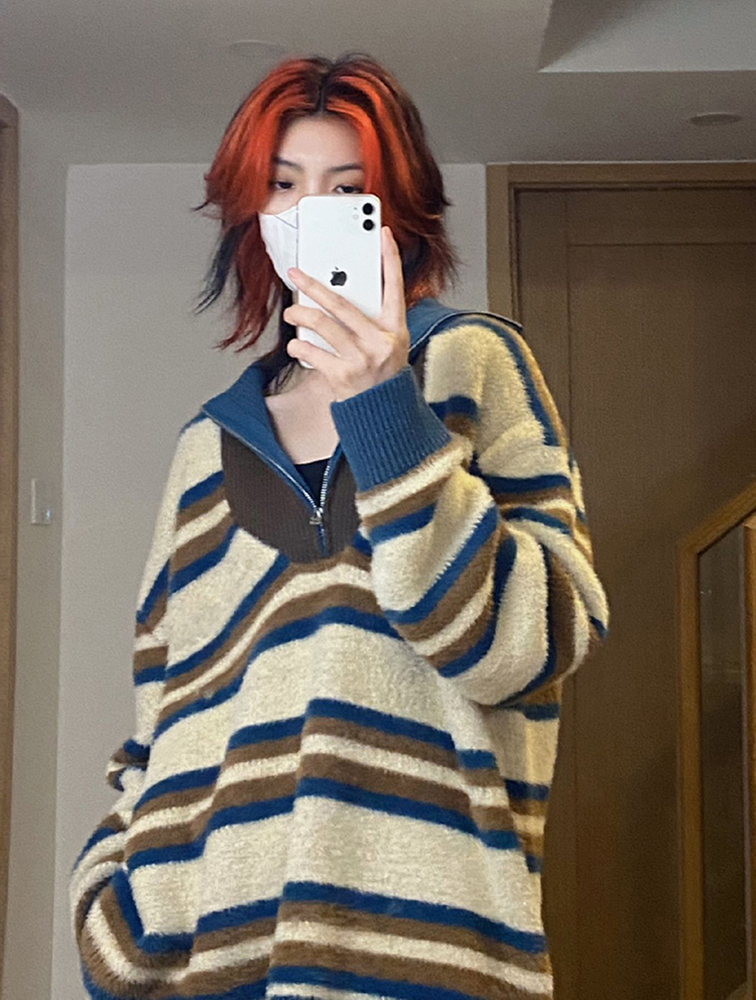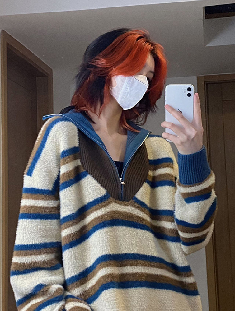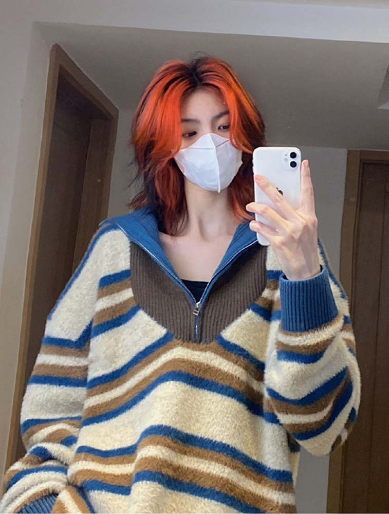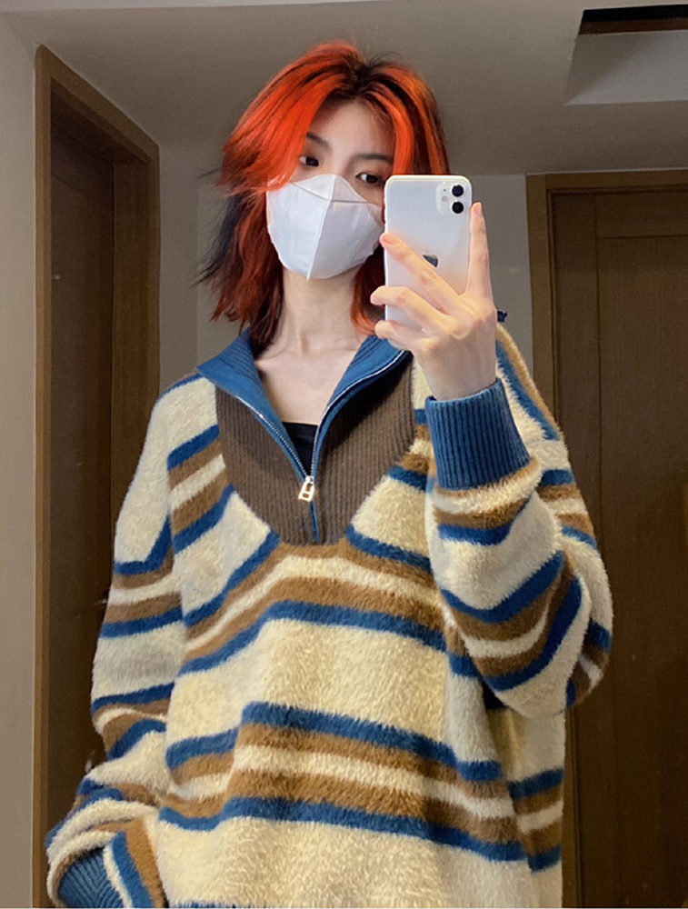 條紋毛衣女秋冬慵懶風復古寬鬆百搭半拉鍊高領套頭拼接針織衫上衣