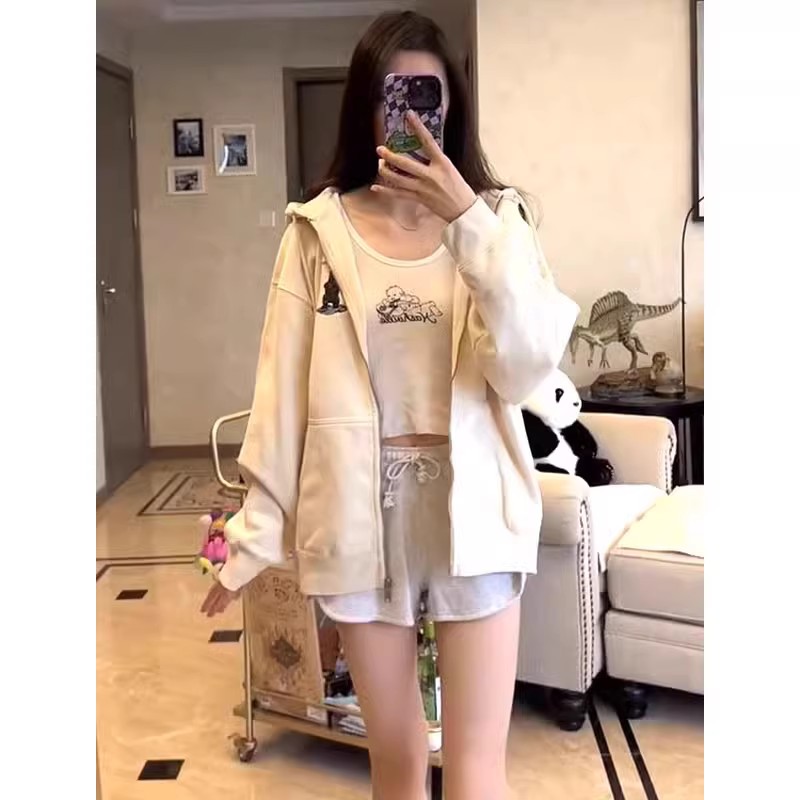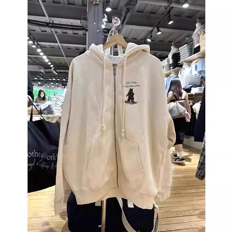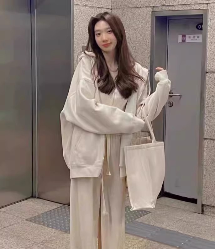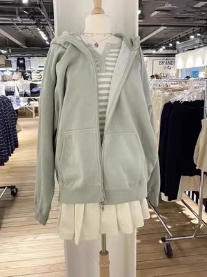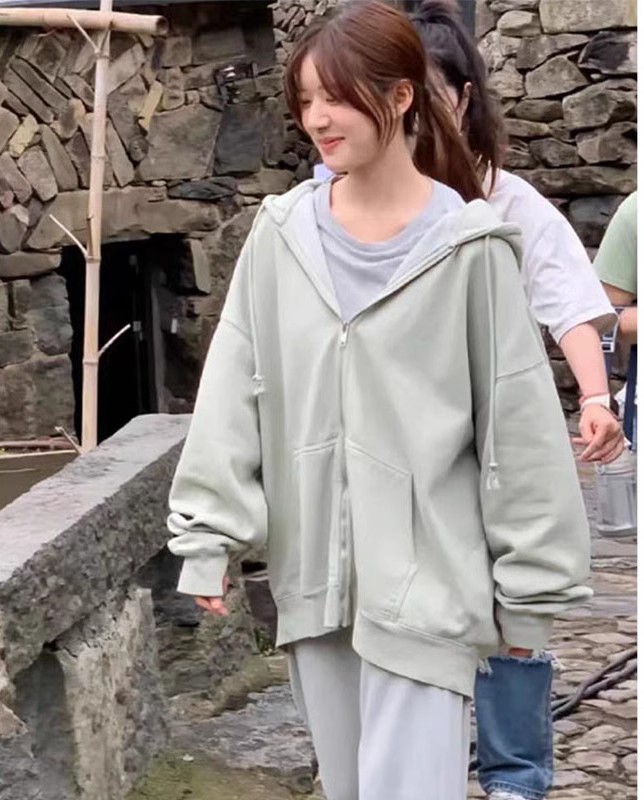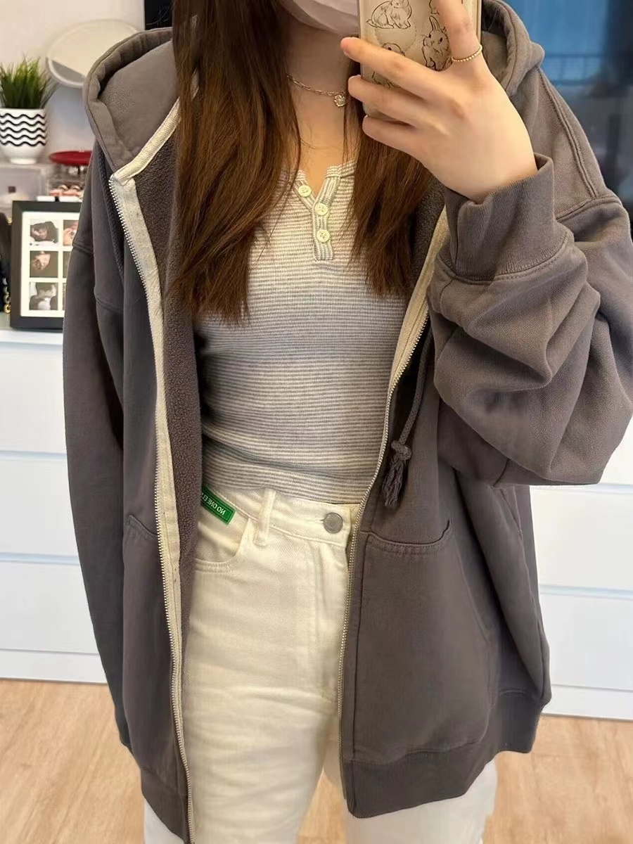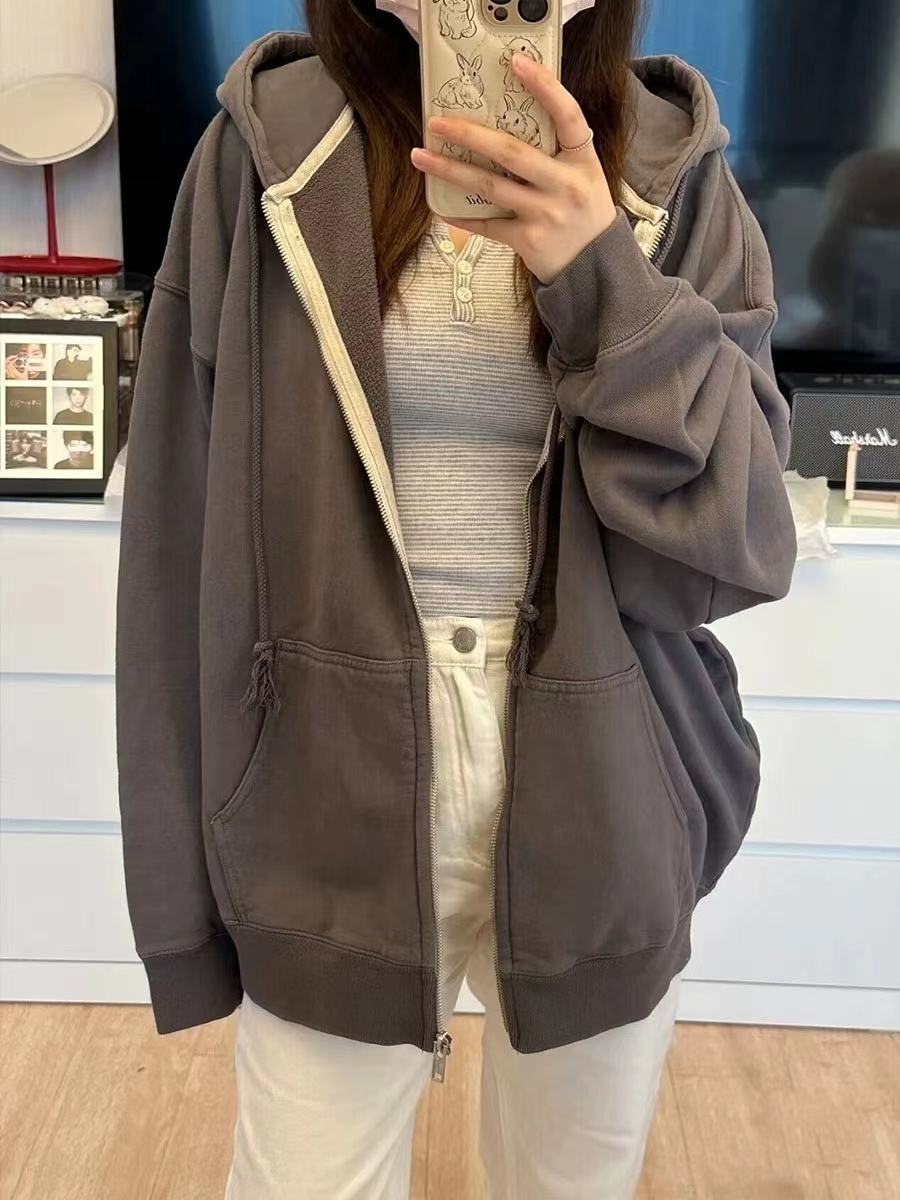 秋冬新款純色開衫連帽運動衫女bm寬鬆百搭慵懶風碳灰色復古拉鍊外套