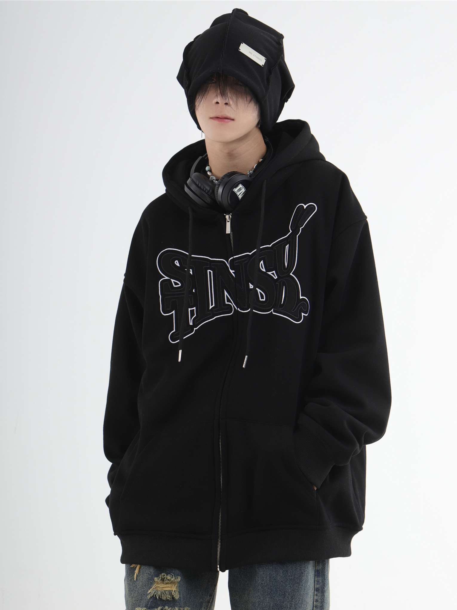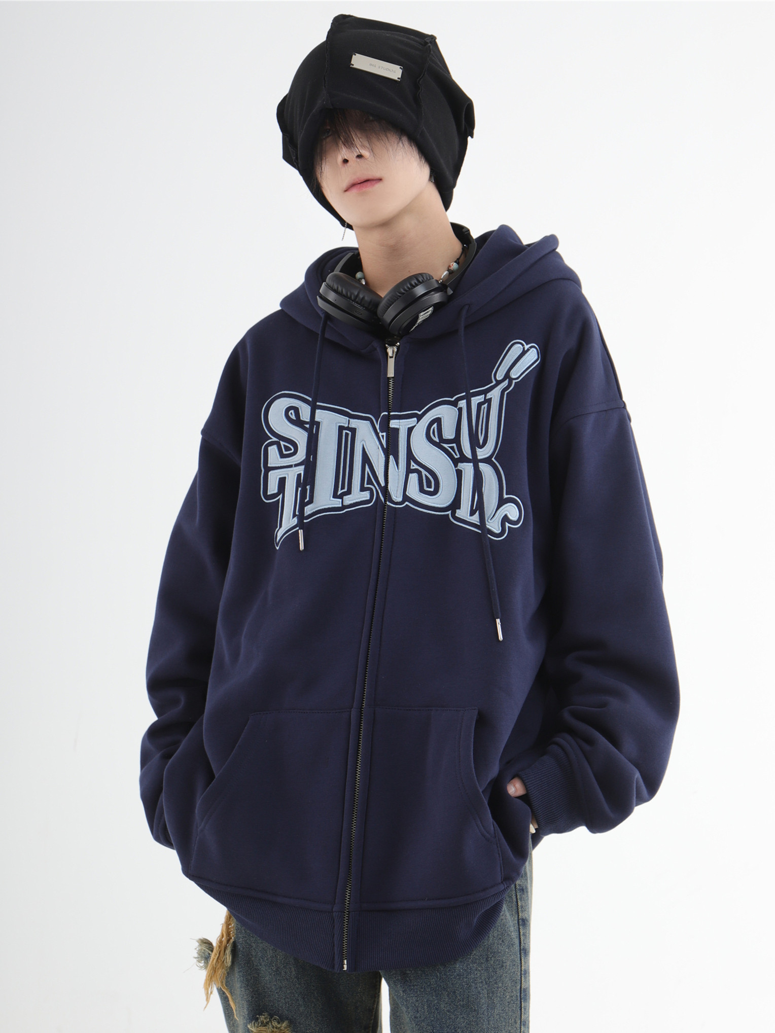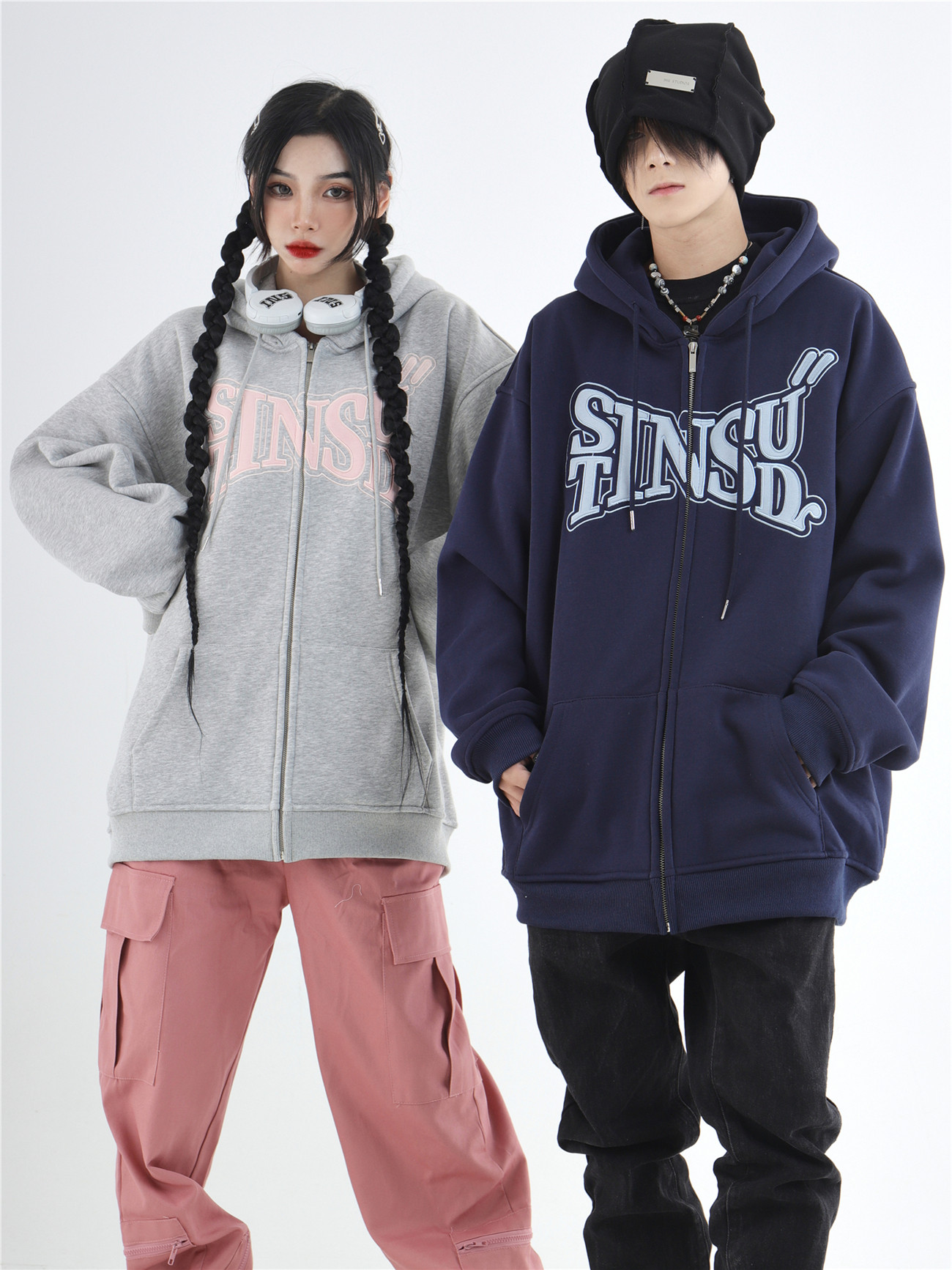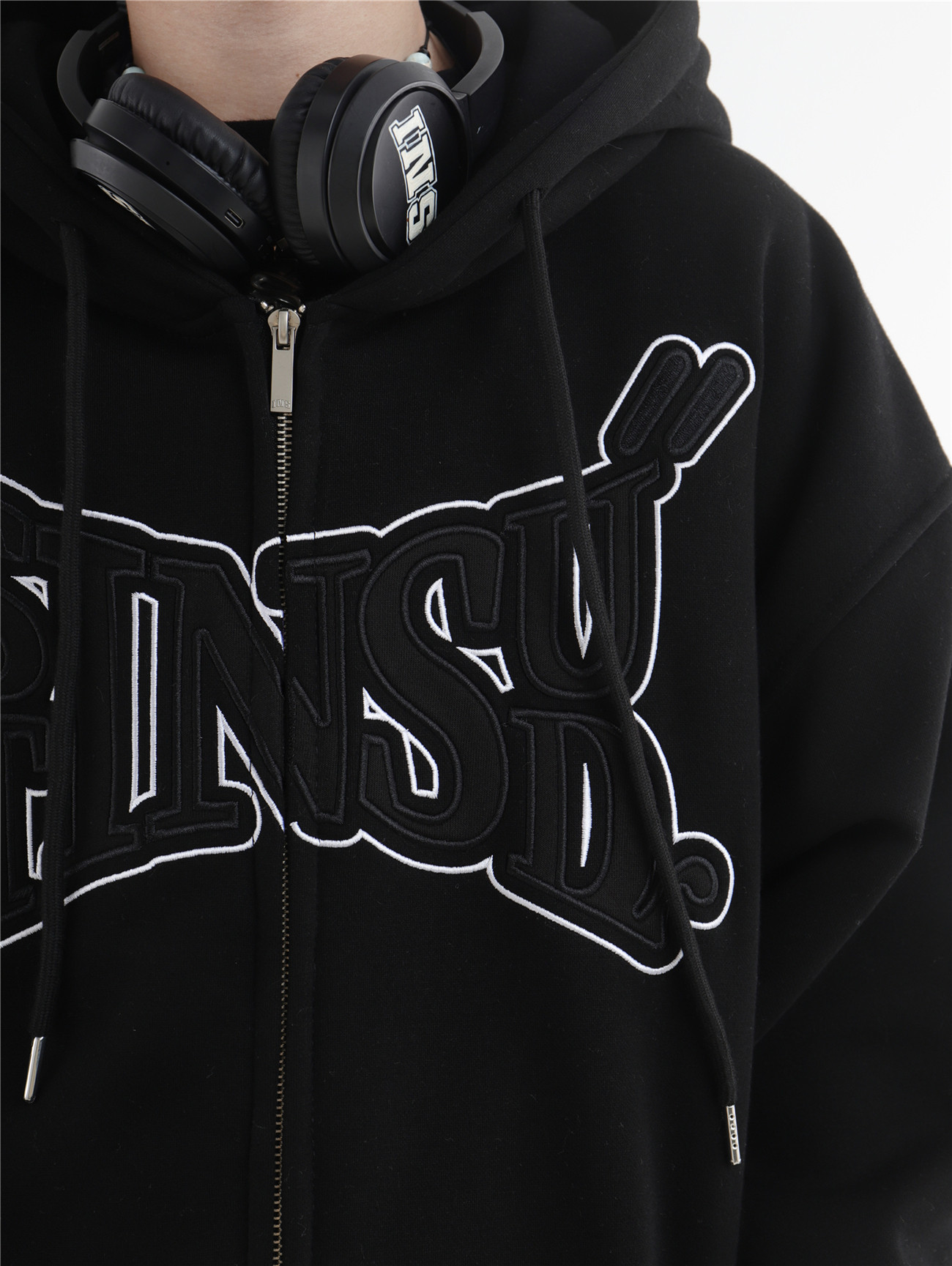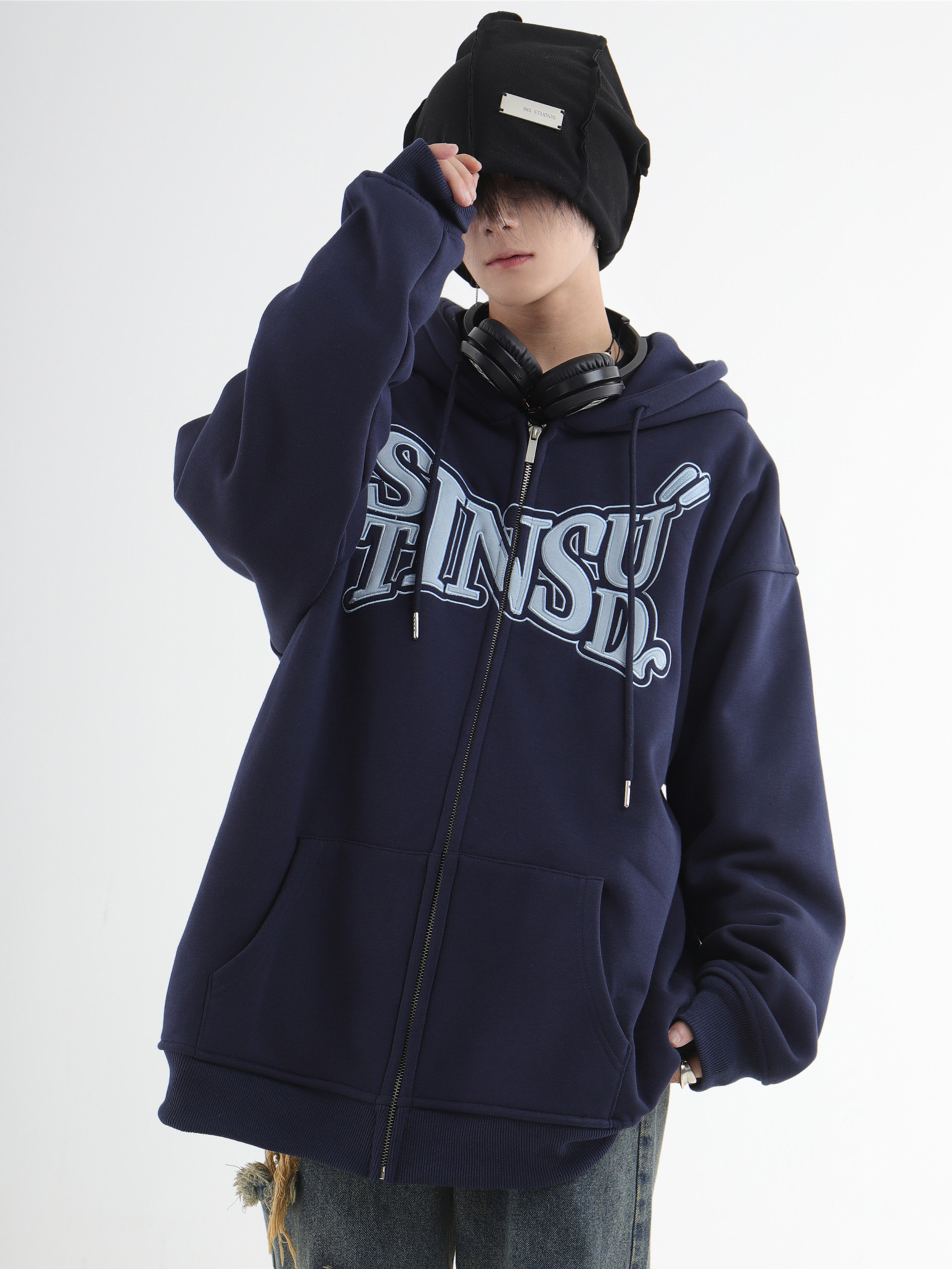 INSstudios 國潮牌情侶美式布貼繡LOGO開衫連帽運動衫加絨拉鍊外套