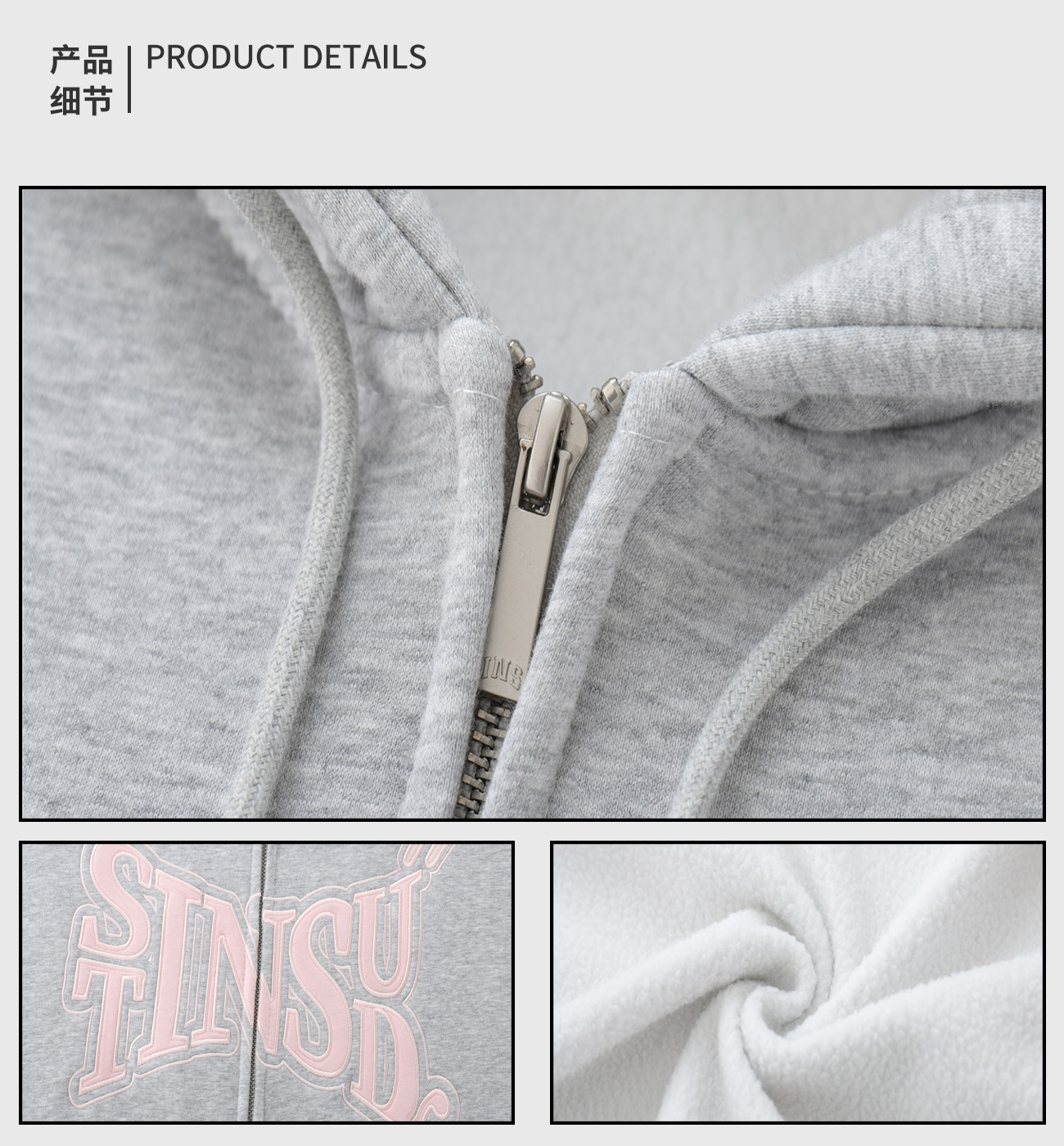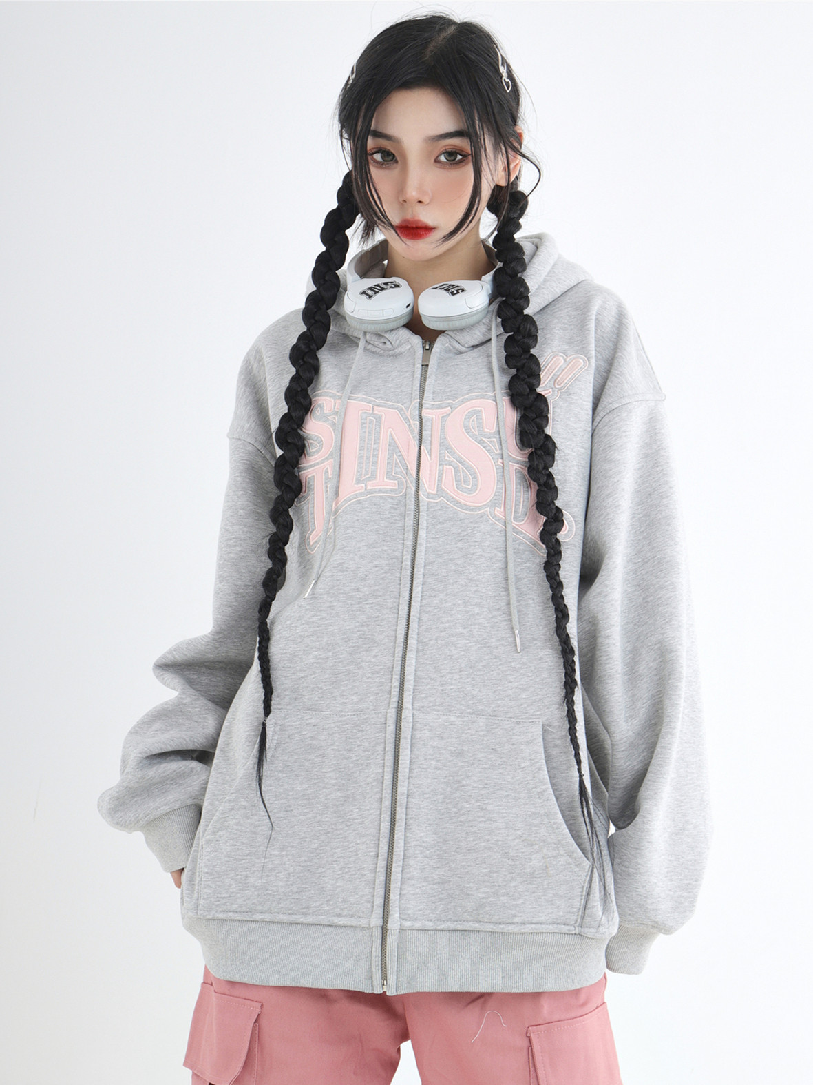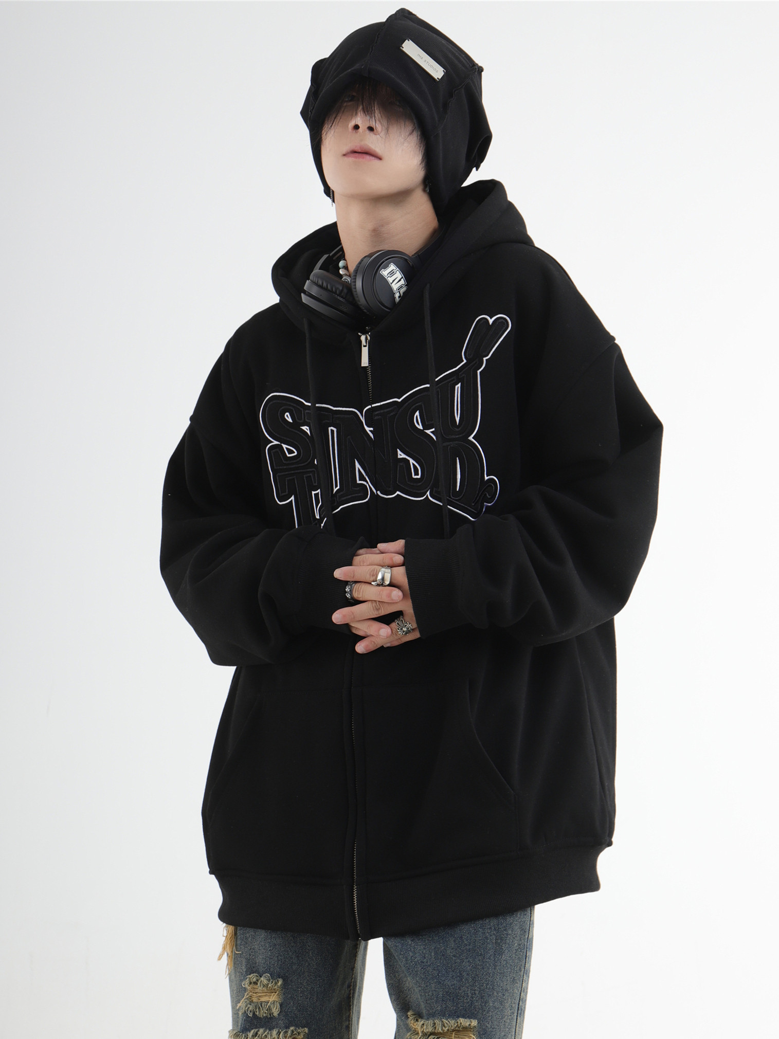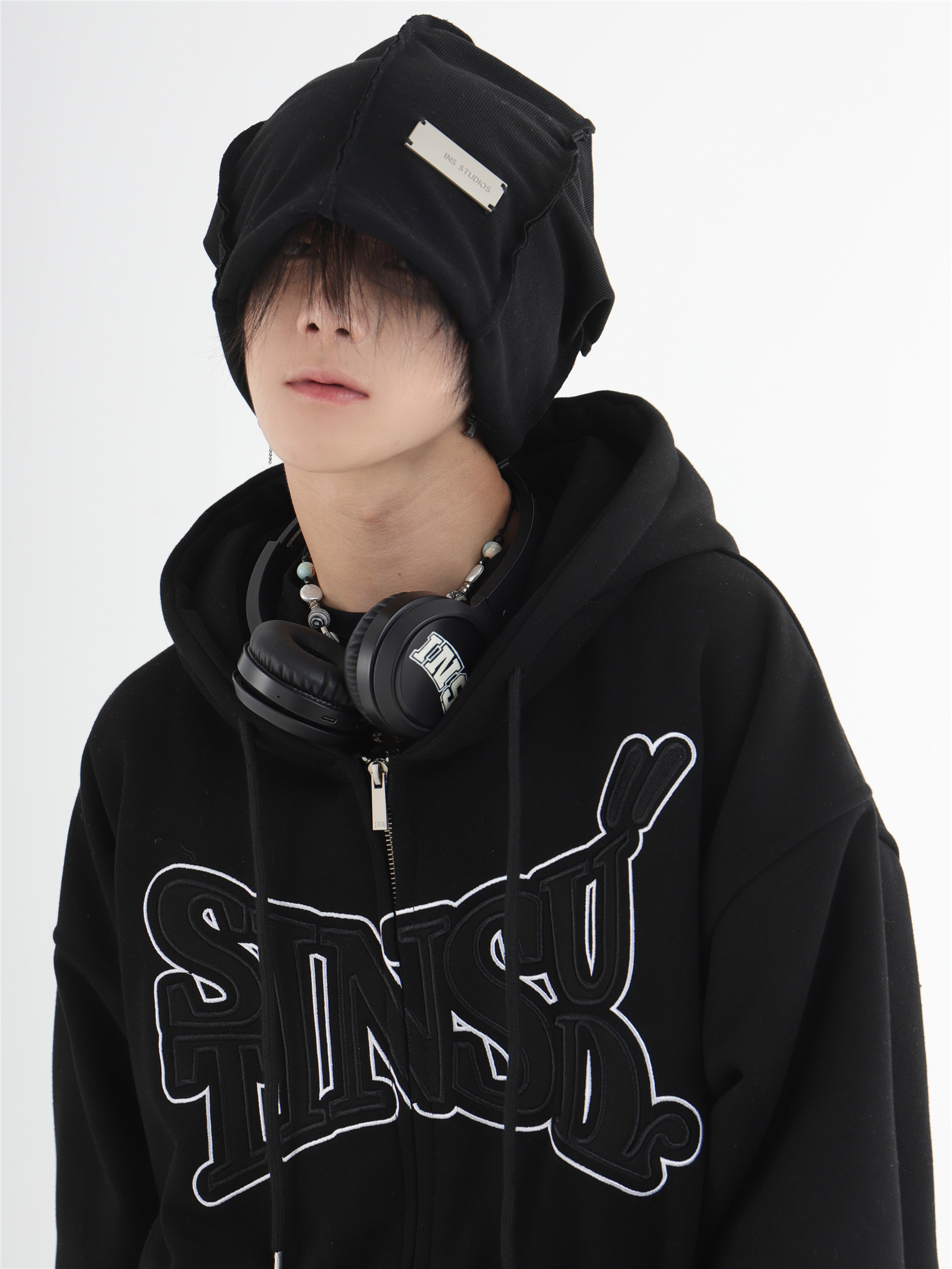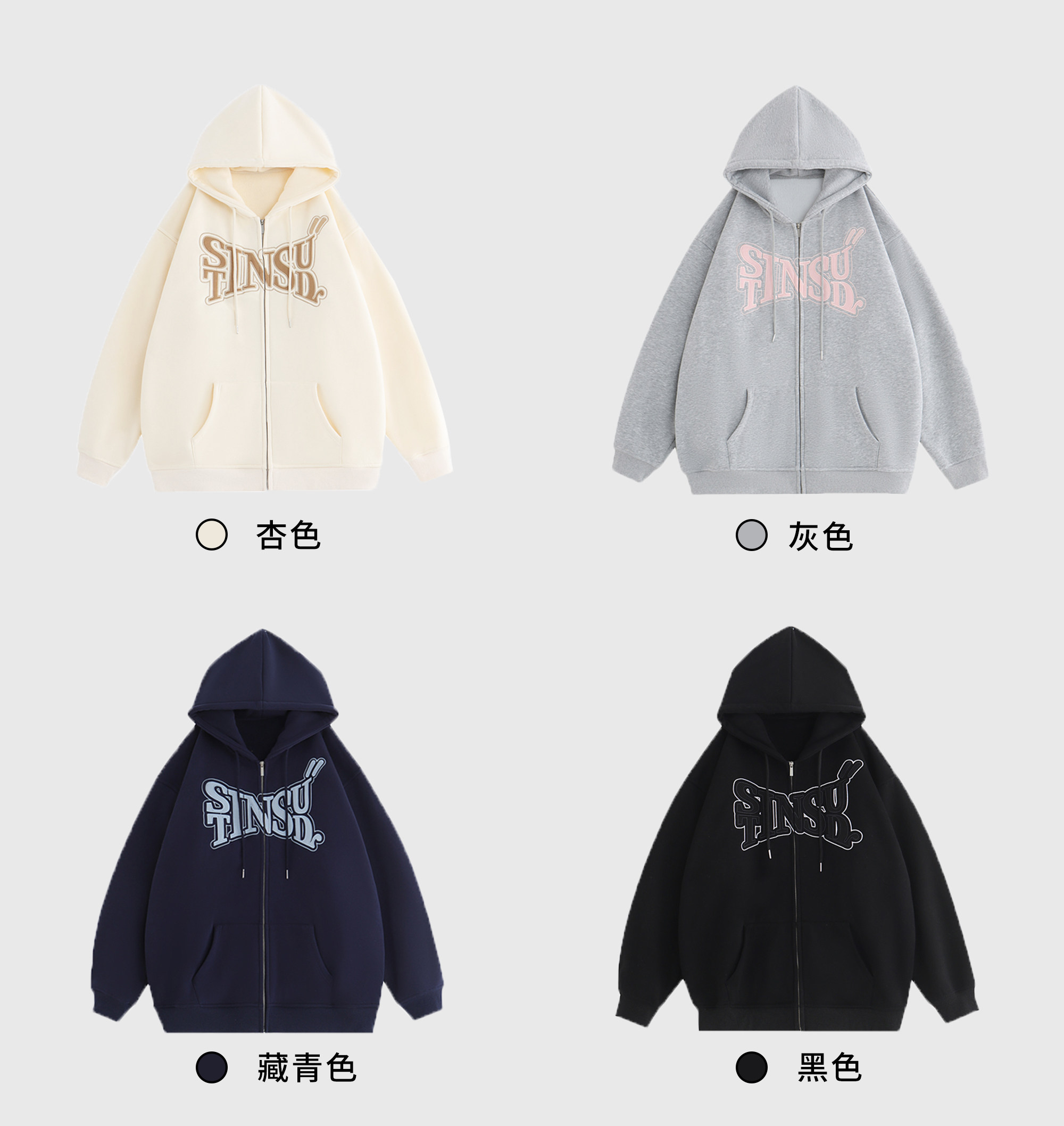 INSstudios 國潮牌情侶美式布貼繡LOGO開衫連帽運動衫加絨拉鍊外套