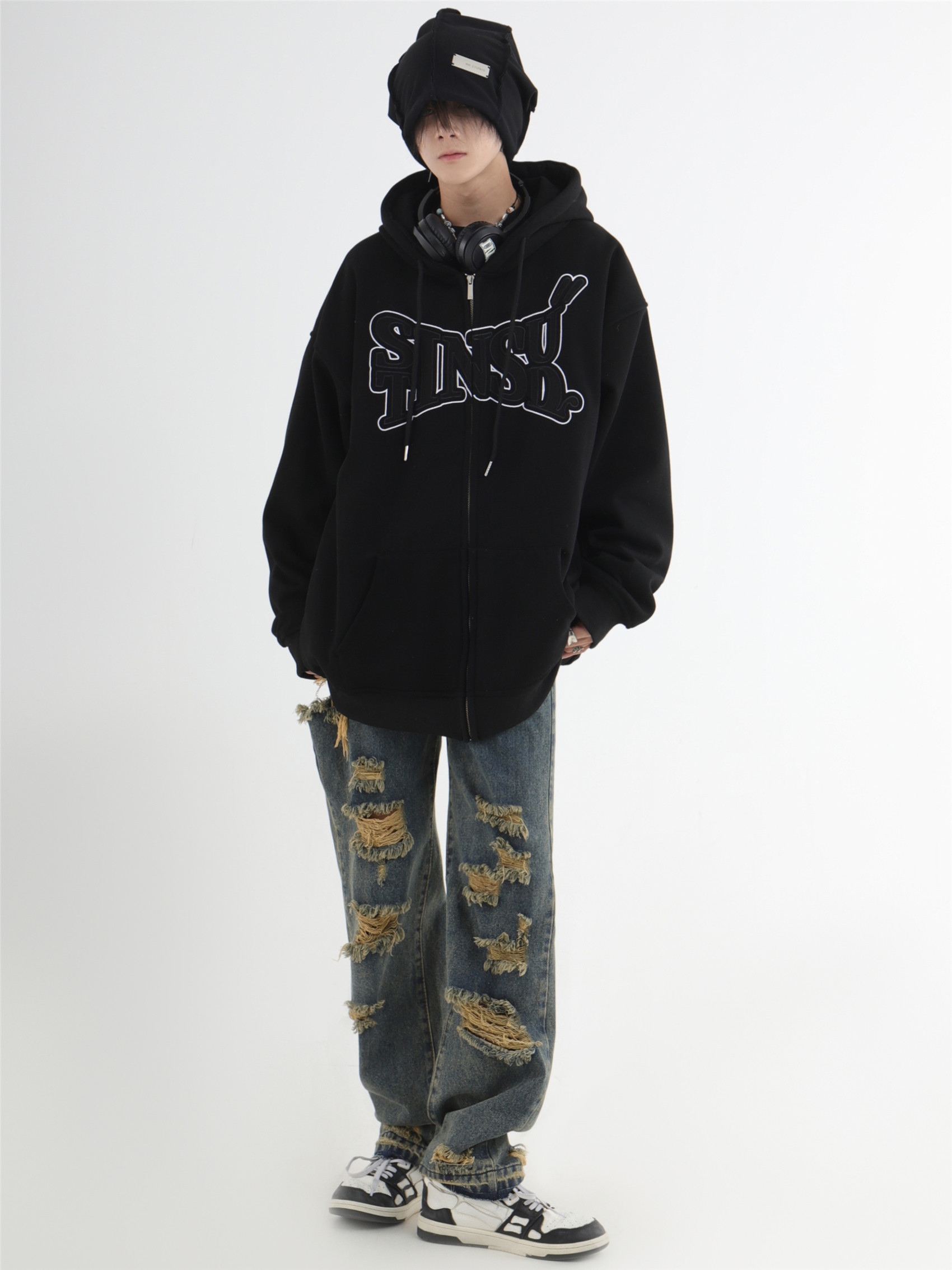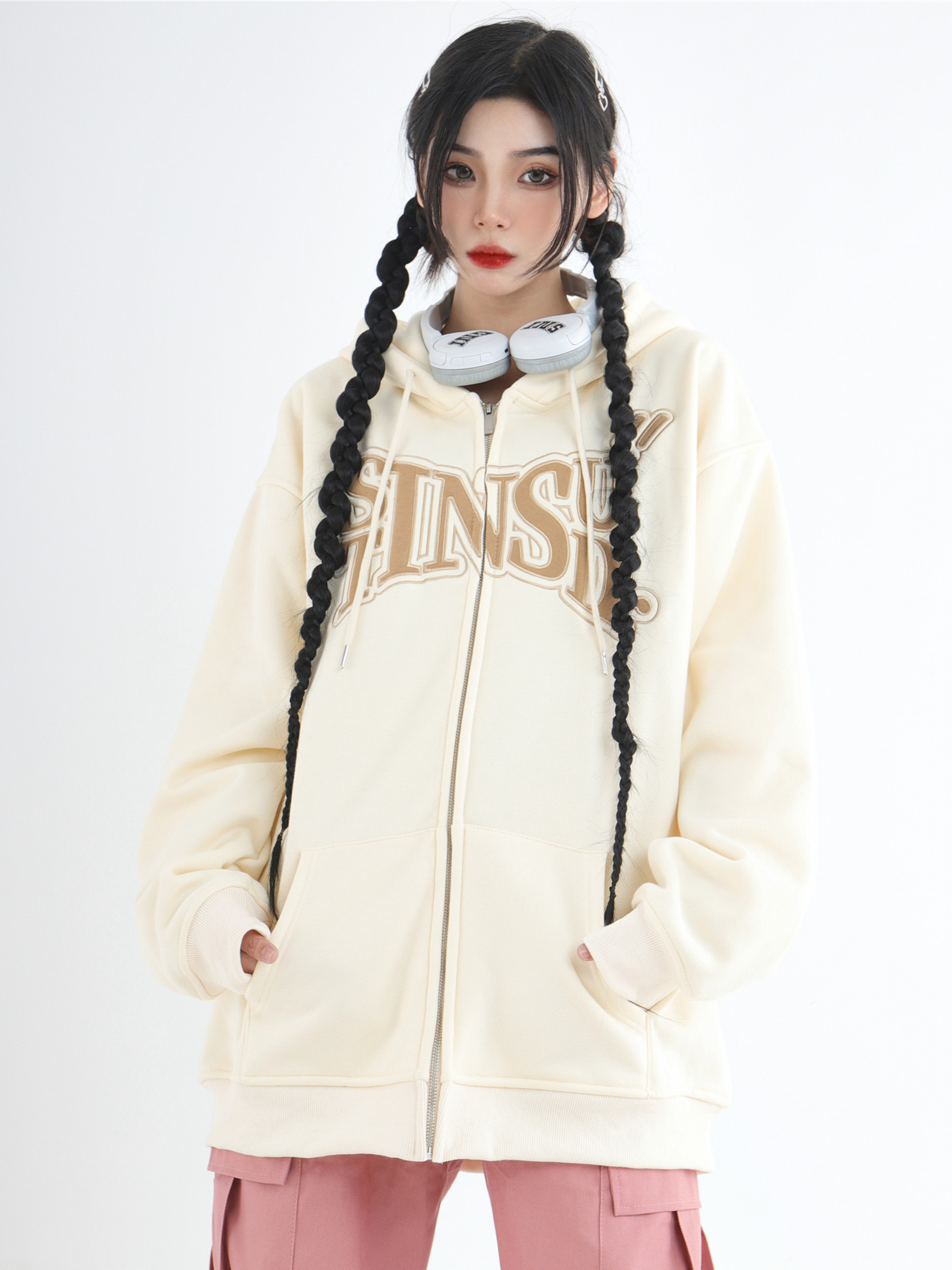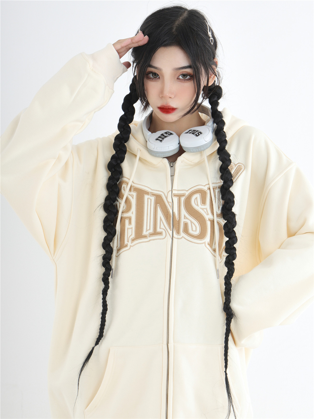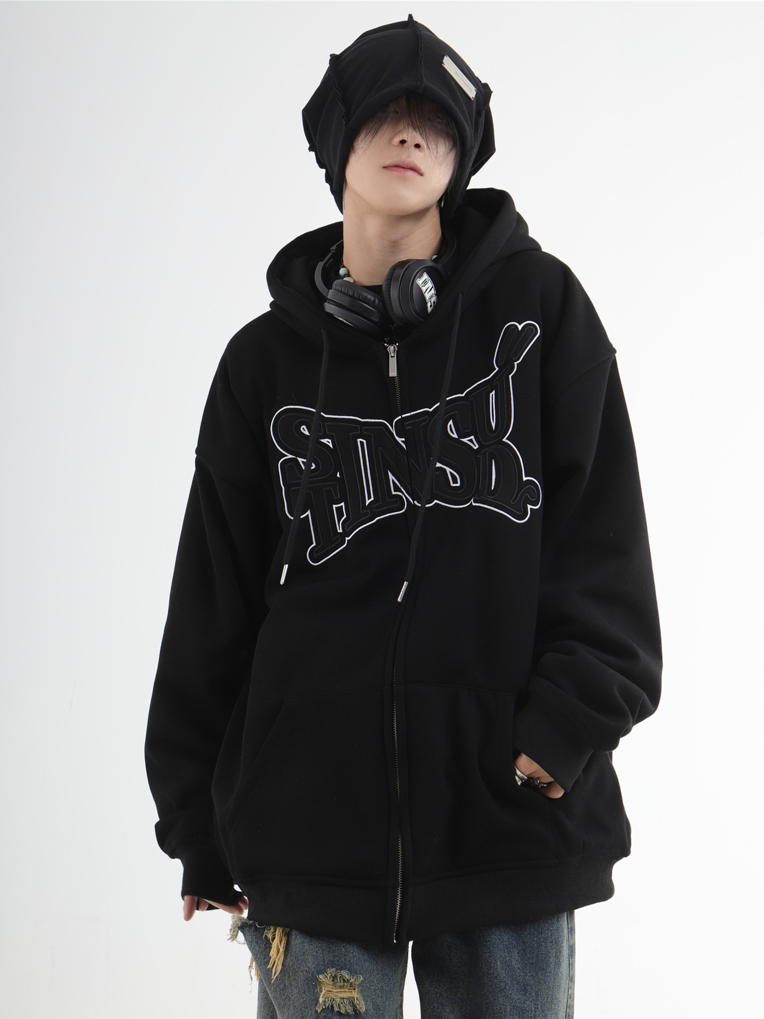 INSstudios 國潮牌情侶美式布貼繡LOGO開衫連帽運動衫加絨拉鍊外套