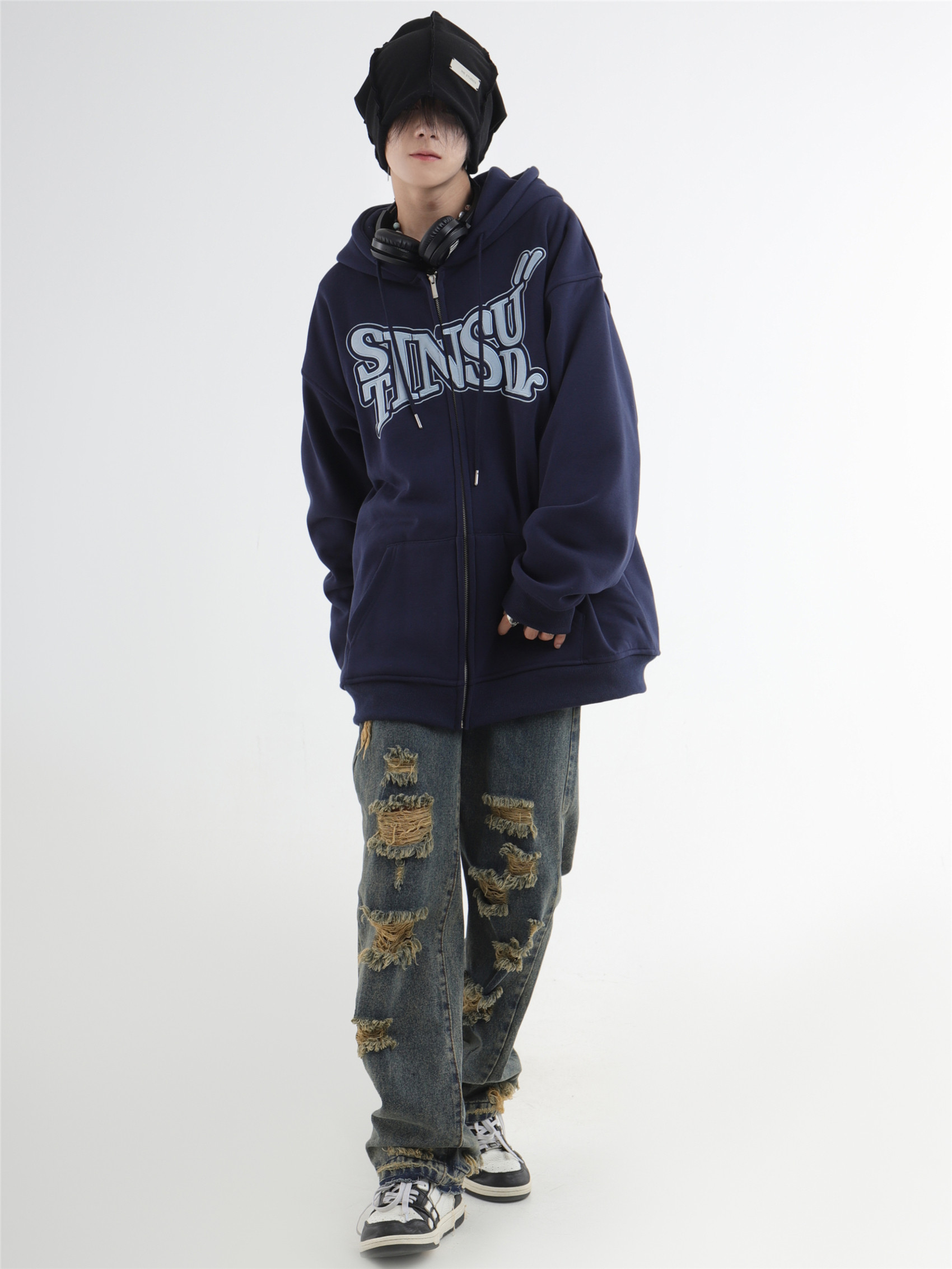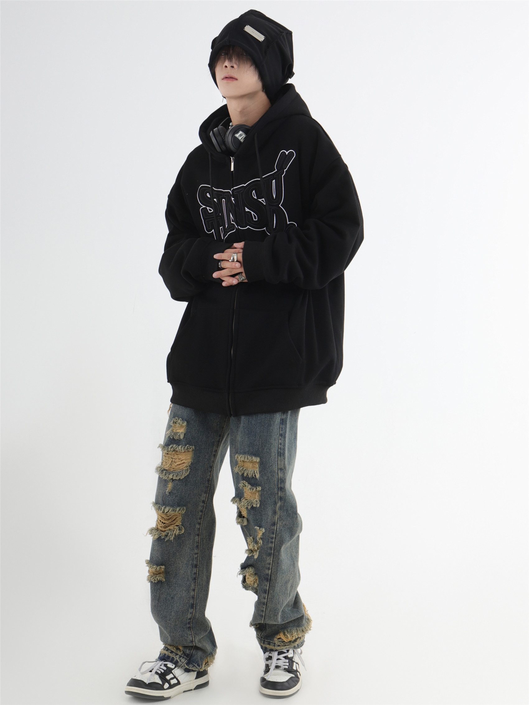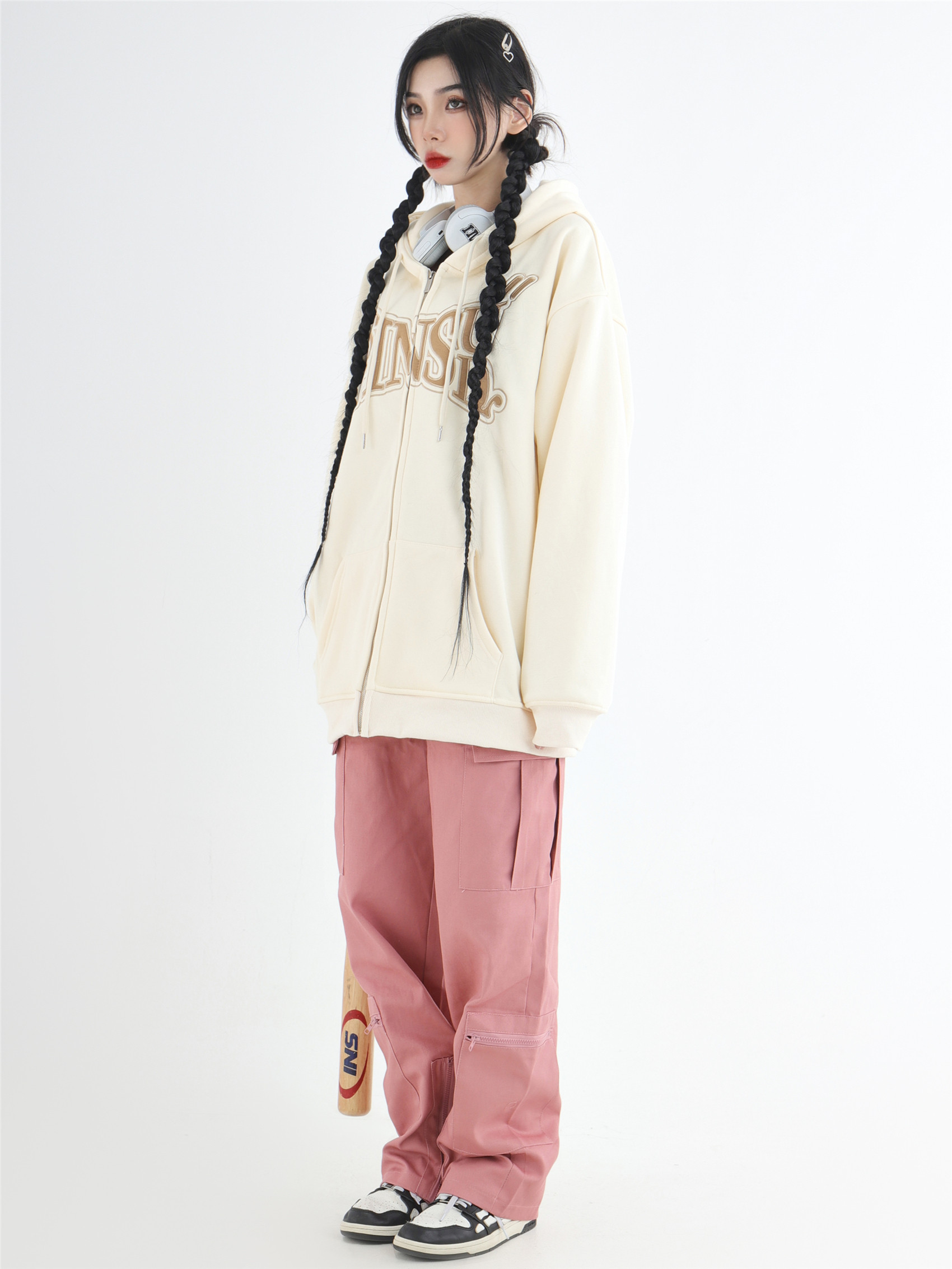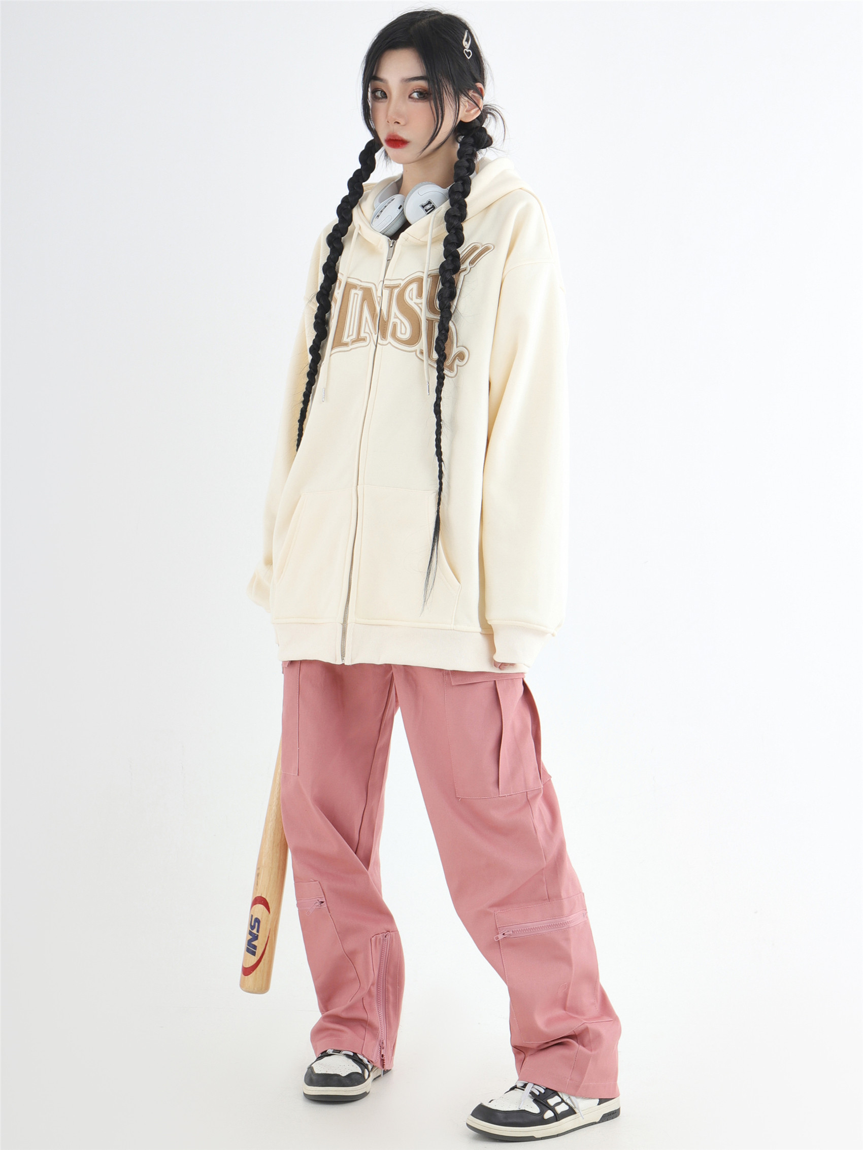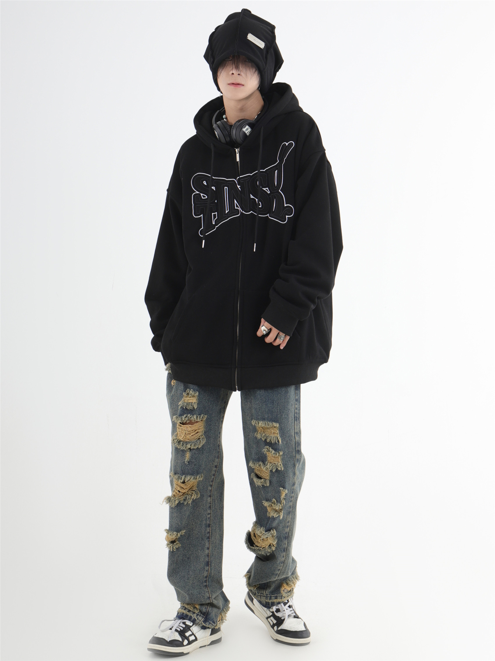 INSstudios 國潮牌情侶美式布貼繡LOGO開衫連帽運動衫加絨拉鍊外套
