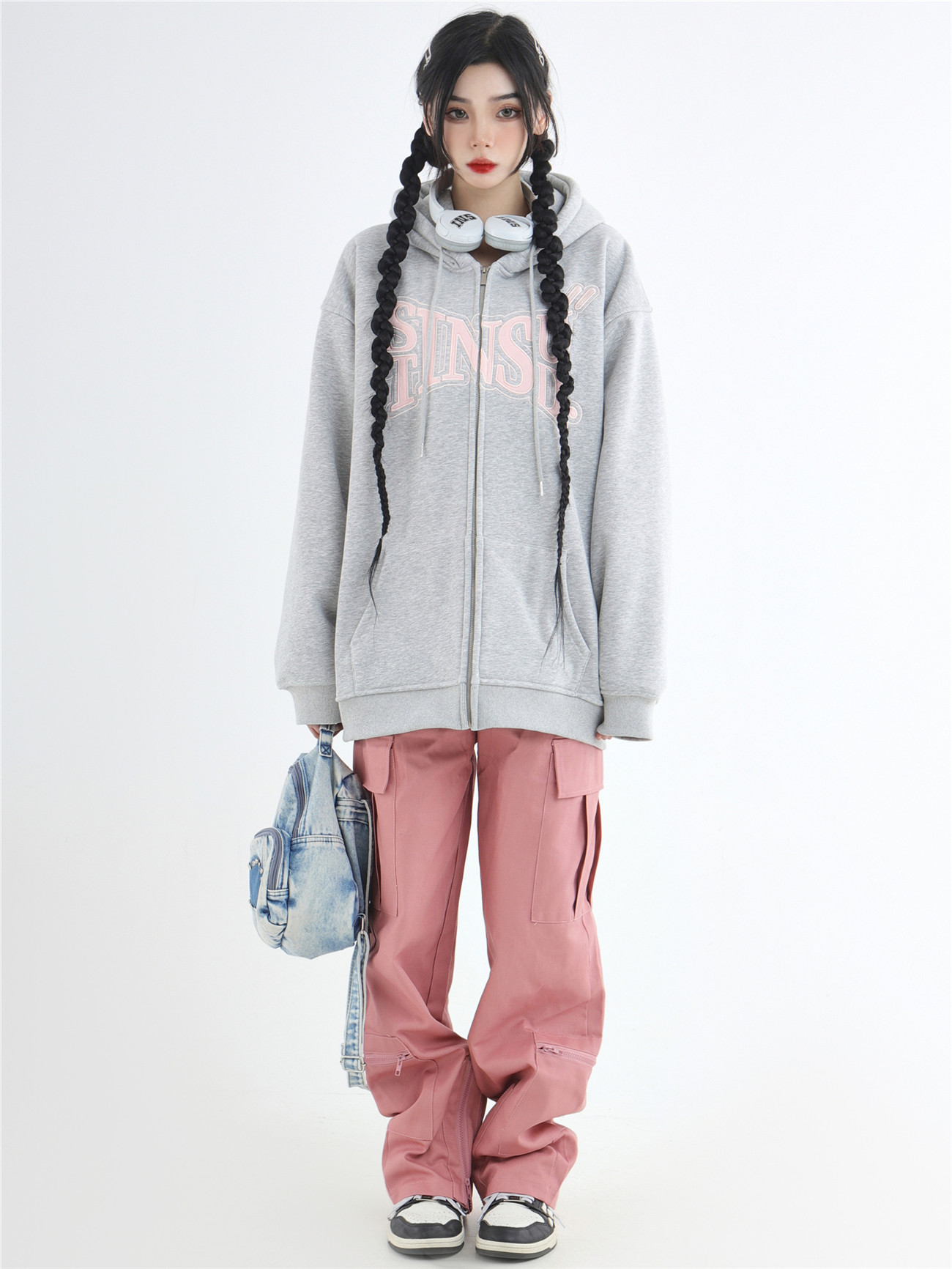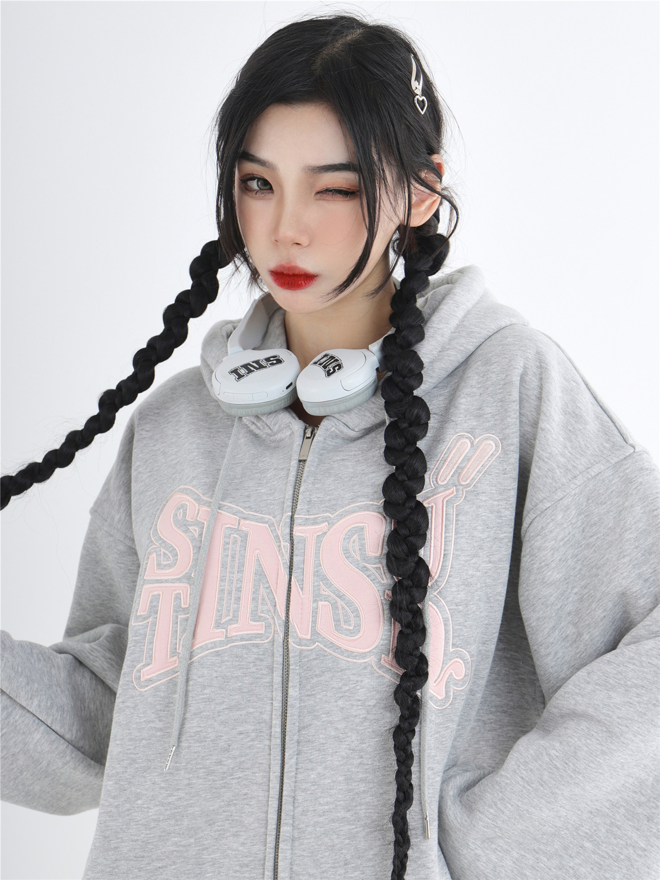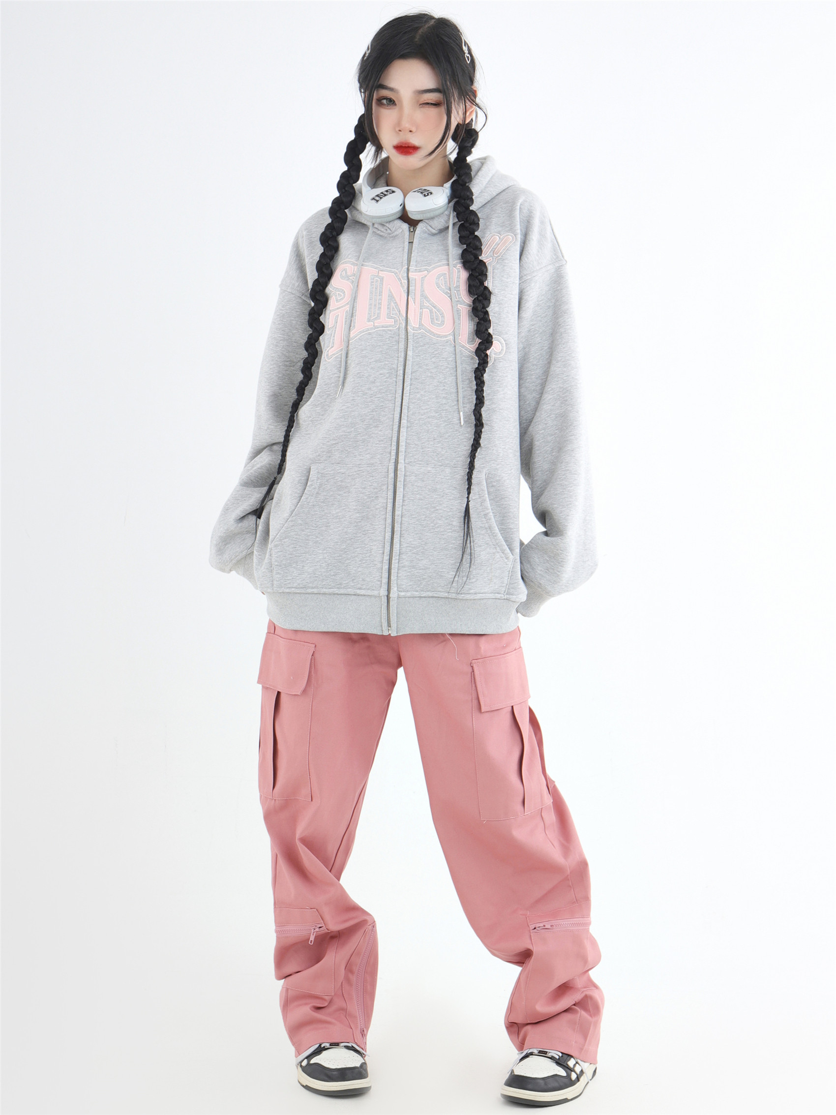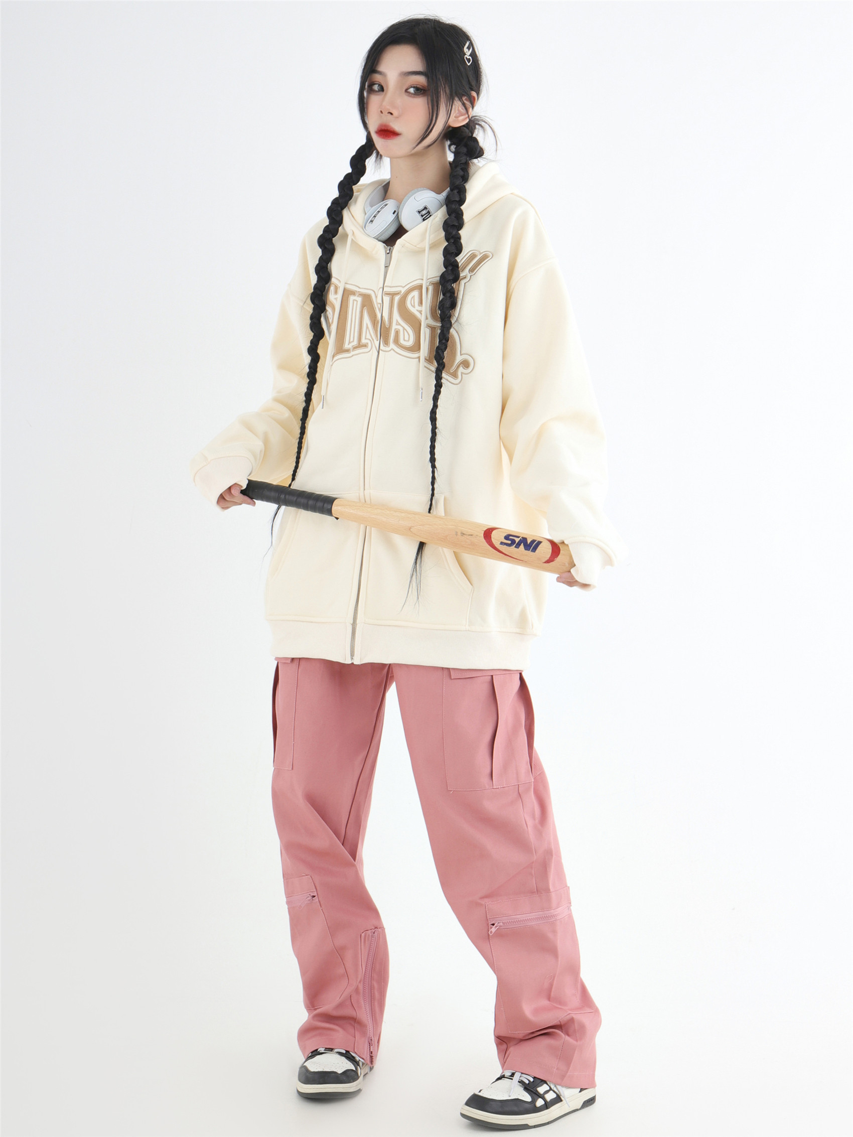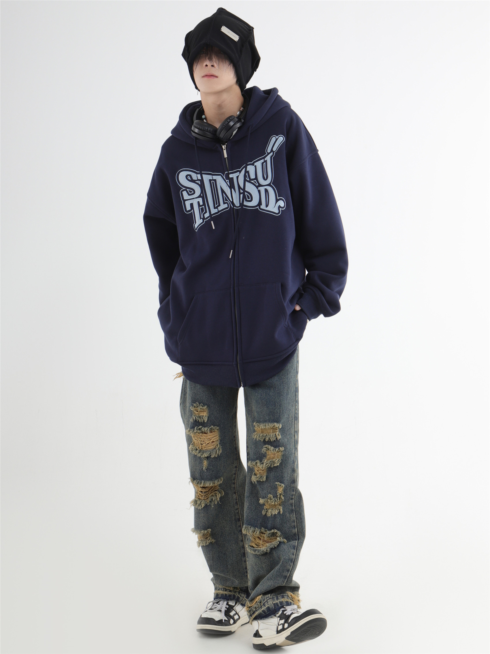 INSstudios 國潮牌情侶美式布貼繡LOGO開衫連帽運動衫加絨拉鍊外套