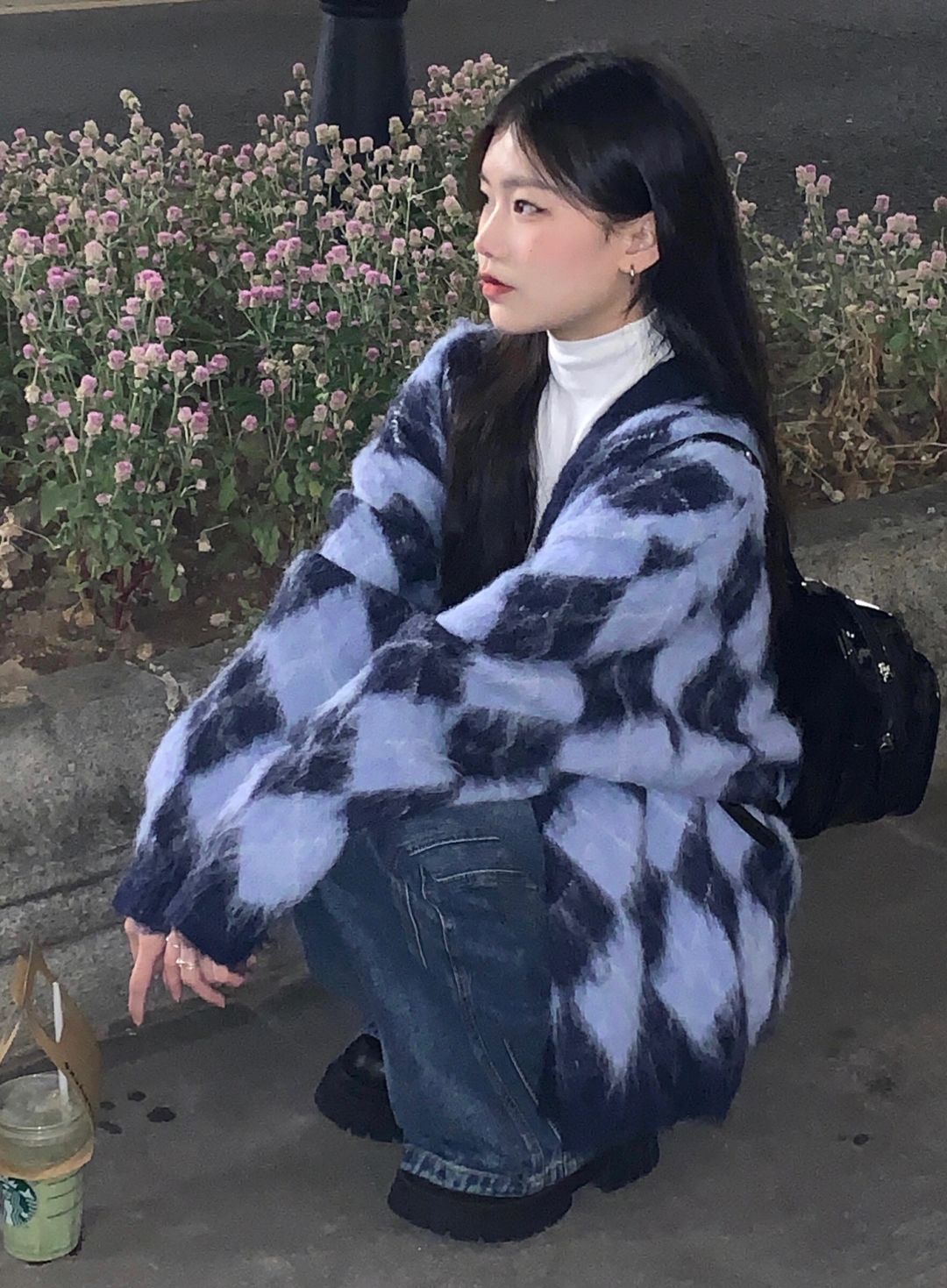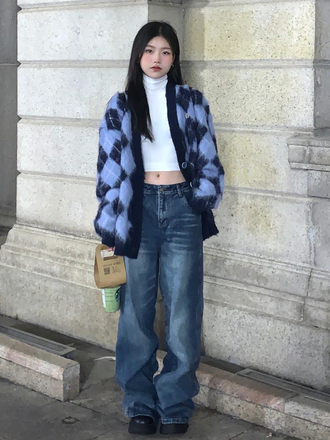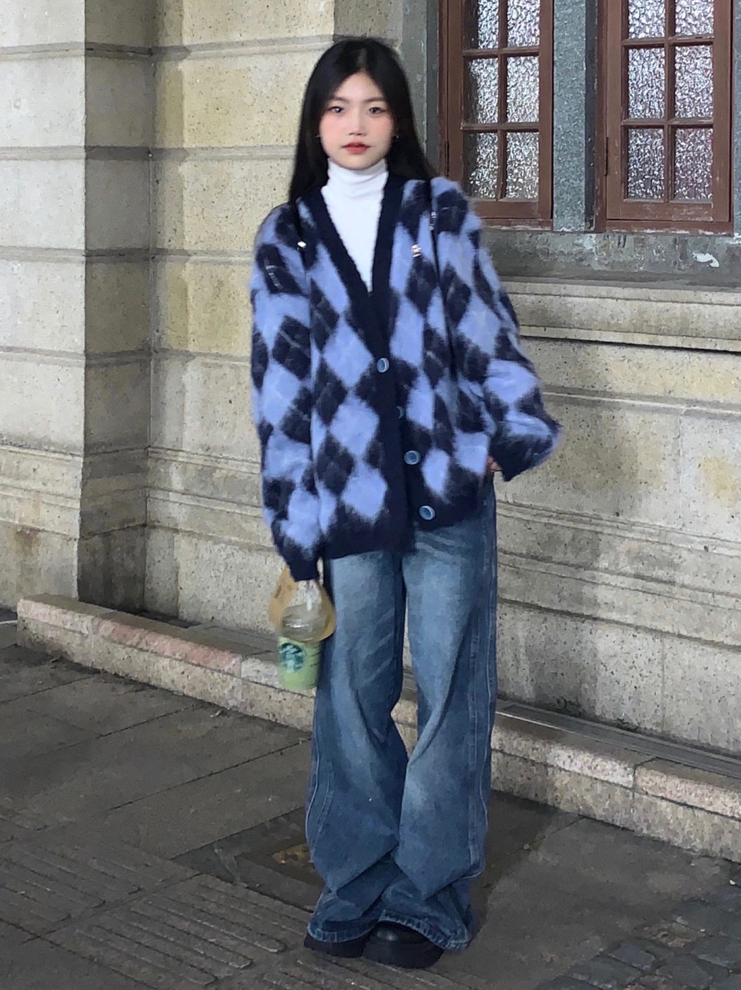 奶系軟糯菱格毛衣女秋冬寬鬆韓版古著慵懶溫柔風V領針織開衫外套
