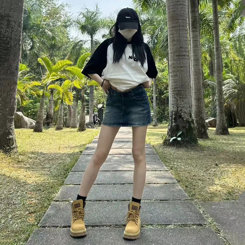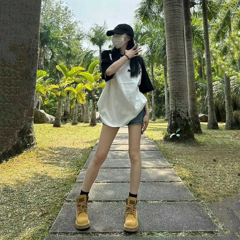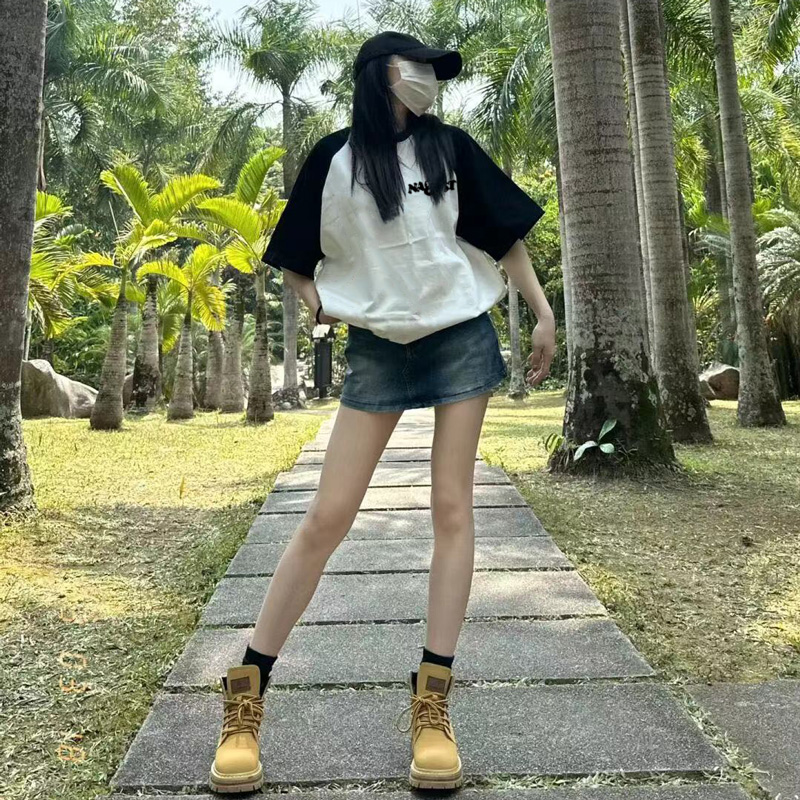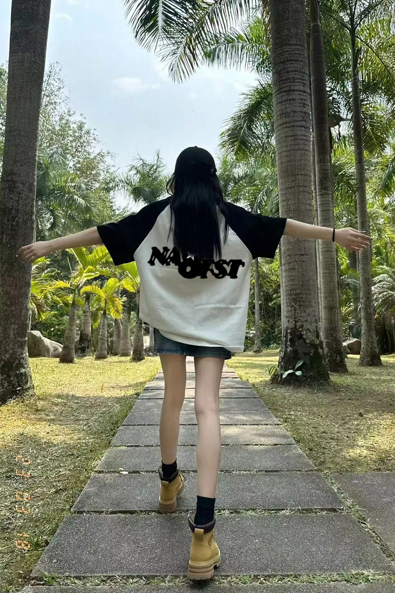 白色黑邊插肩T恤女高中生美式2023新款百分百純棉短袖中性風上衣