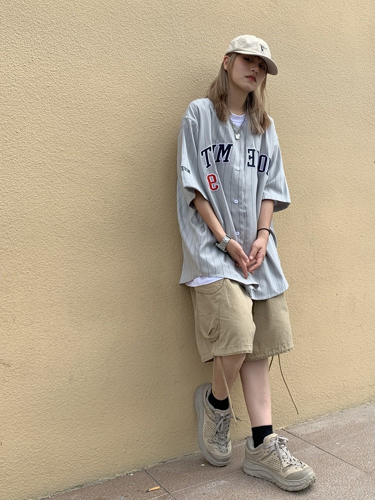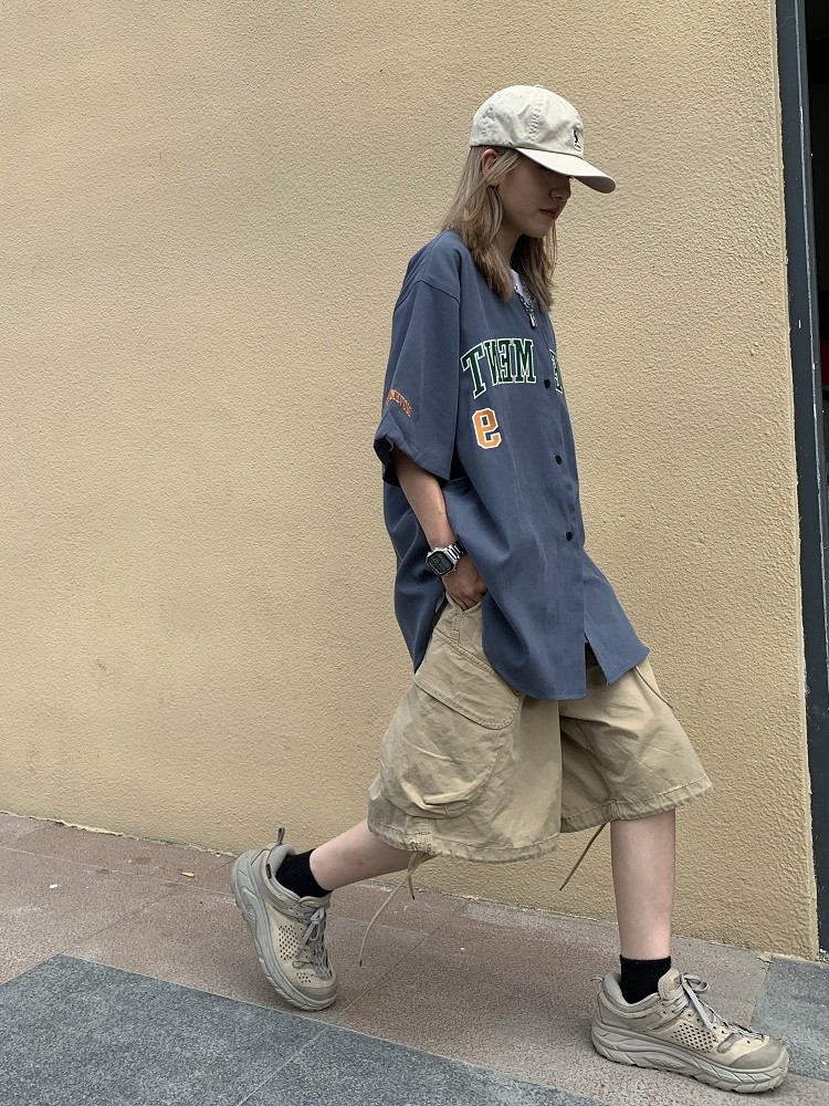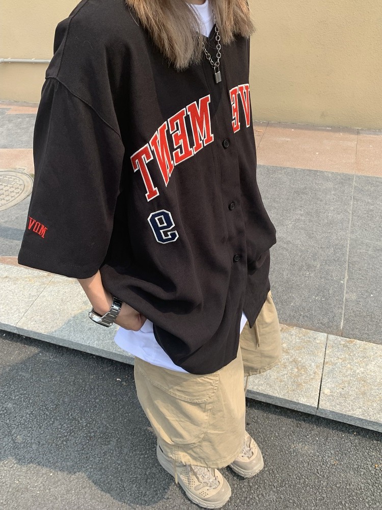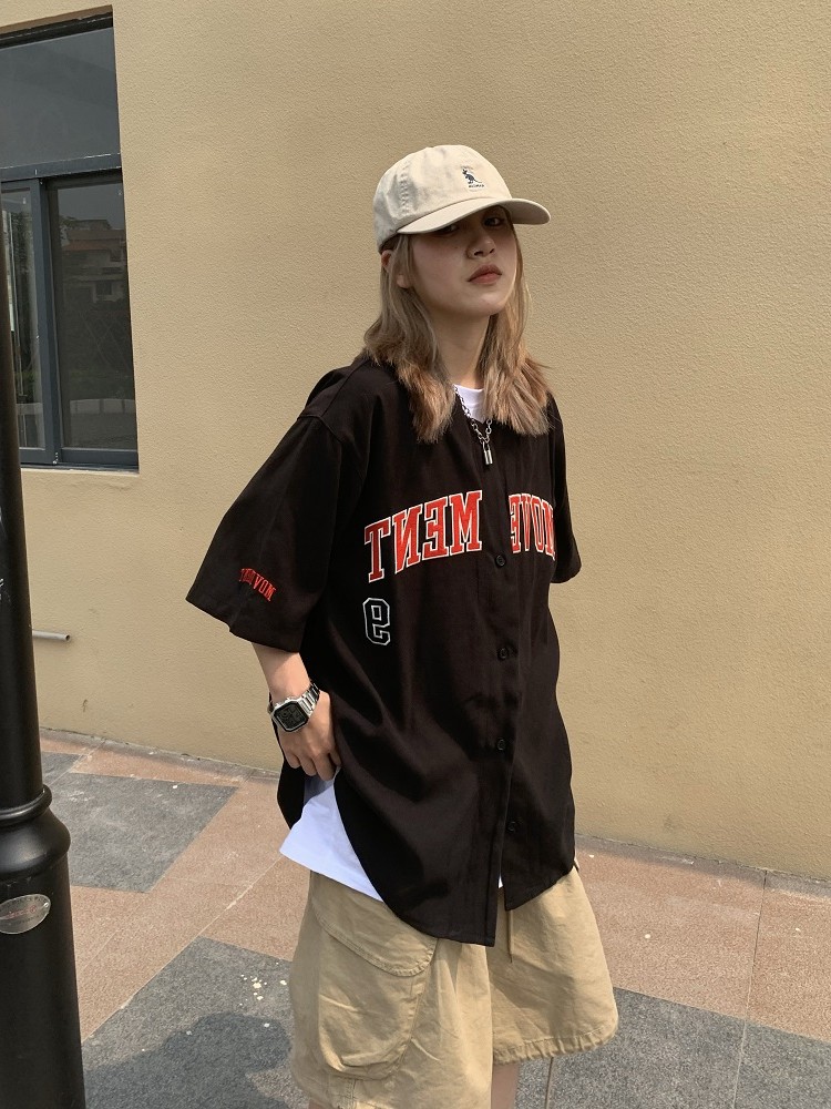 日系街頭美式復古棒球服短袖男女寬鬆嘻哈開衫襯衫上衣ins潮外套