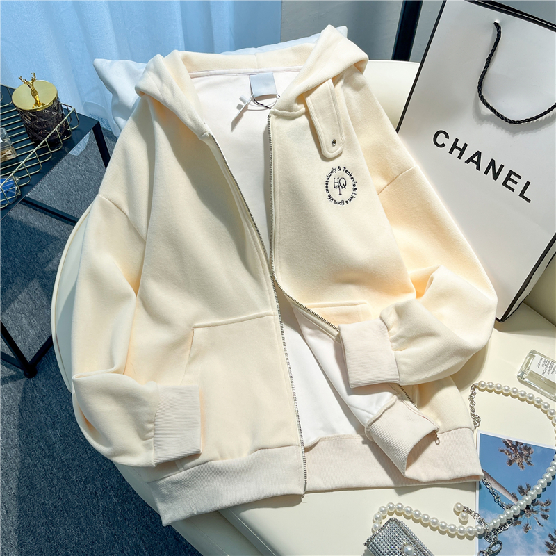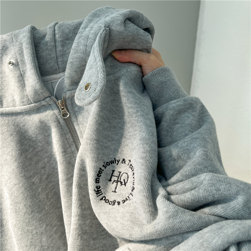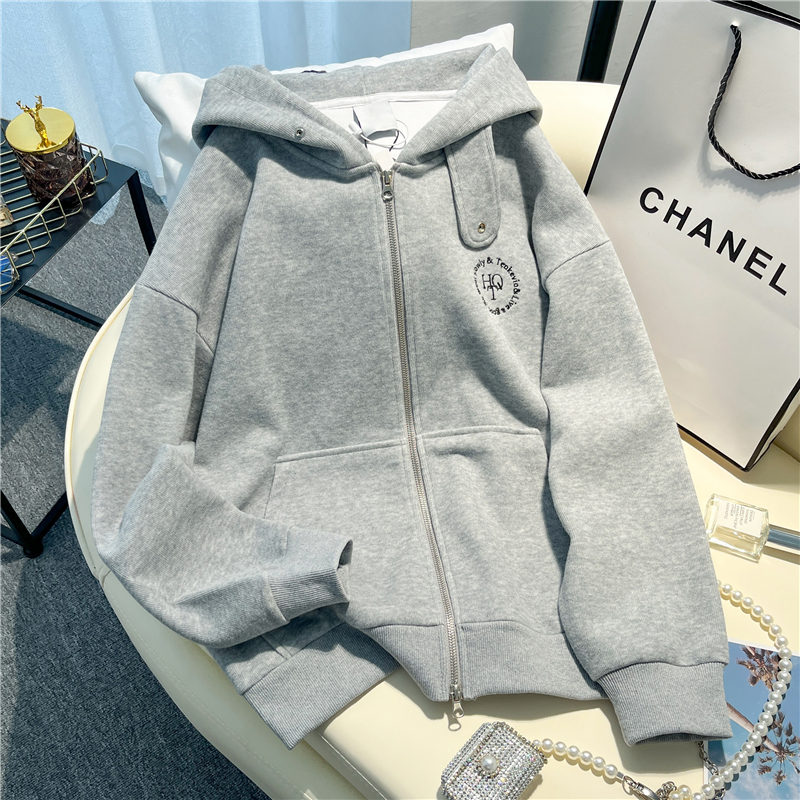 高級感灰色開衫厚棉T2023春秋季薄新款韓版寬鬆慵懶休閒連帽外套女