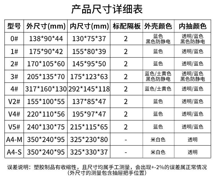 颜色 下拉7种尺寸可选,HS-0#零件盒140*90*45mm,HS-1#零件盒175*90*40mm,HS-V2#零件盒155*100*55mm,HS-2#零件盒155*110*60mm,HS-V3#零件盒185*135*70mm,HS-4#零件盒315*160*130mm,HS-V4零件盒220*110*50mm,HS-V5零件盒240*120*75mm