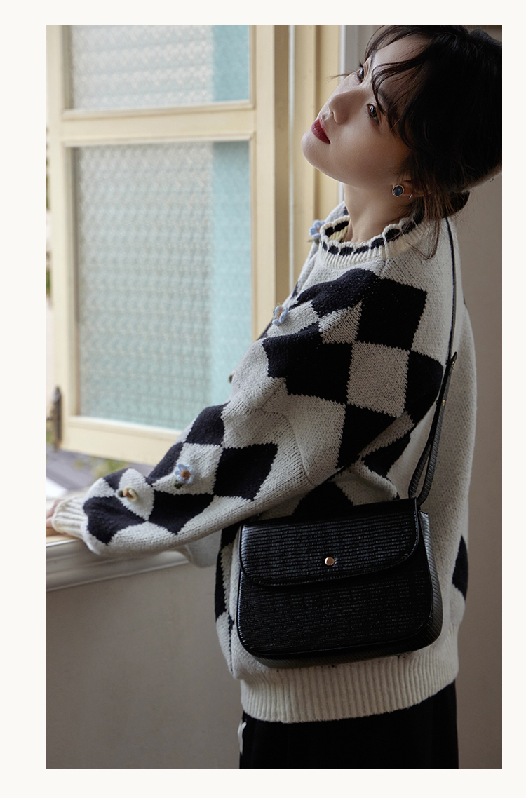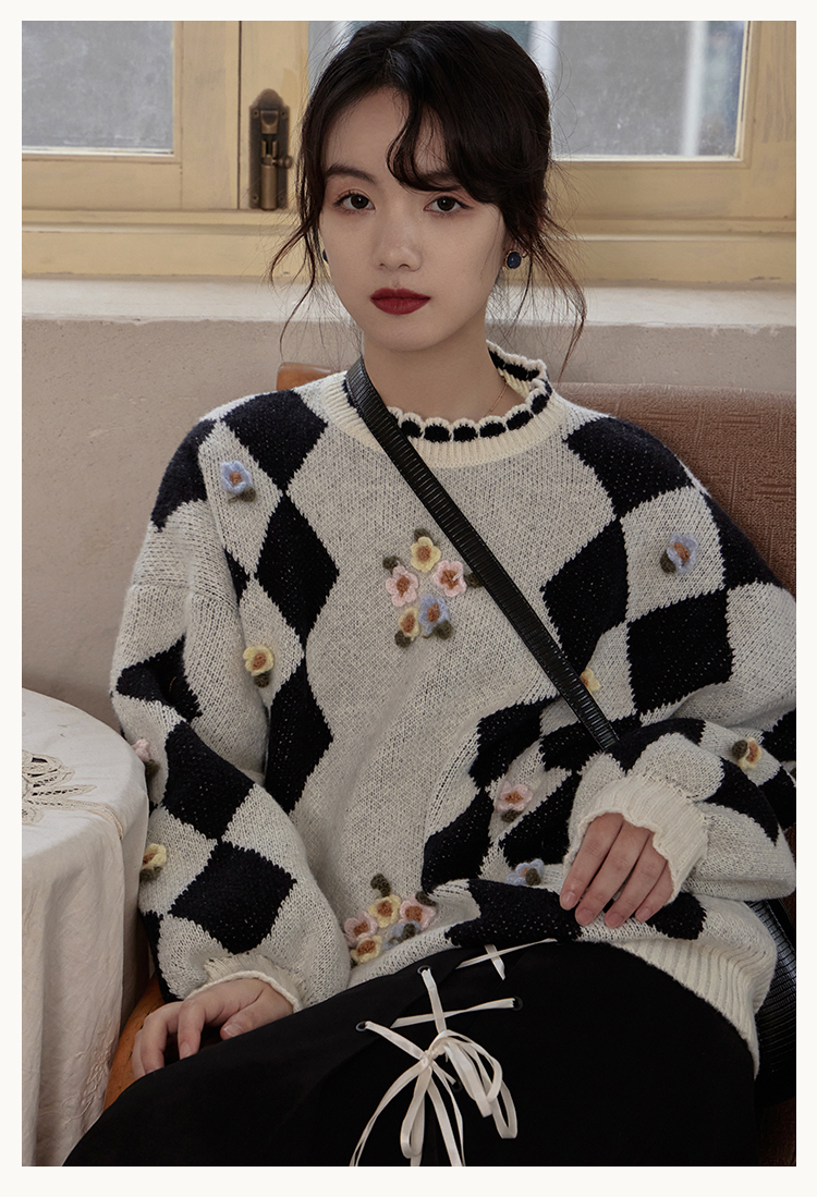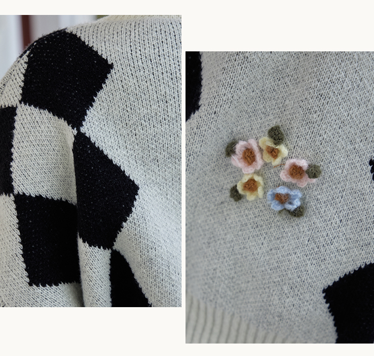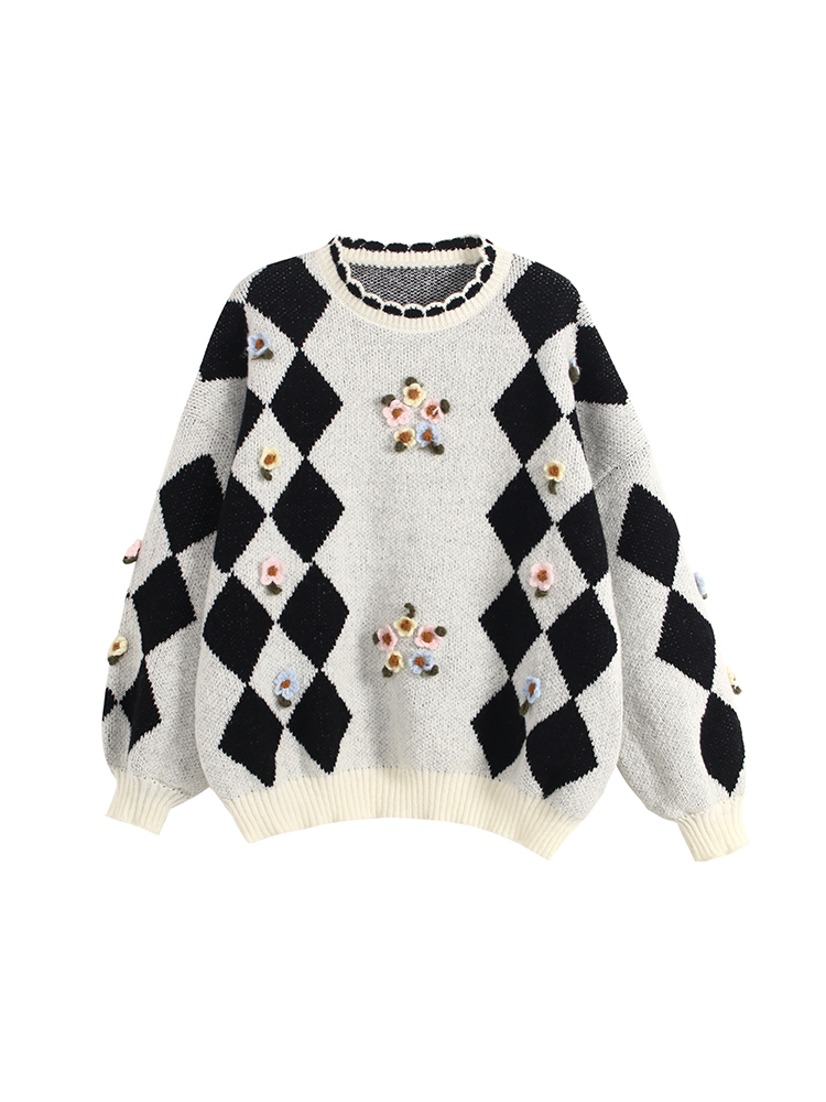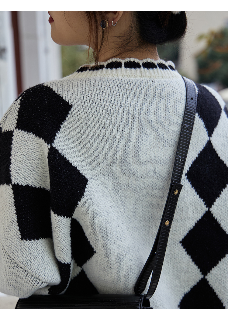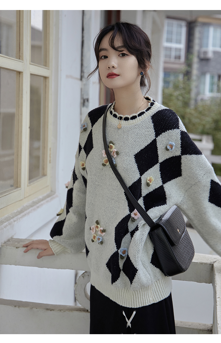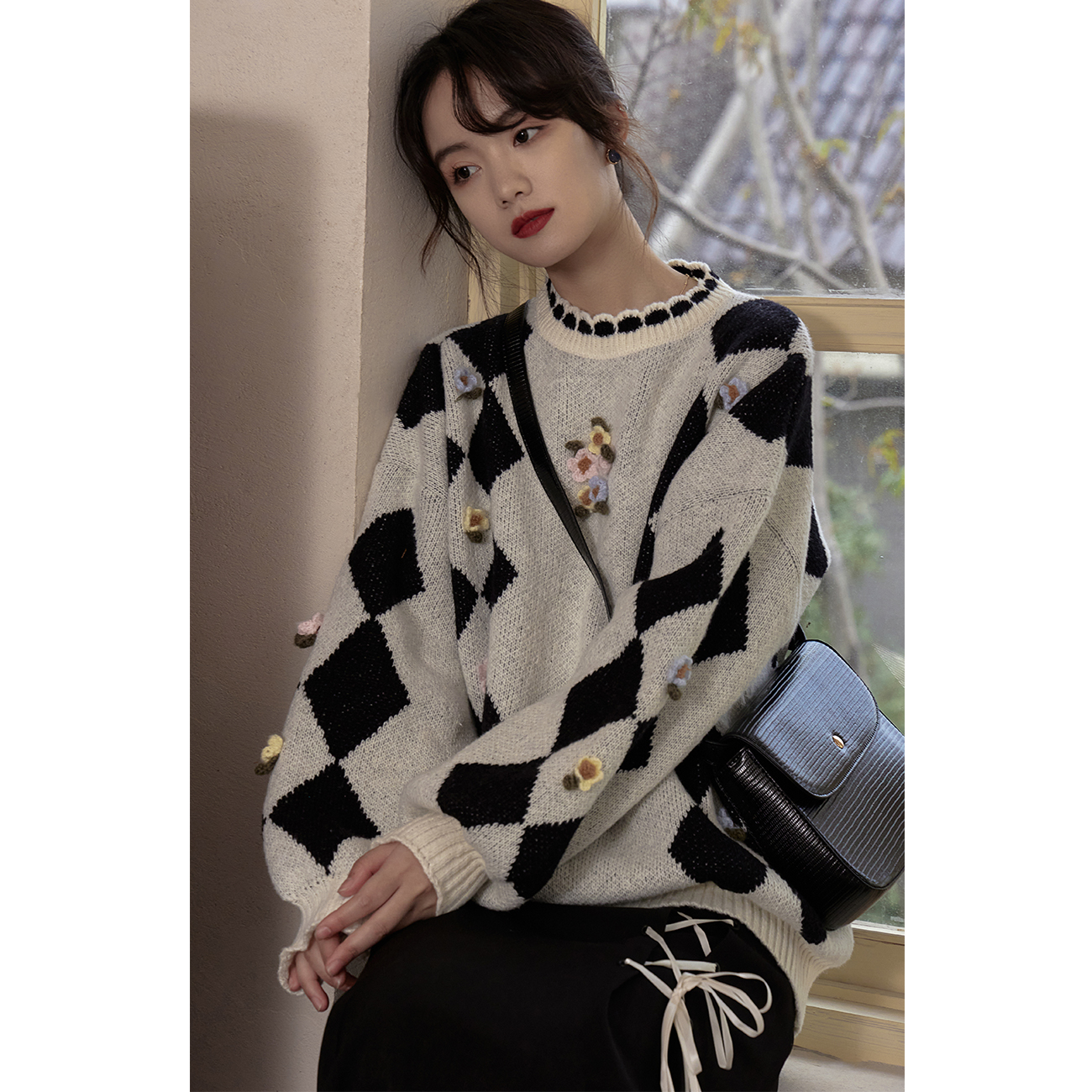 六角與淡菜Dancaiii 方塊A大大慵懶菱形幾何套頭立體黑白毛衣上衣