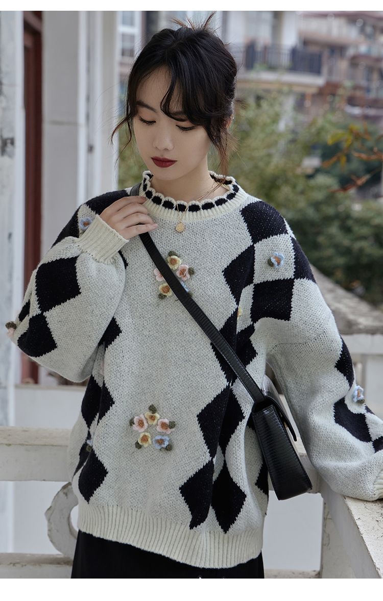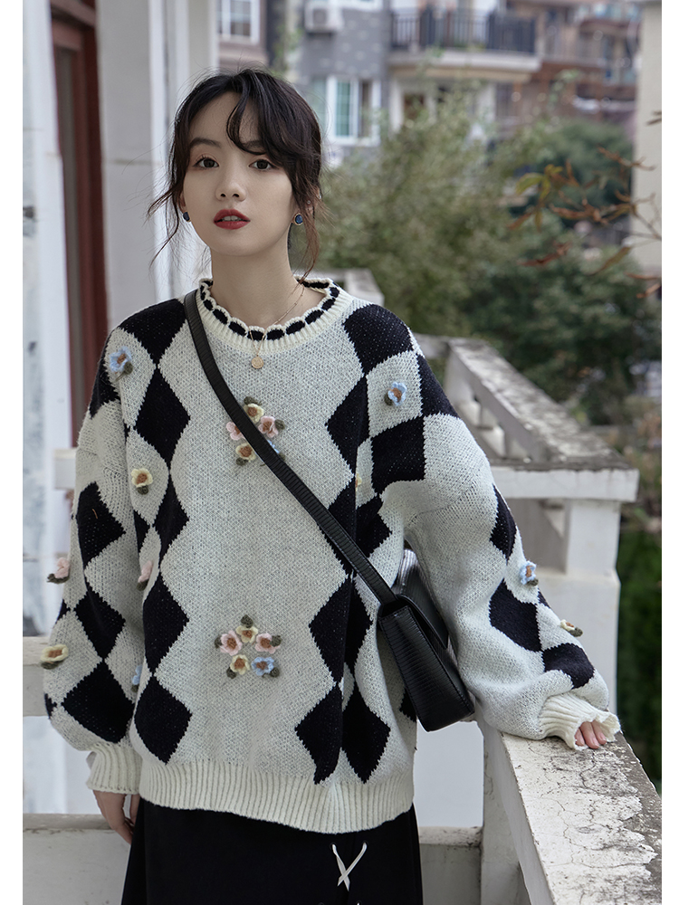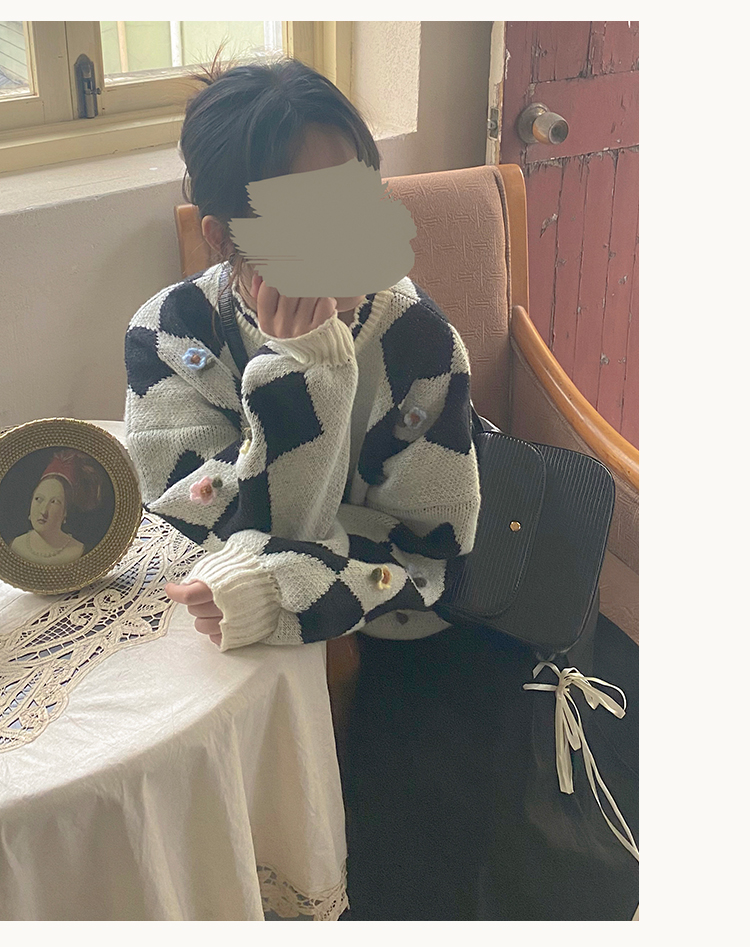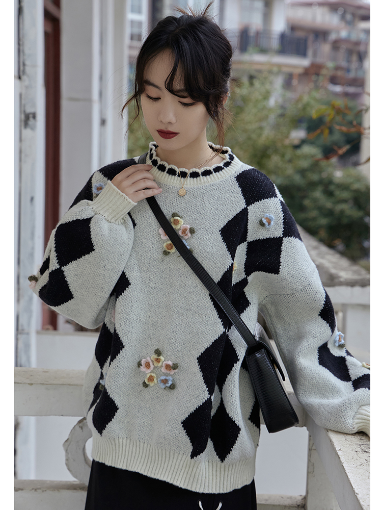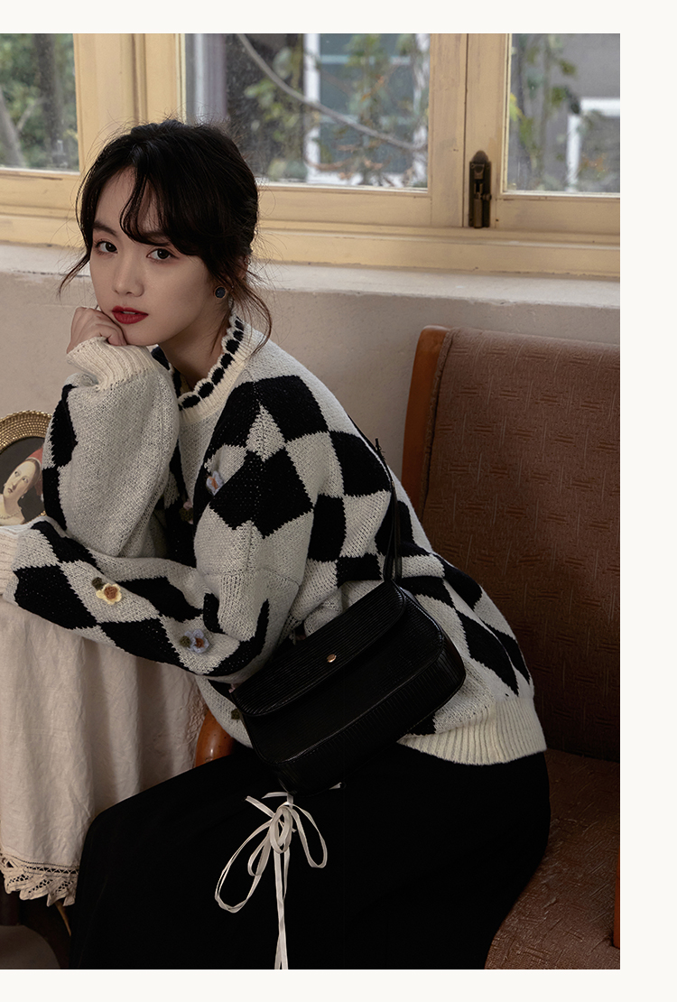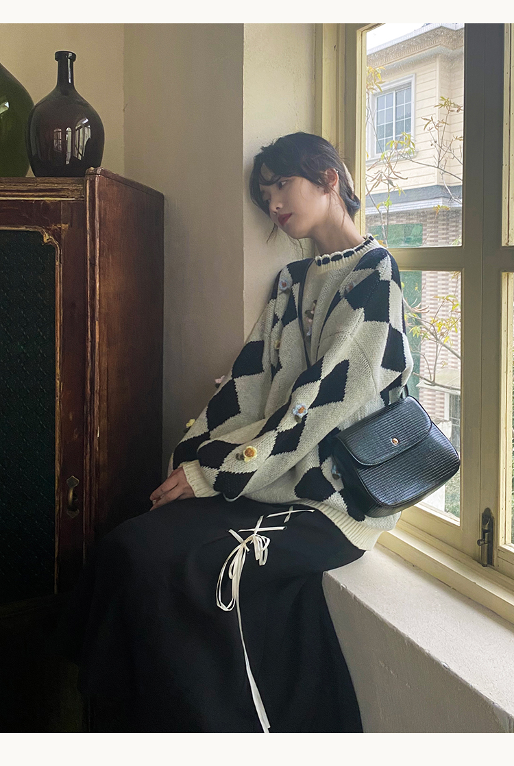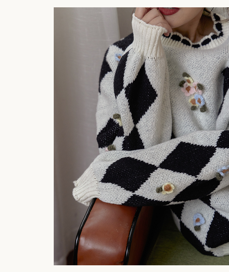 六角與淡菜Dancaiii 方塊A大大慵懶菱形幾何套頭立體黑白毛衣上衣