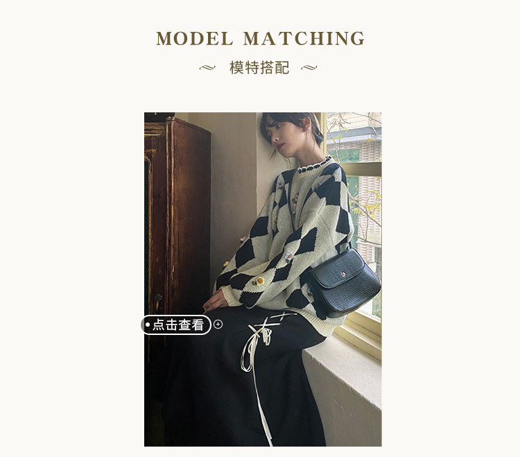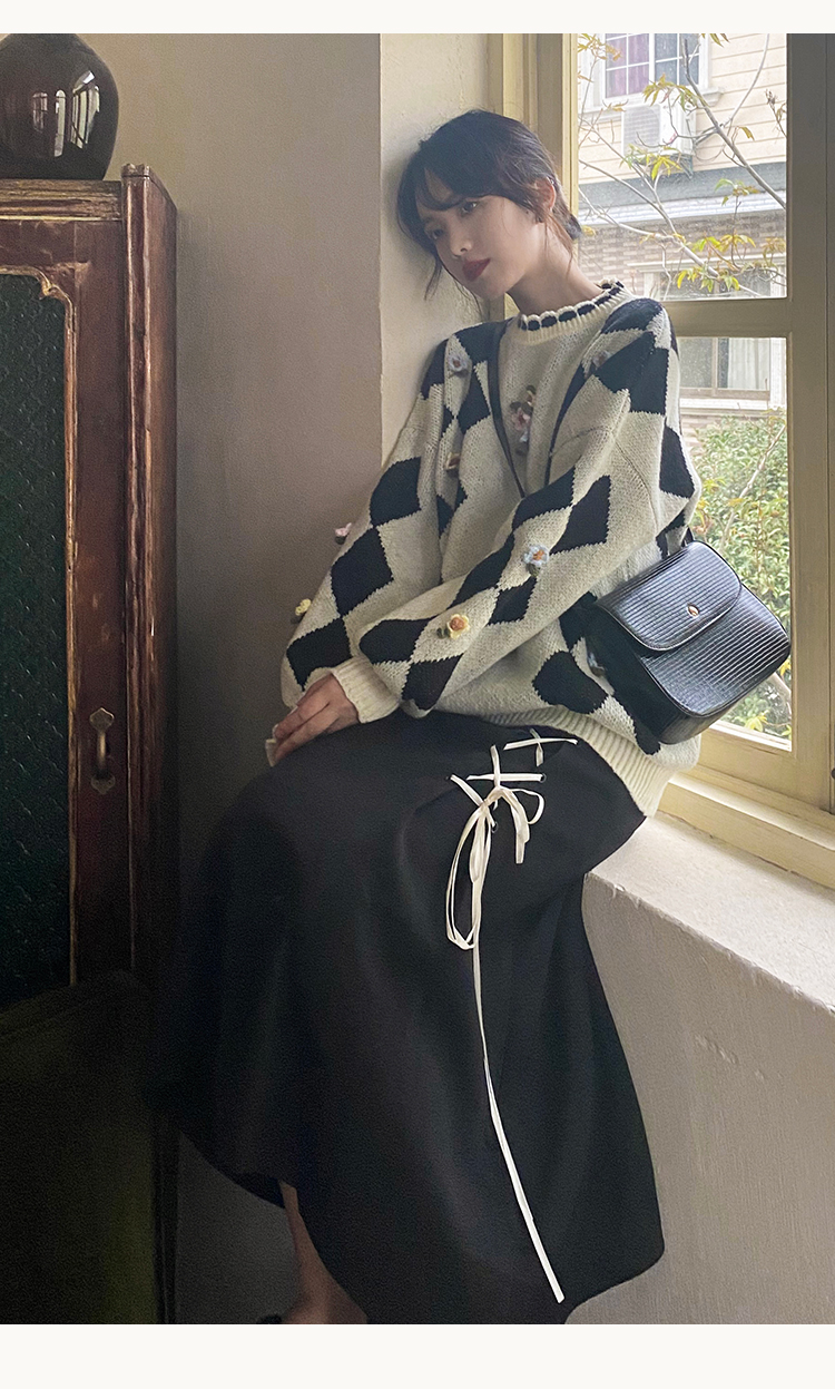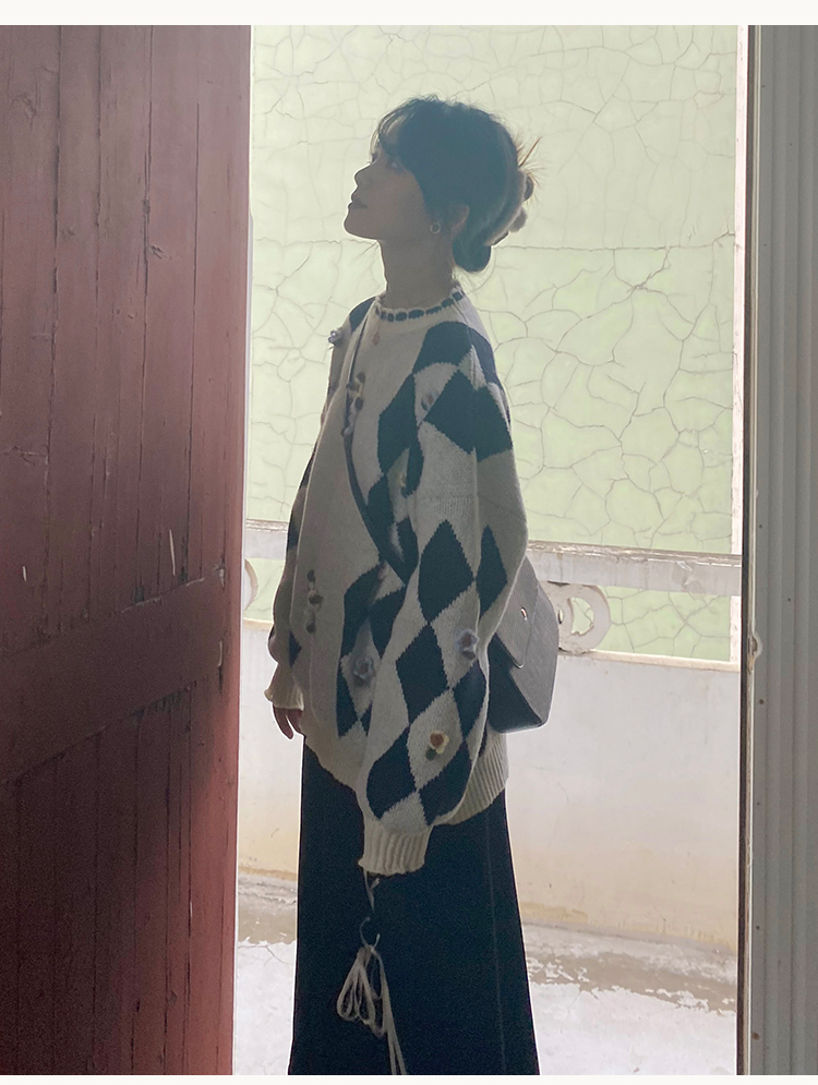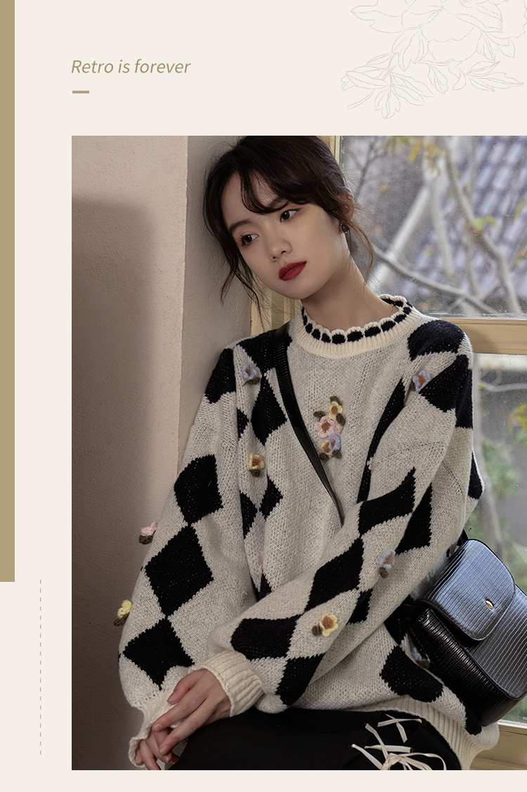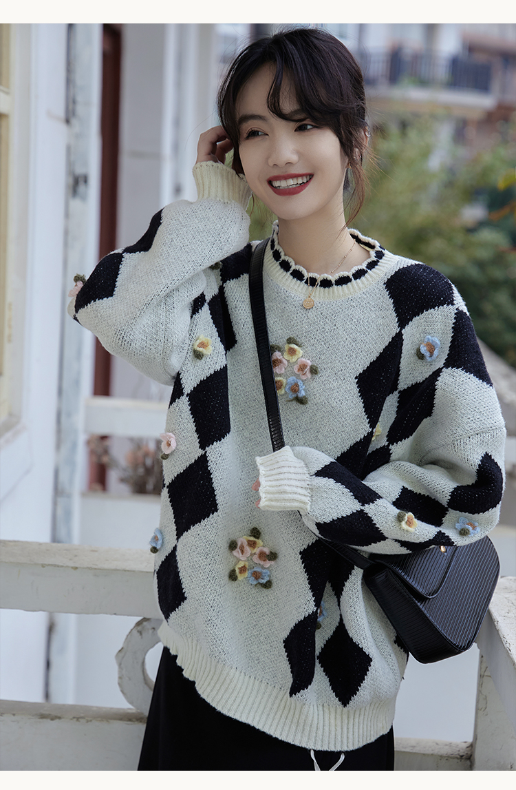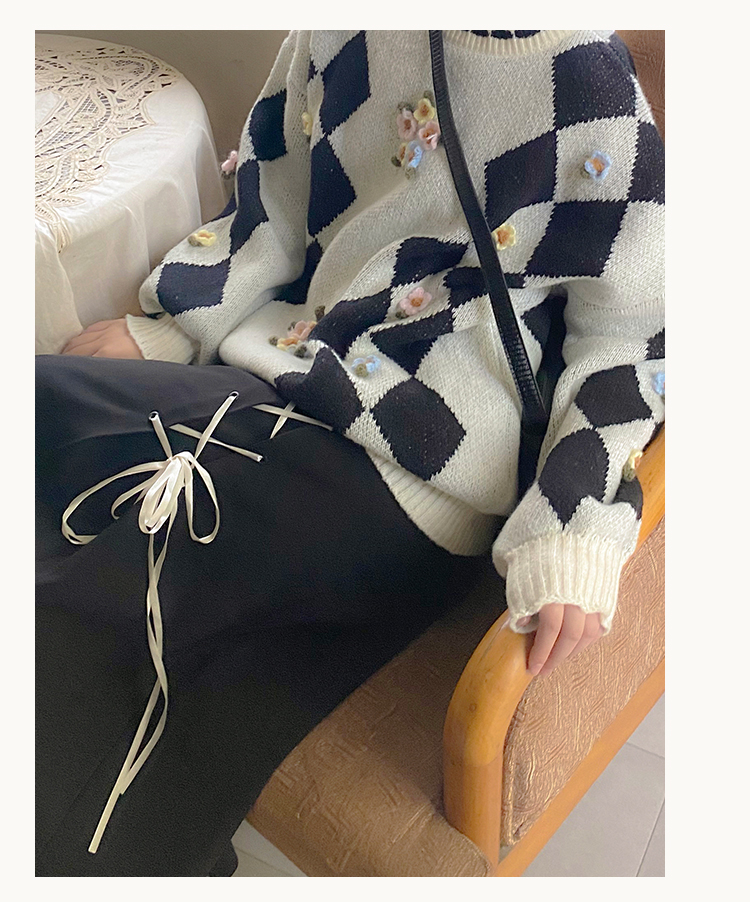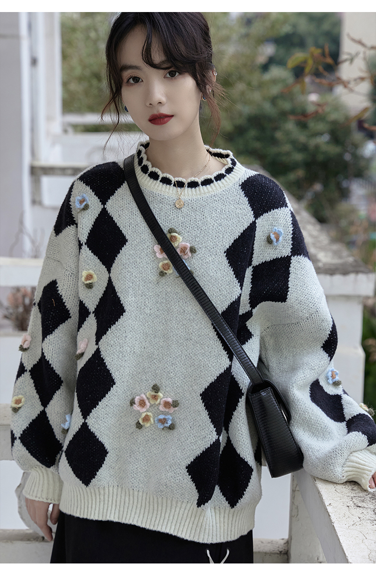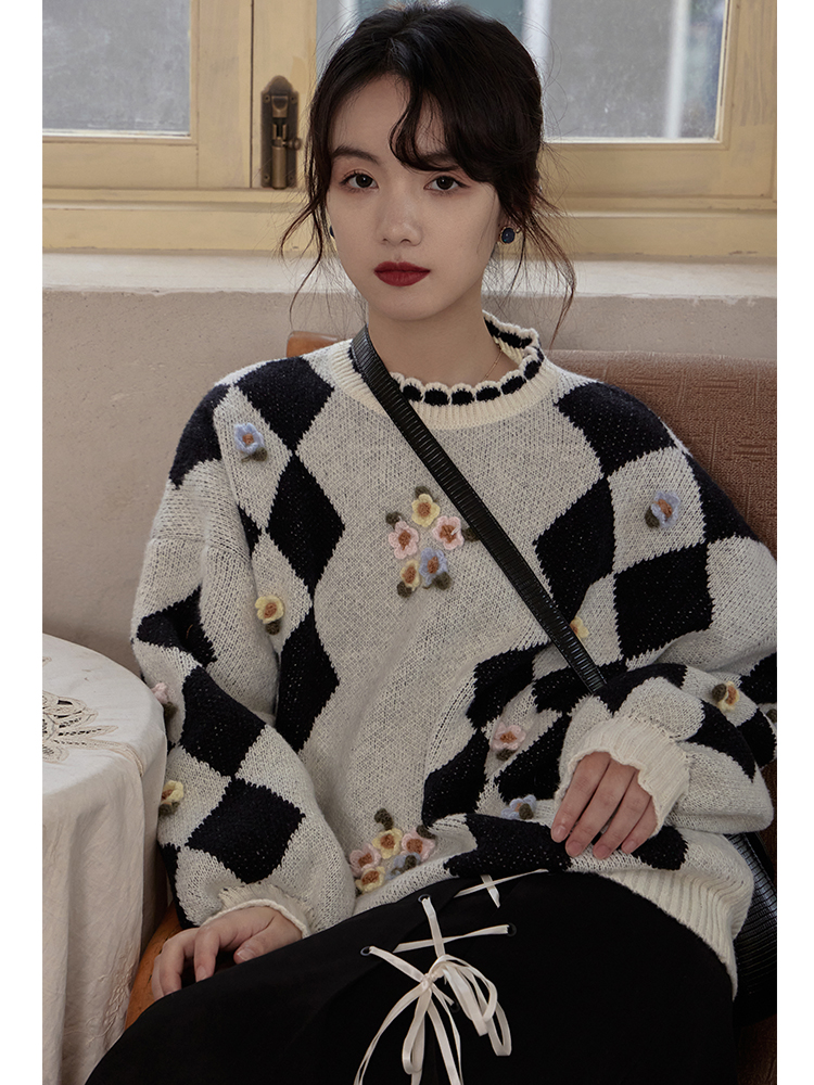 六角與淡菜Dancaiii 方塊A大大慵懶菱形幾何套頭立體黑白毛衣上衣