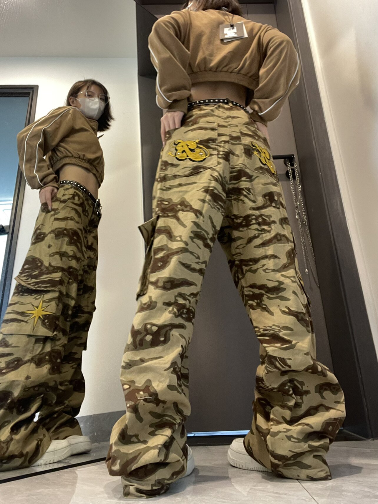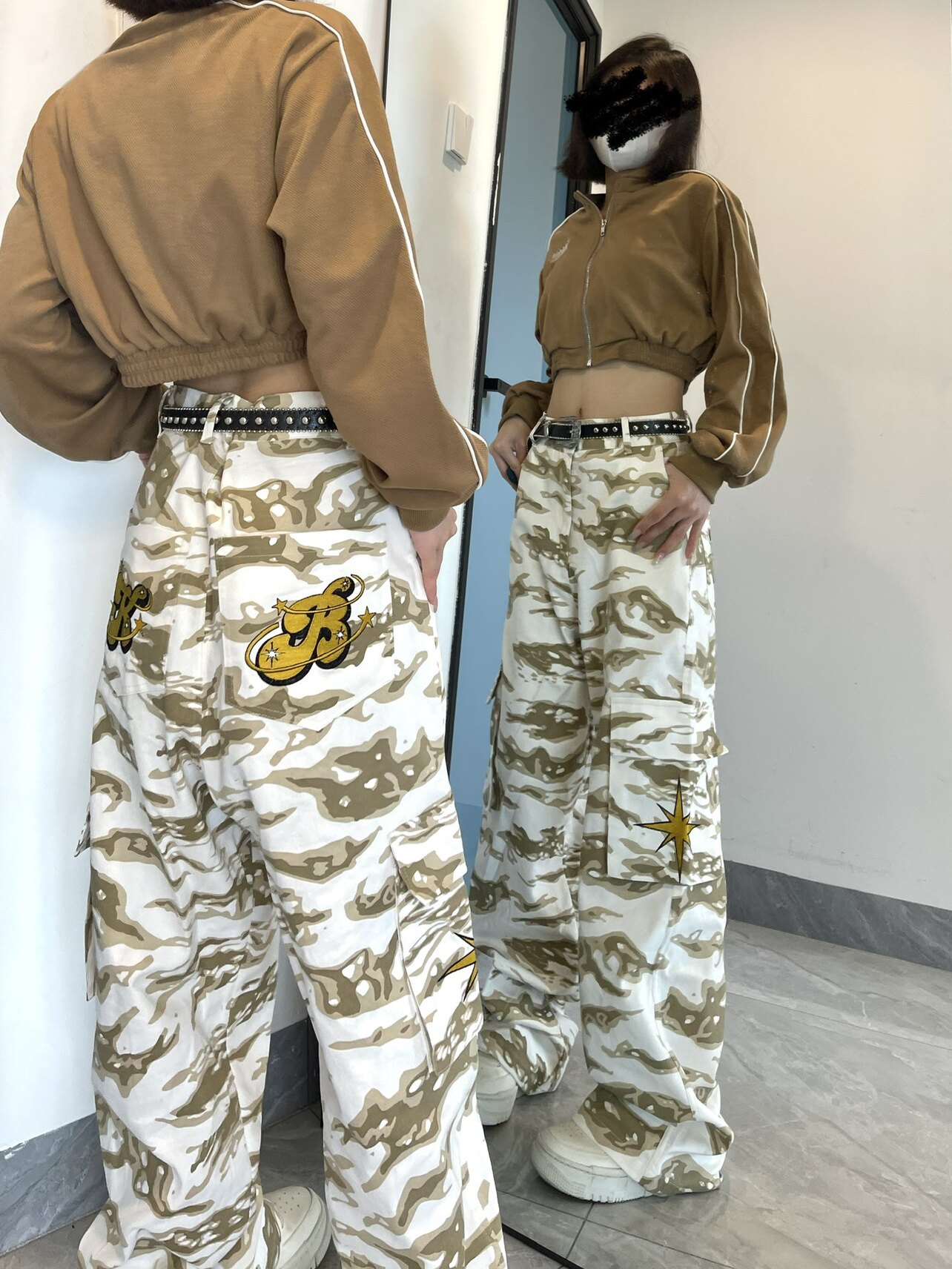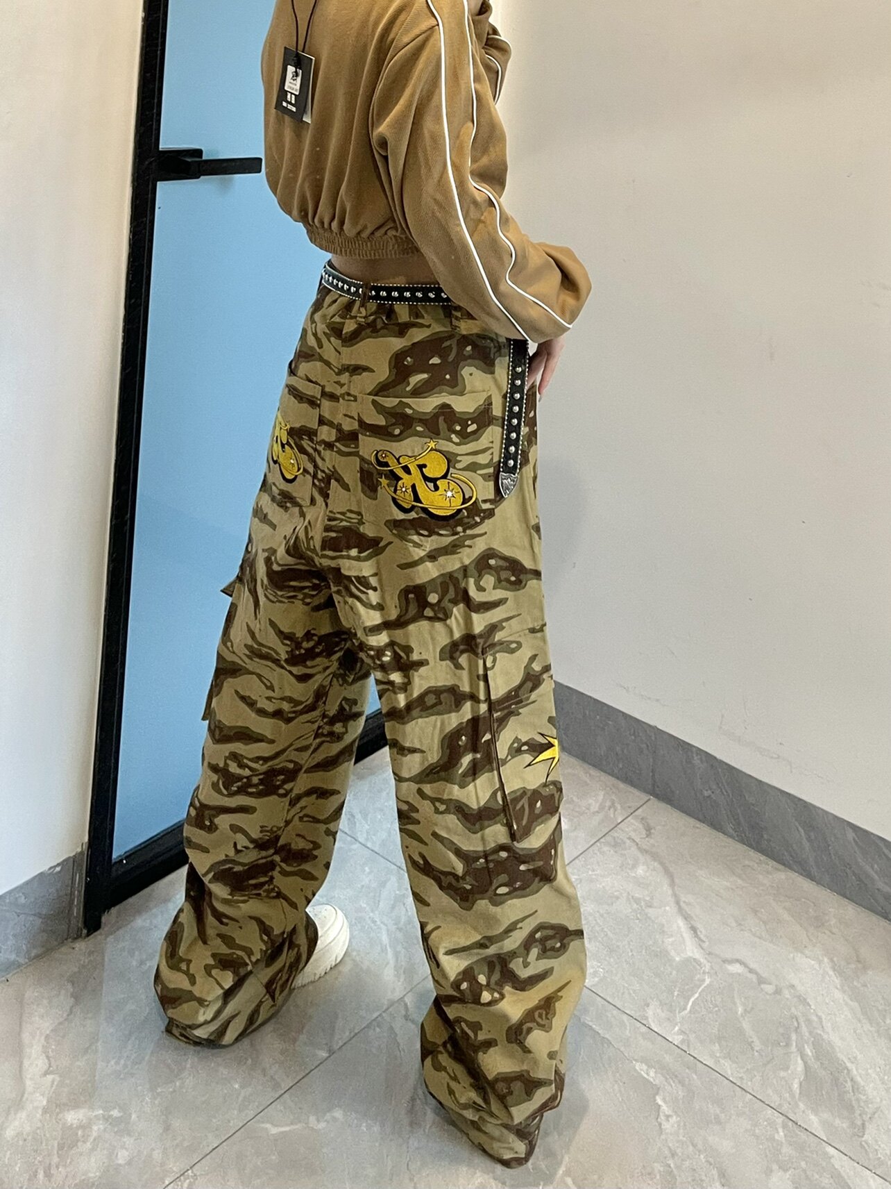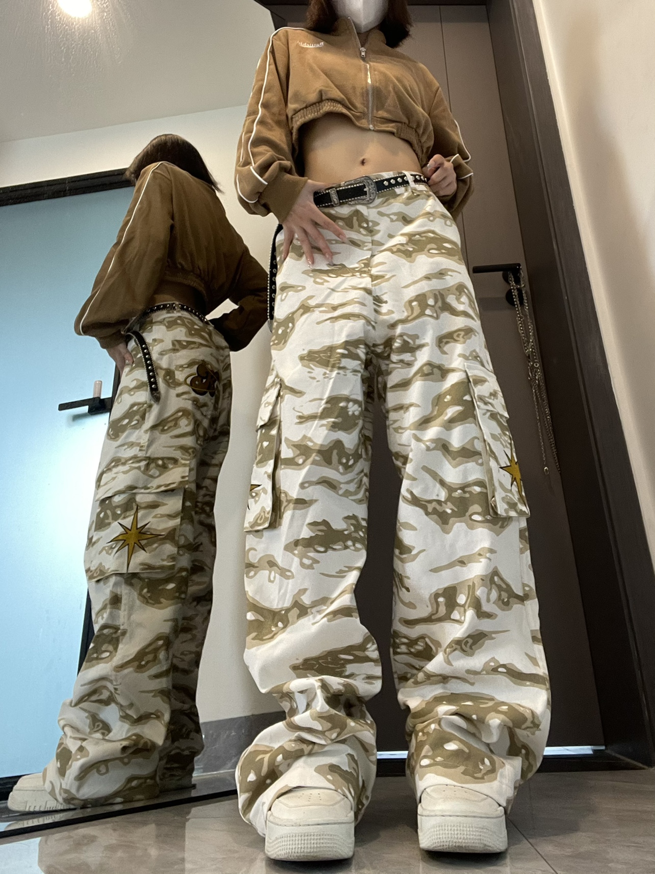 高街hiphop工裝迷彩褲女美式復古直筒寬鬆休閒褲子夏季牛仔長褲男