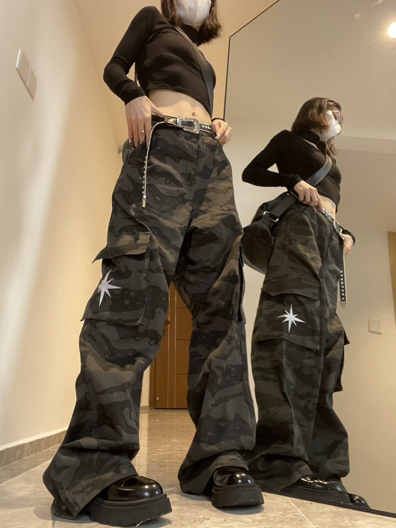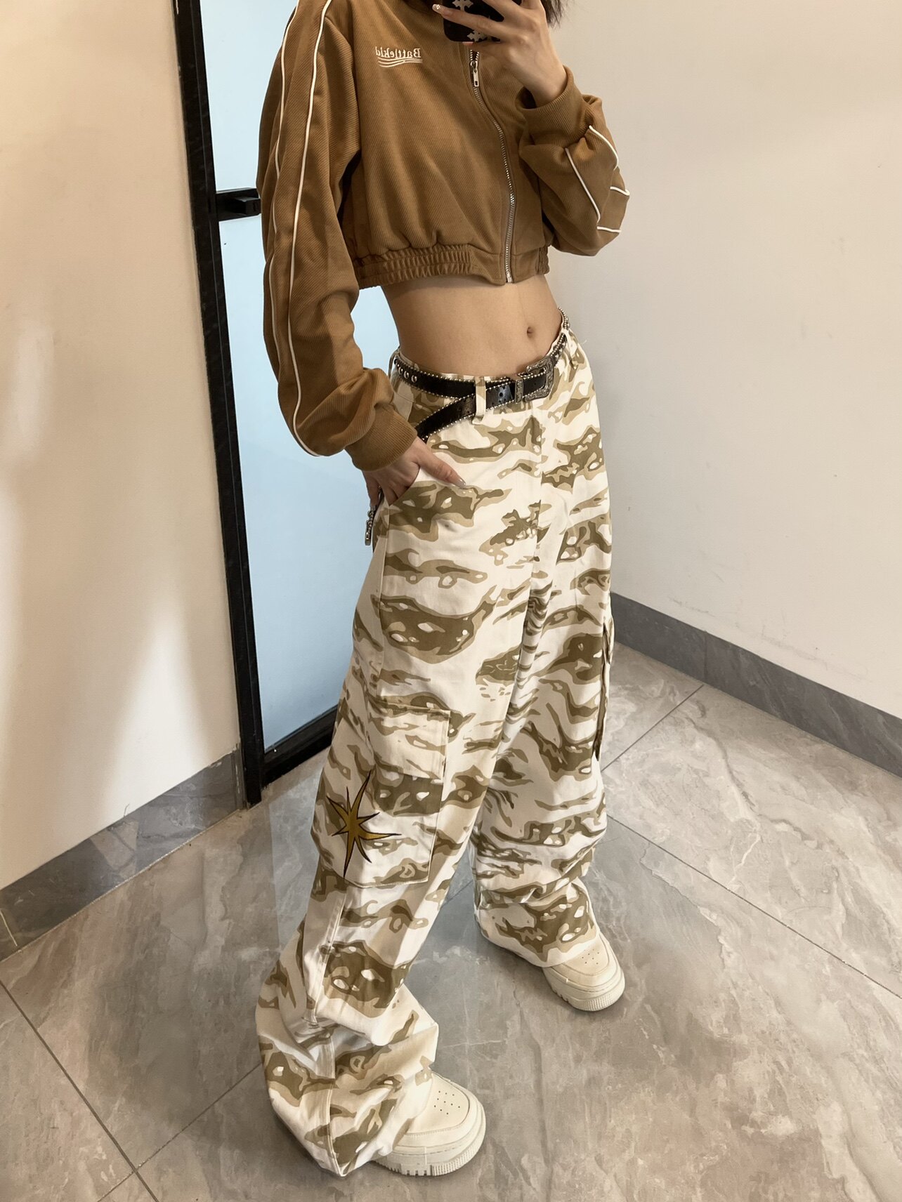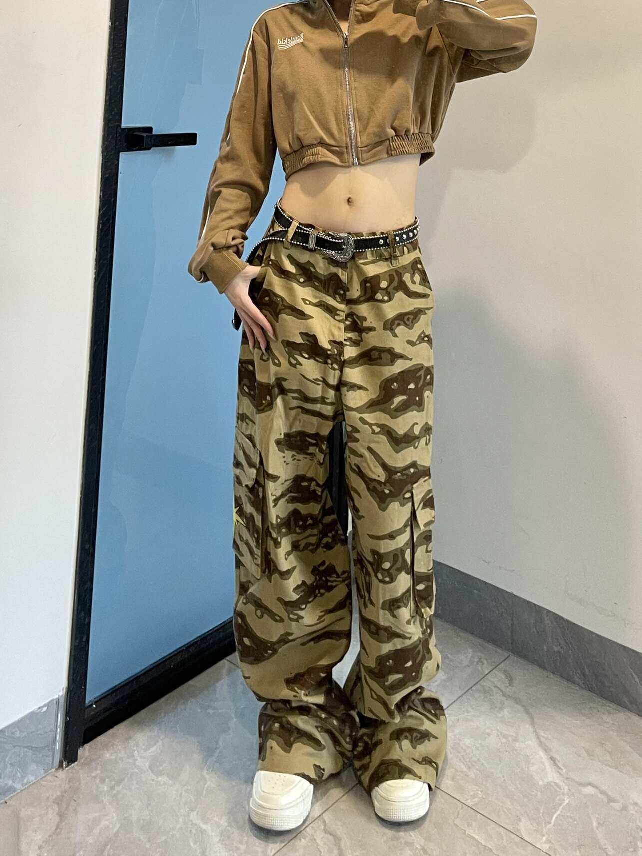 高街hiphop工裝迷彩褲女美式復古直筒寬鬆休閒褲子夏季牛仔長褲男