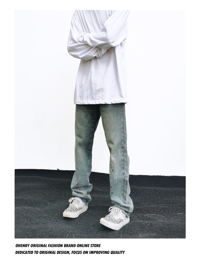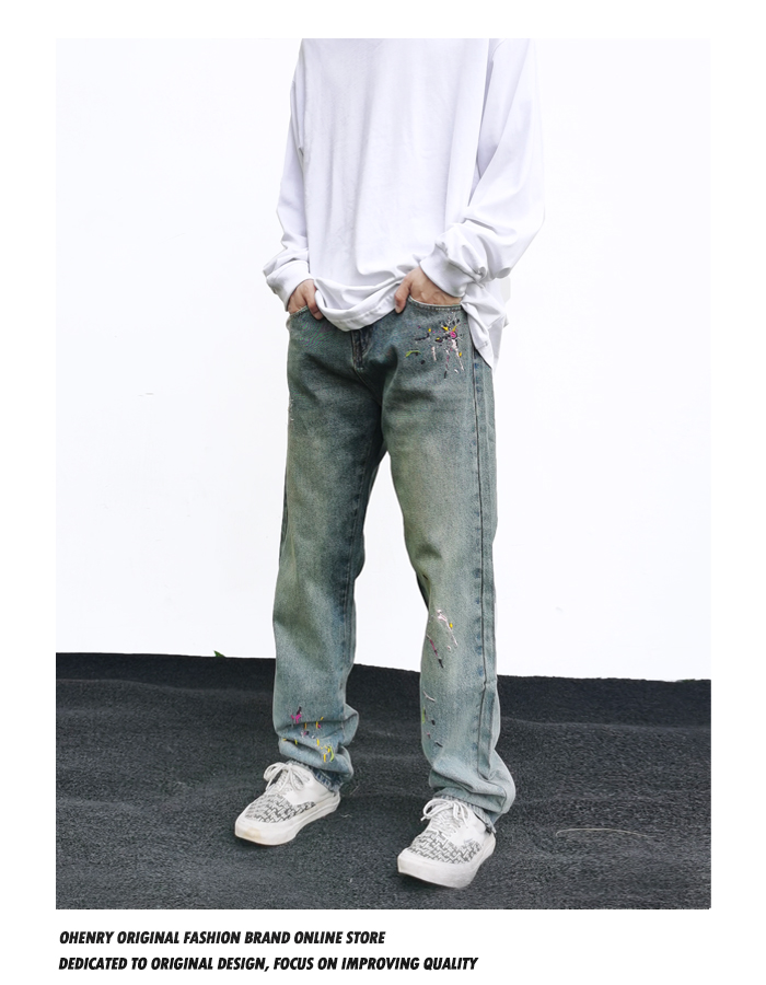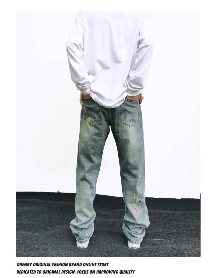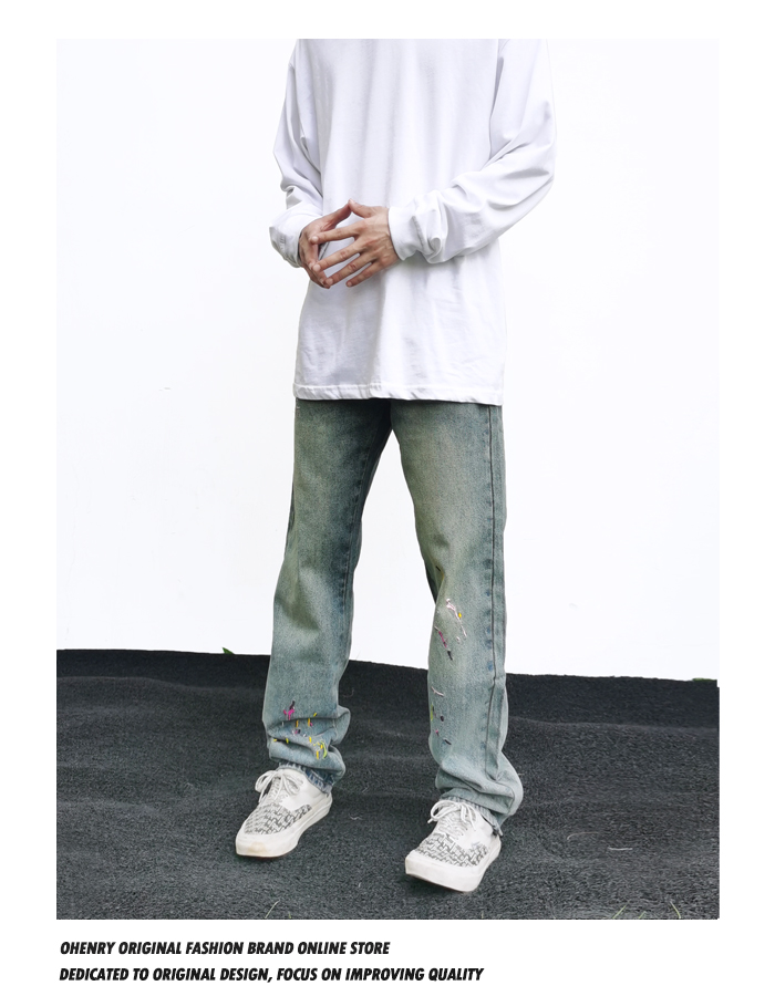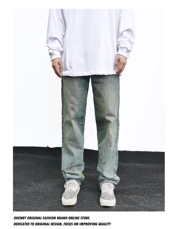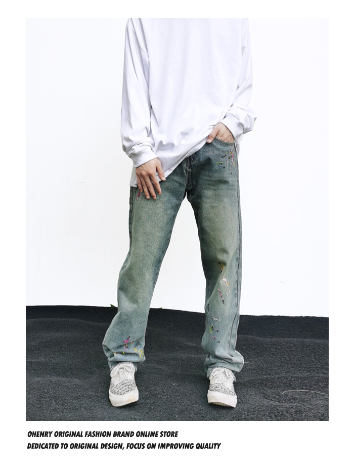 OHenry王鶴棣同款褲子潑墨刺繡水洗寬鬆直筒牛仔褲美式休閒長褲男
