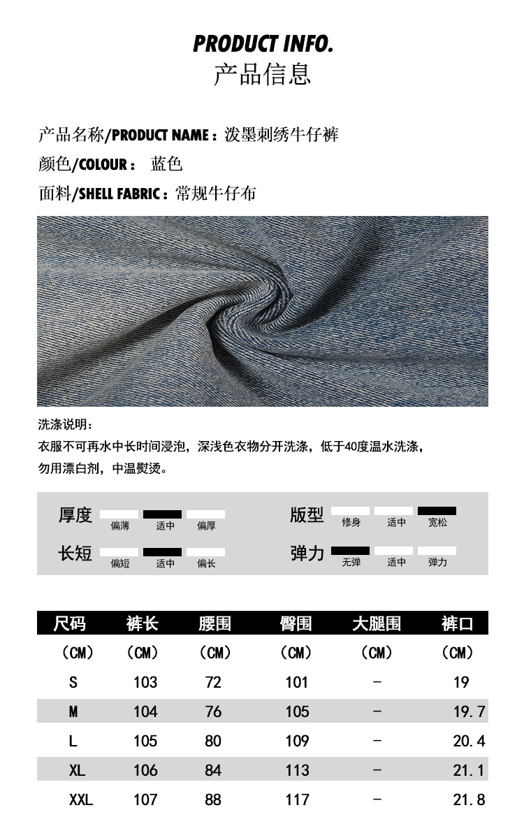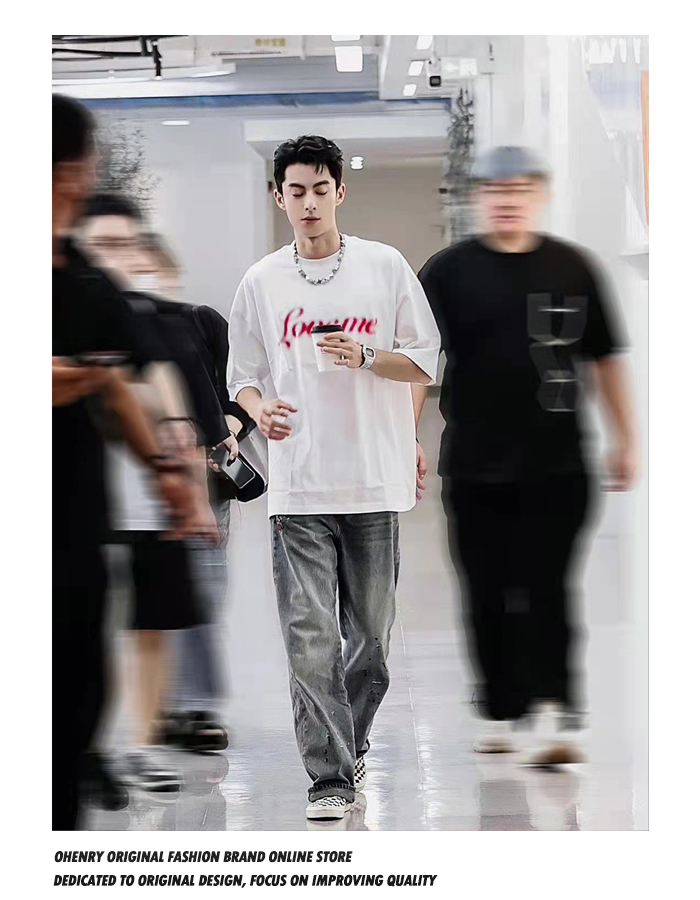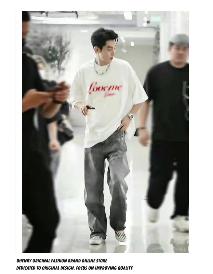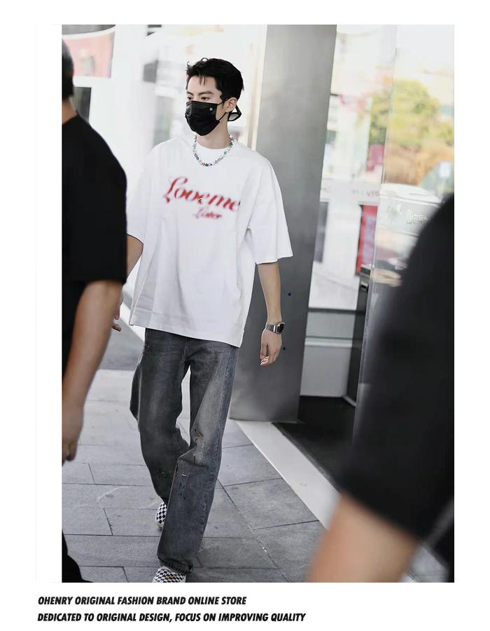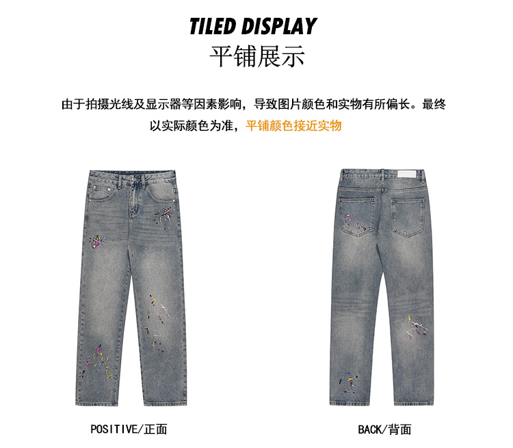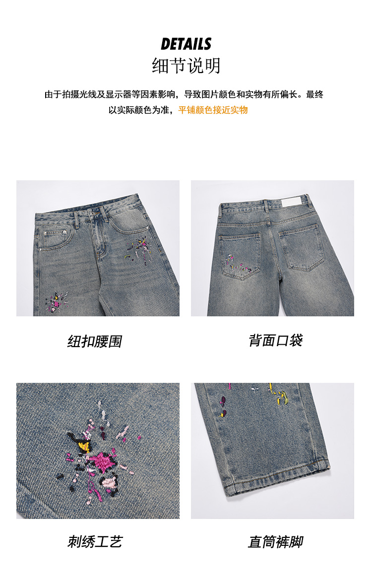 OHenry王鶴棣同款褲子潑墨刺繡水洗寬鬆直筒牛仔褲美式休閒長褲男