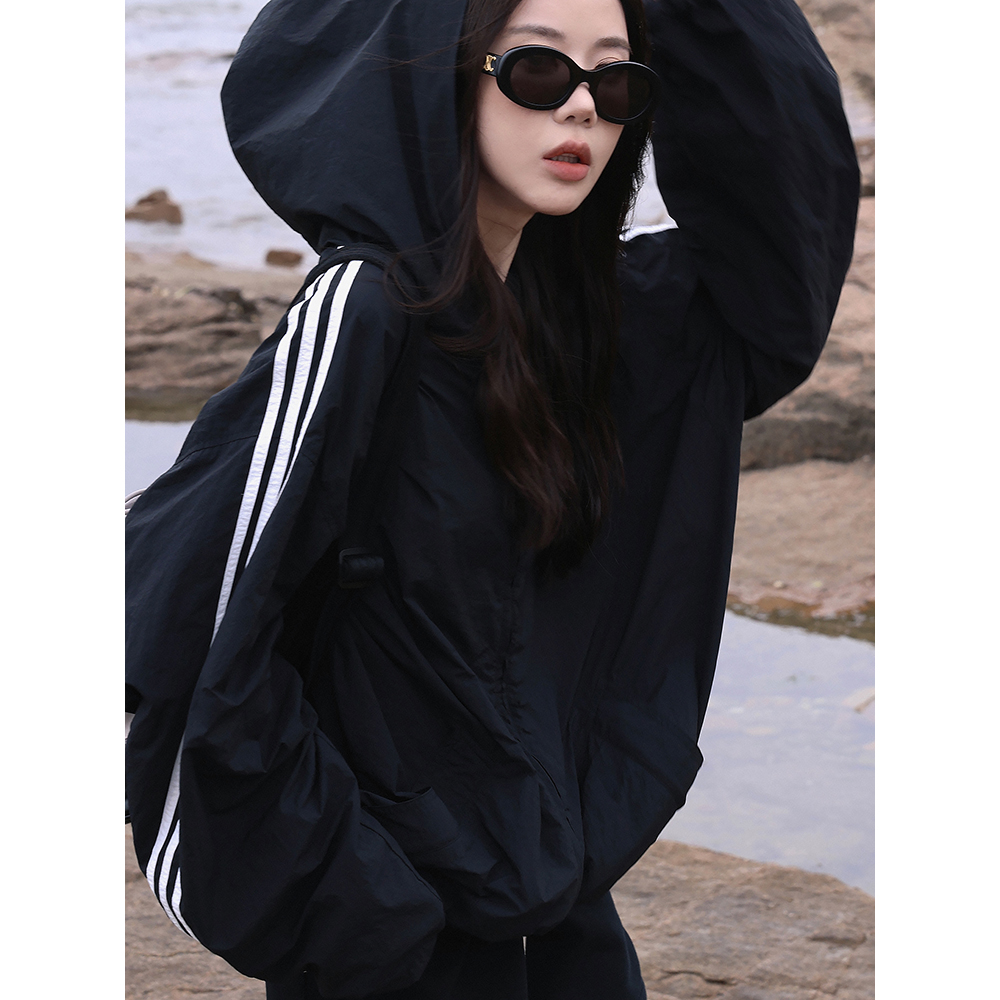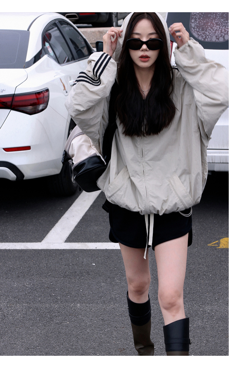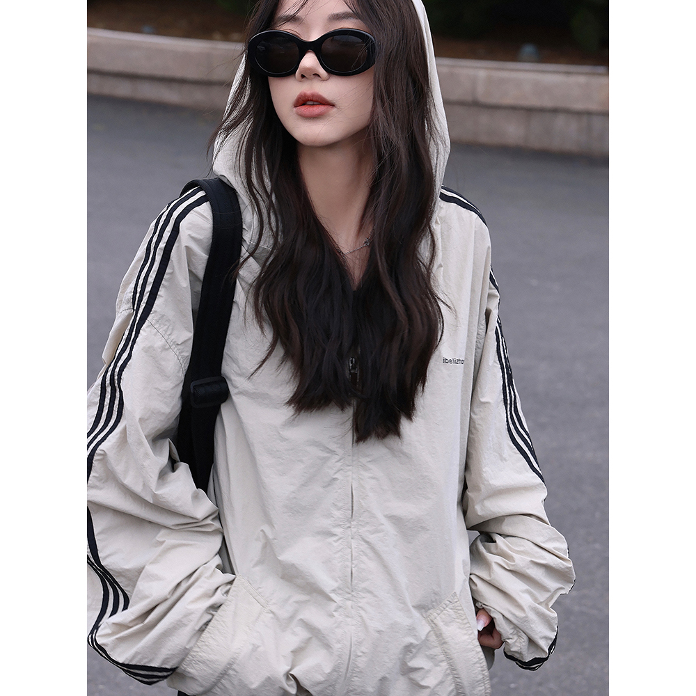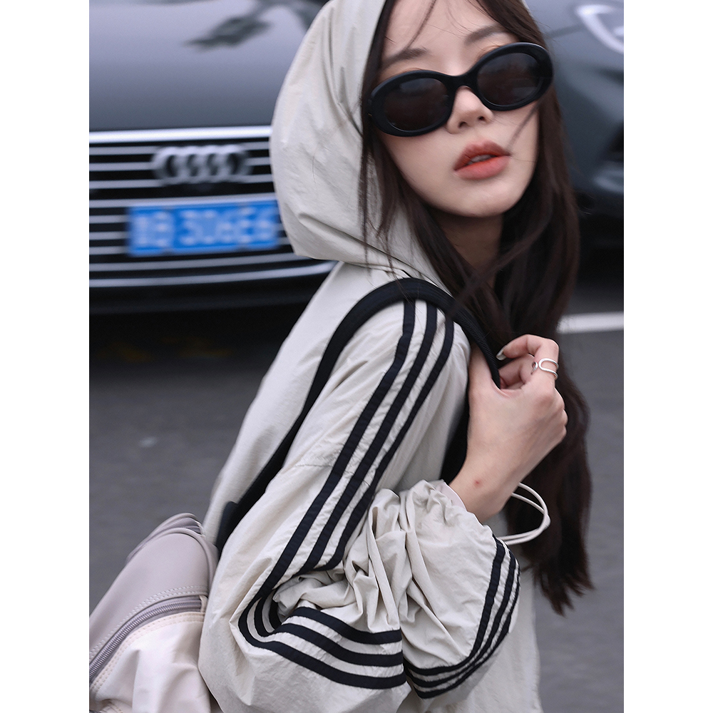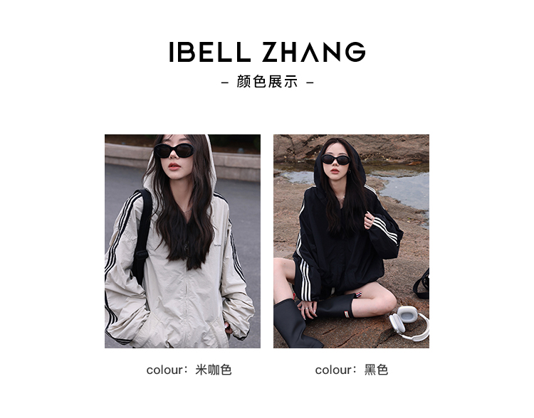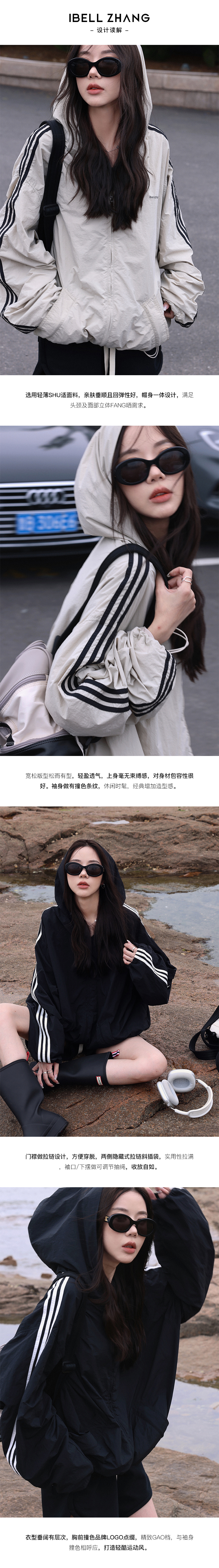 張貝貝ibell早秋新款美式戶外衝鋒衣女撞色條紋寬鬆長袖連帽外套