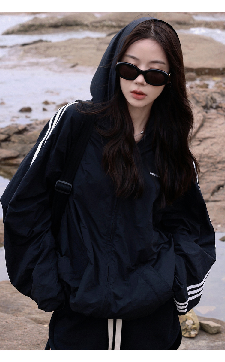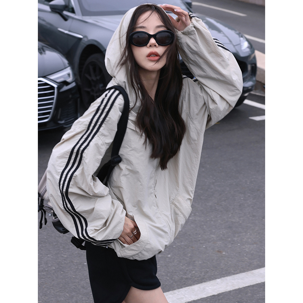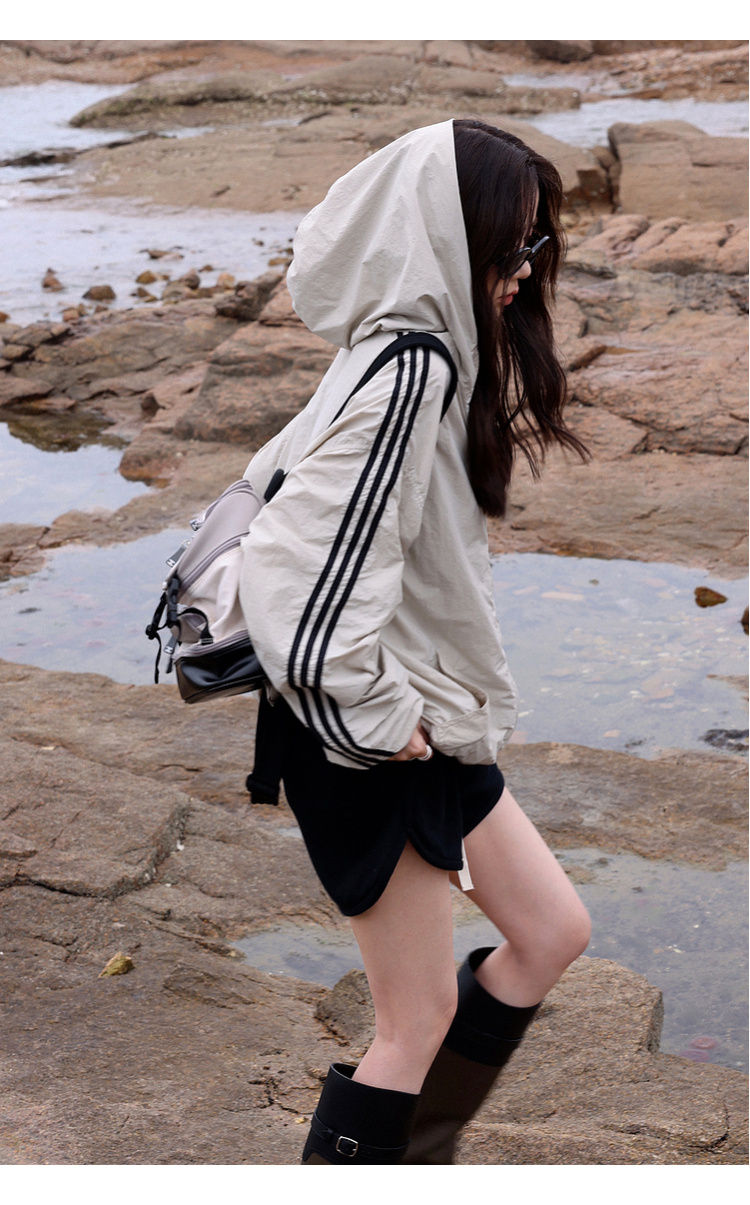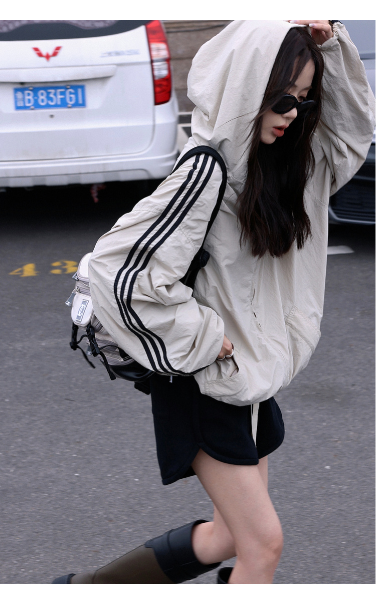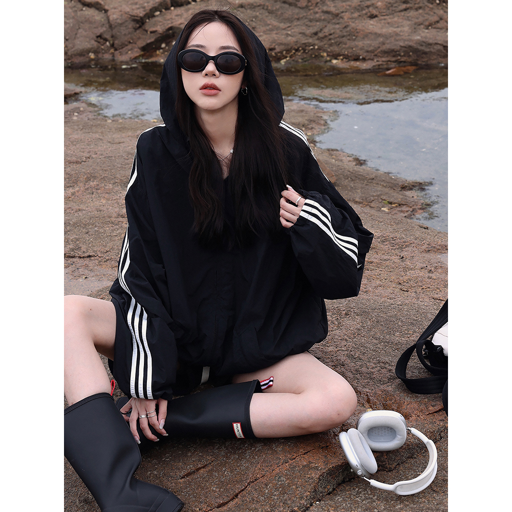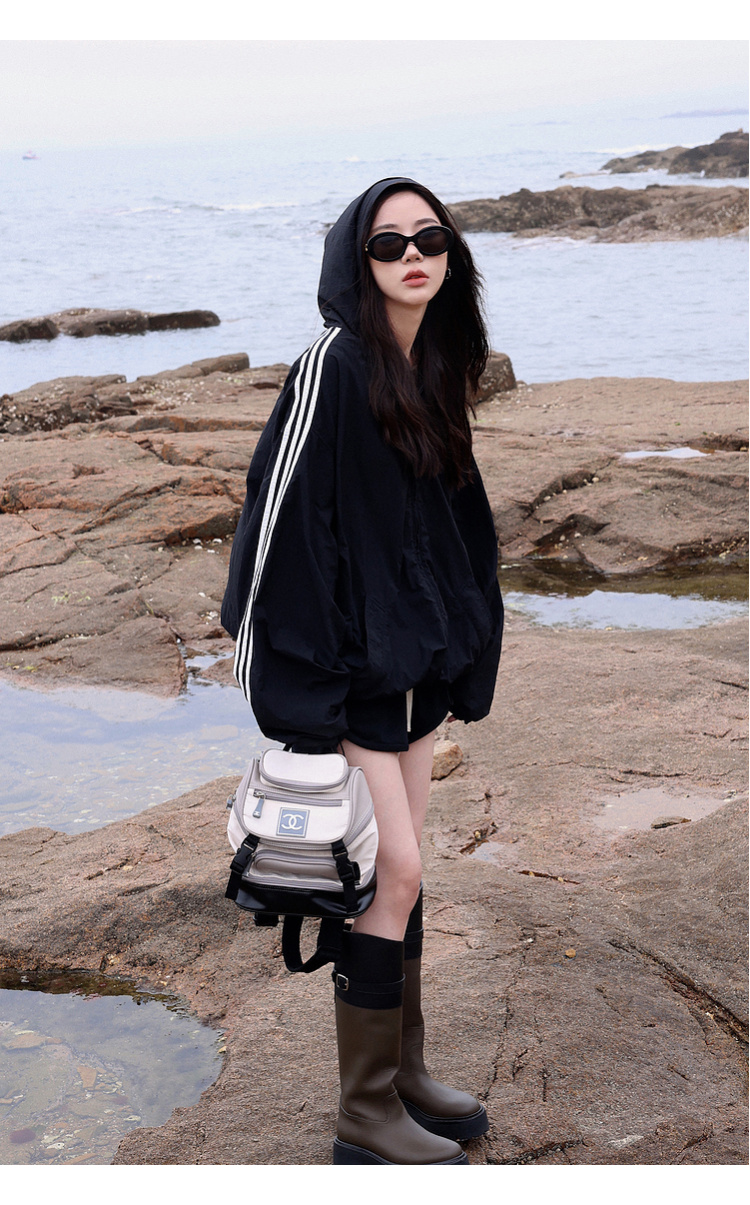 張貝貝ibell早秋新款美式戶外衝鋒衣女撞色條紋寬鬆長袖連帽外套