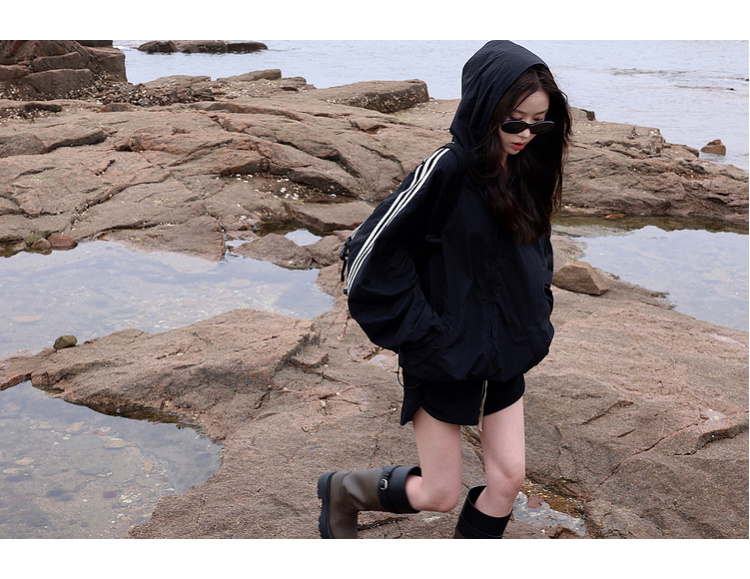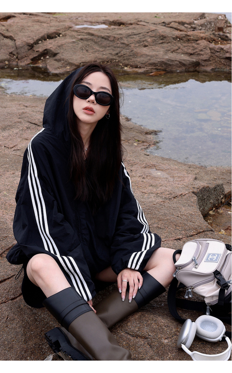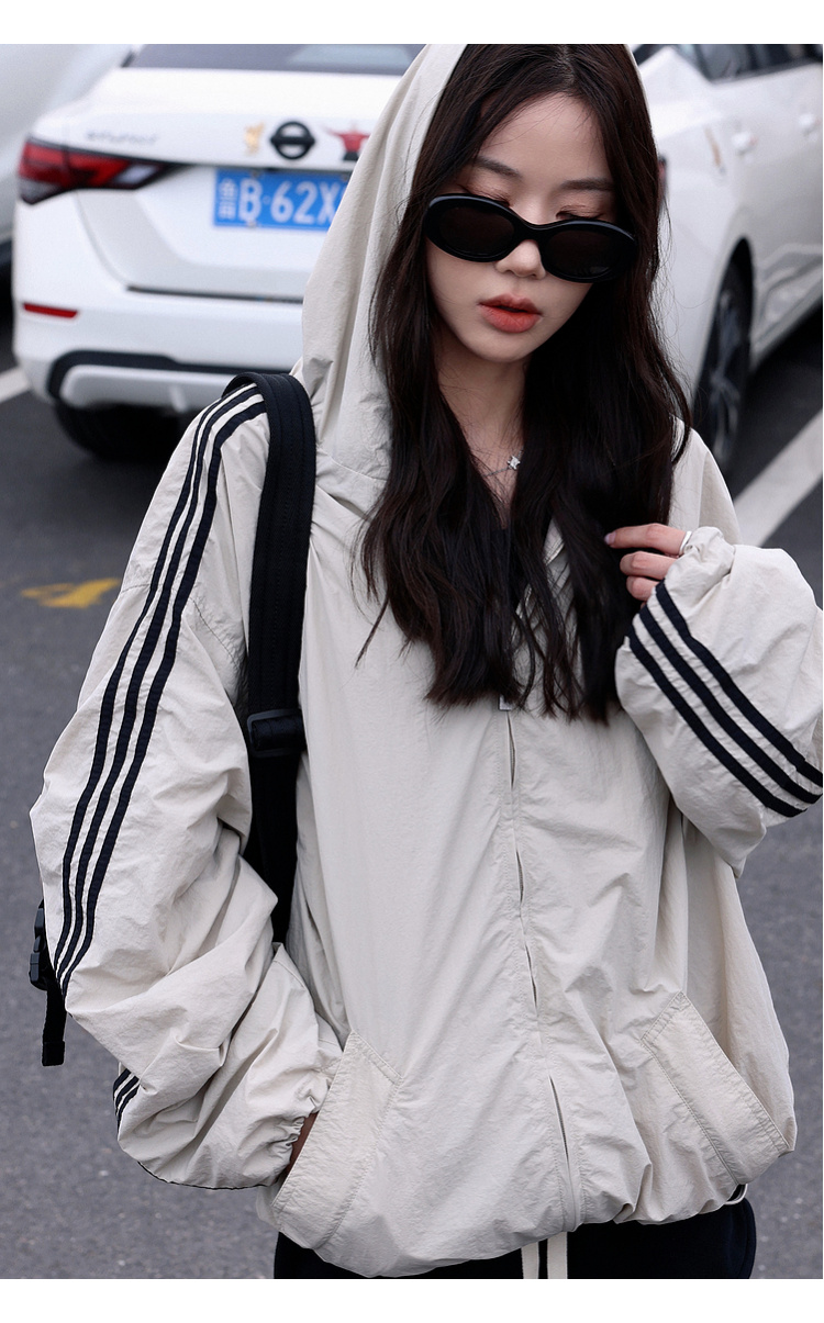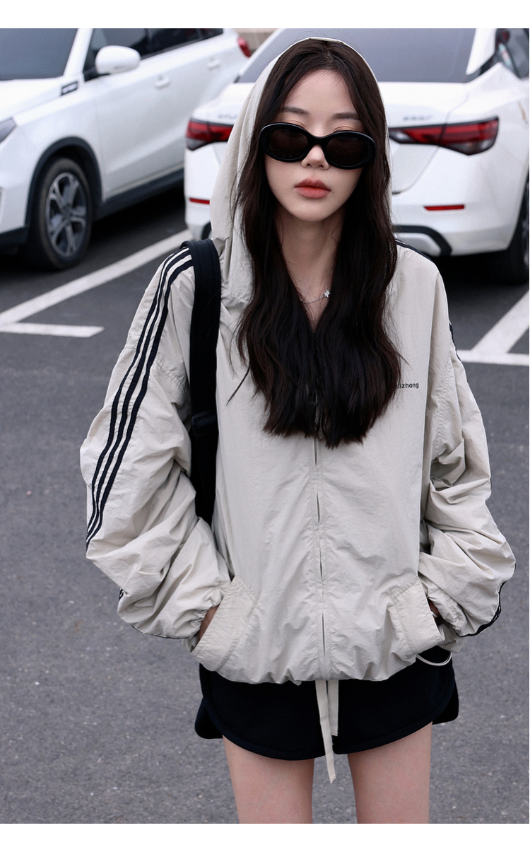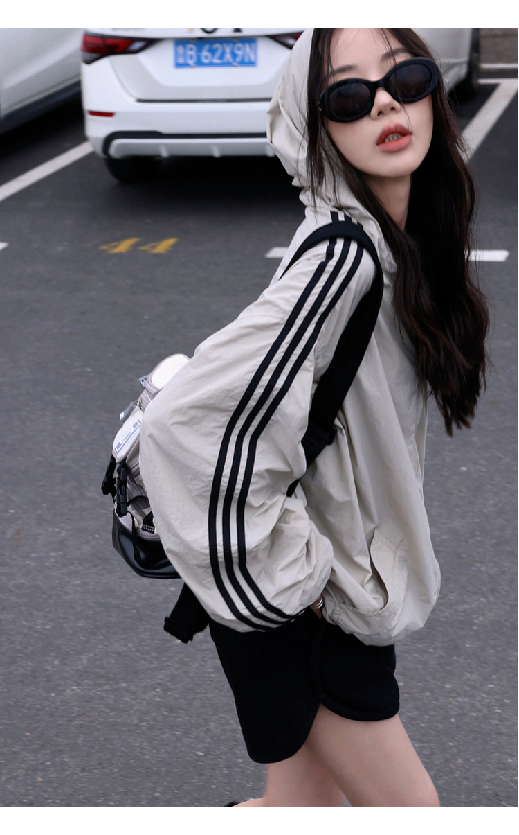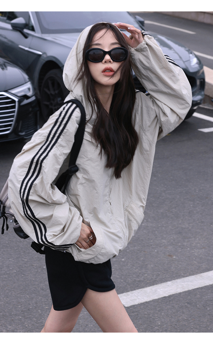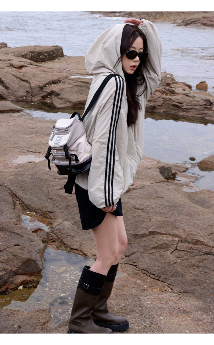 張貝貝ibell早秋新款美式戶外衝鋒衣女撞色條紋寬鬆長袖連帽外套