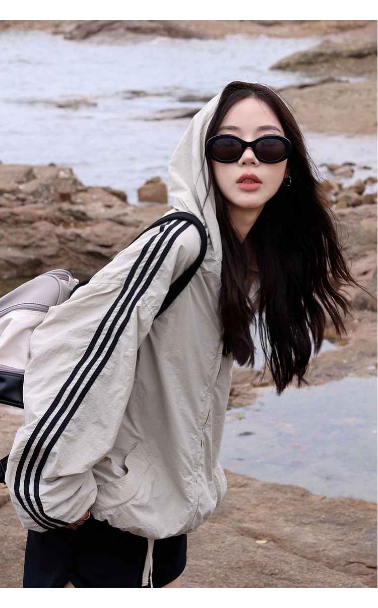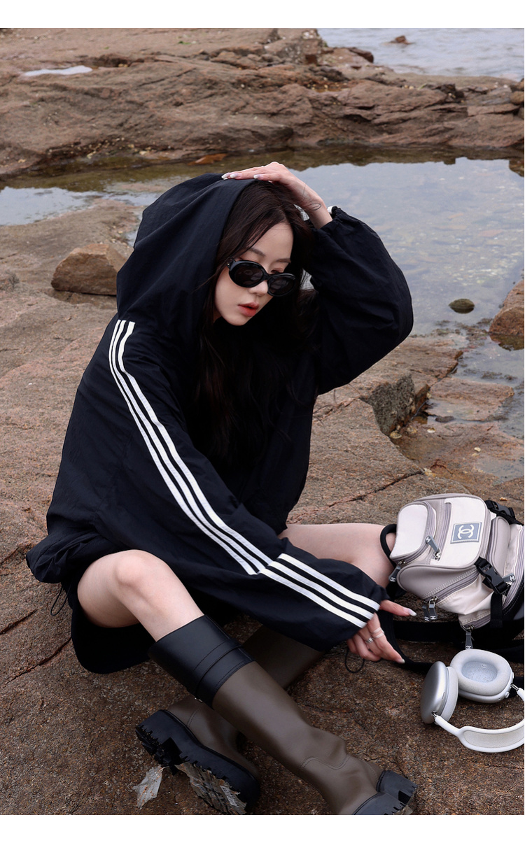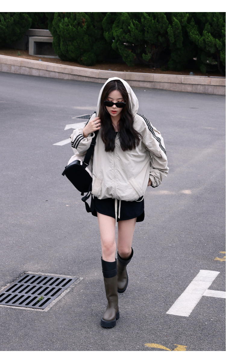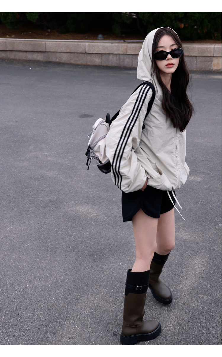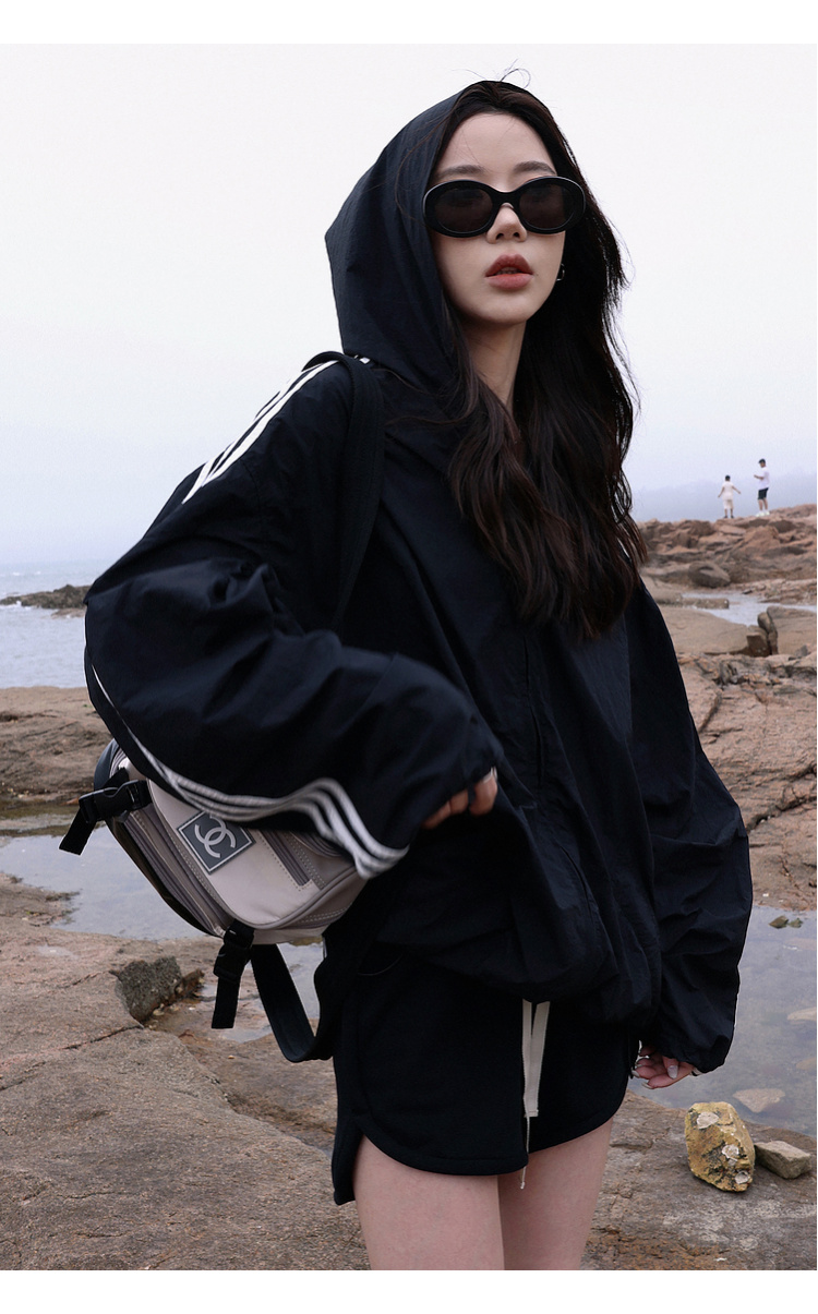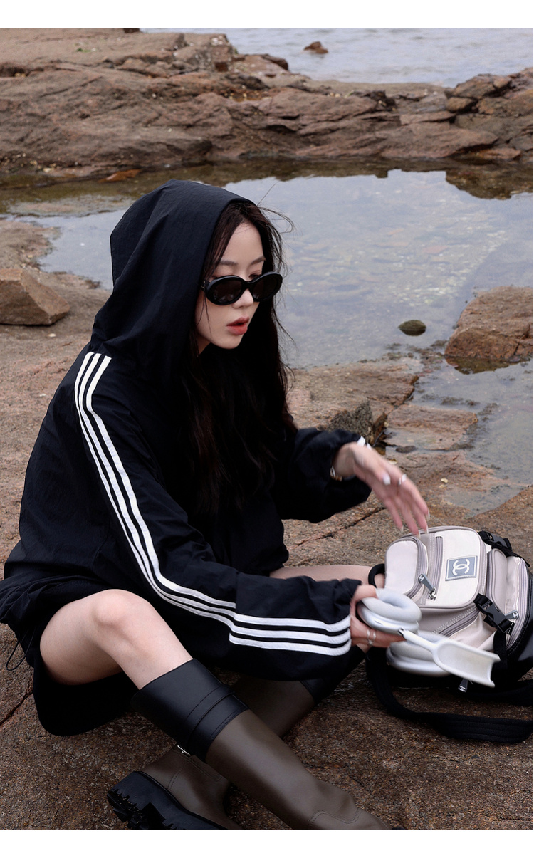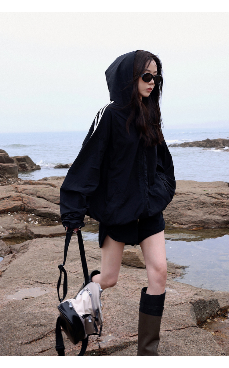張貝貝ibell早秋新款美式戶外衝鋒衣女撞色條紋寬鬆長袖連帽外套
