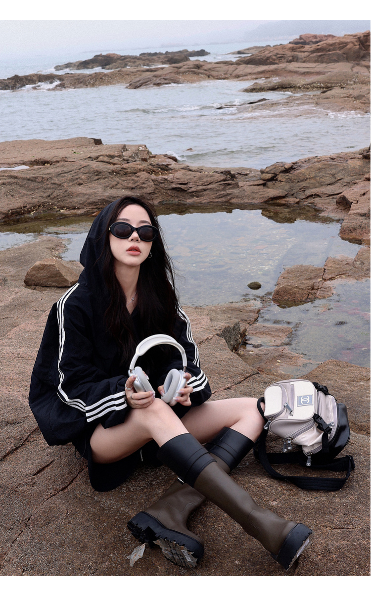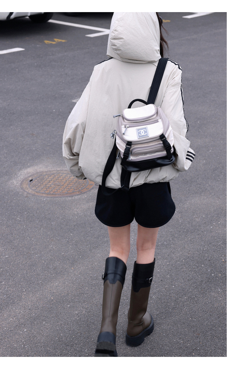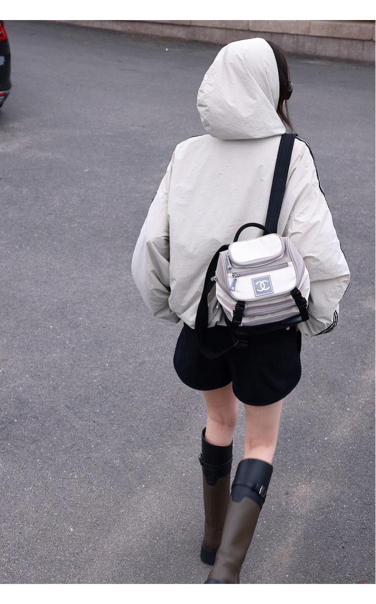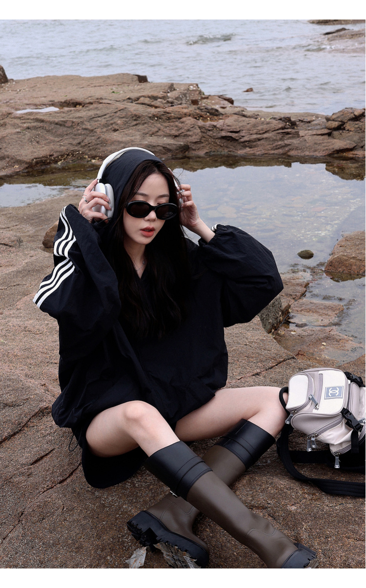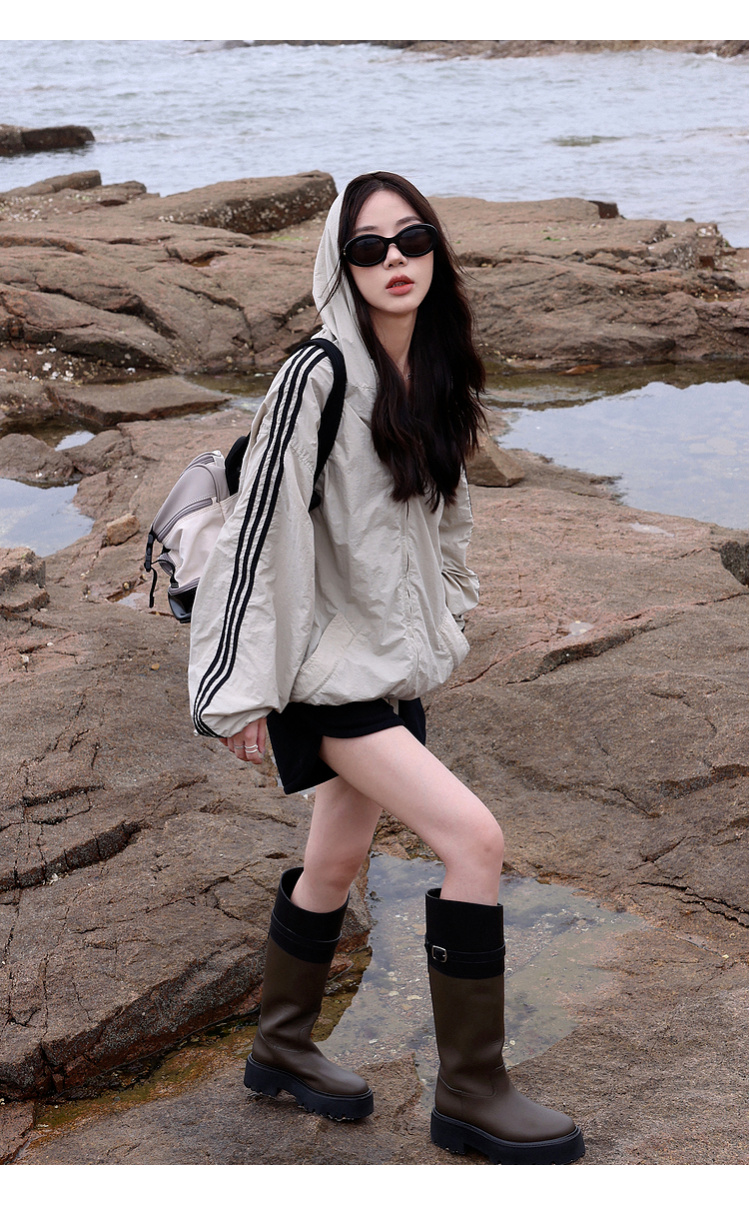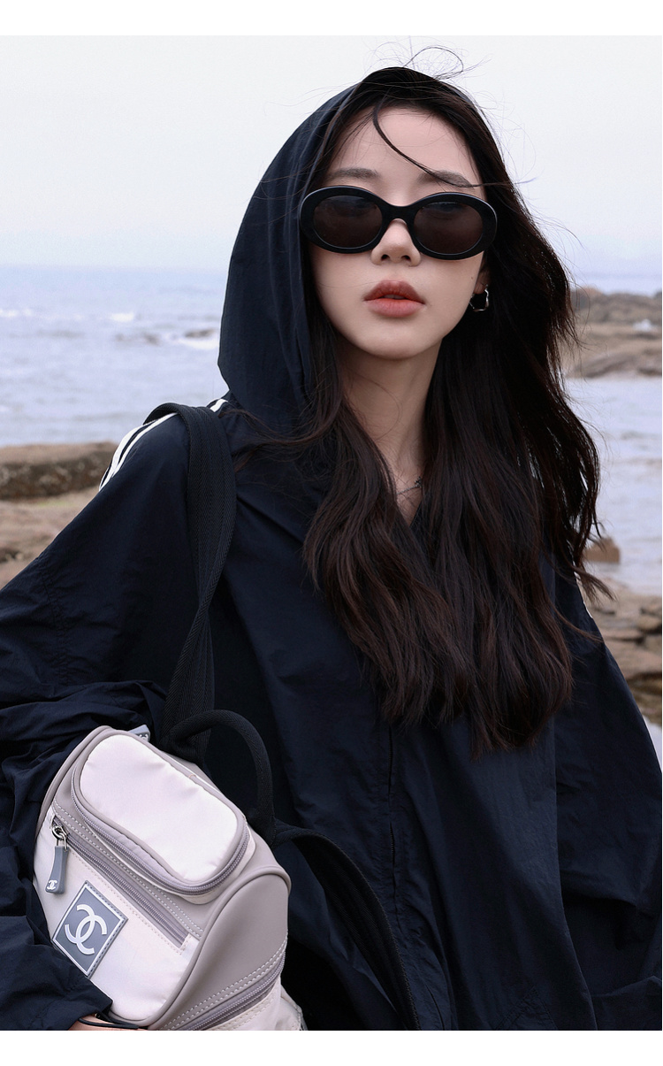 張貝貝ibell早秋新款美式戶外衝鋒衣女撞色條紋寬鬆長袖連帽外套