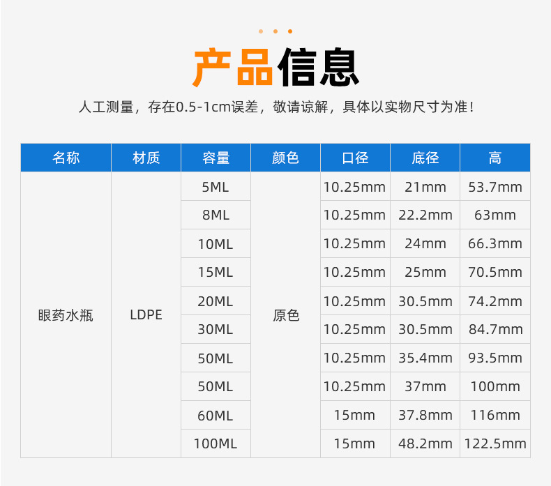 规格 10ML眼药水瓶,60ML眼药水瓶,5ML眼药水瓶,30ML眼药水瓶,8ML眼药水瓶,15ML眼药水瓶,100ML眼药水瓶,50ML眼药水瓶/无刻度