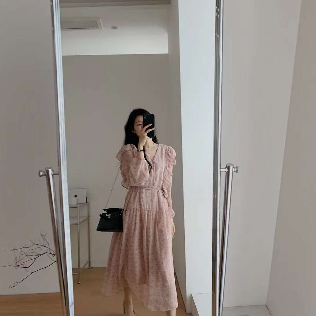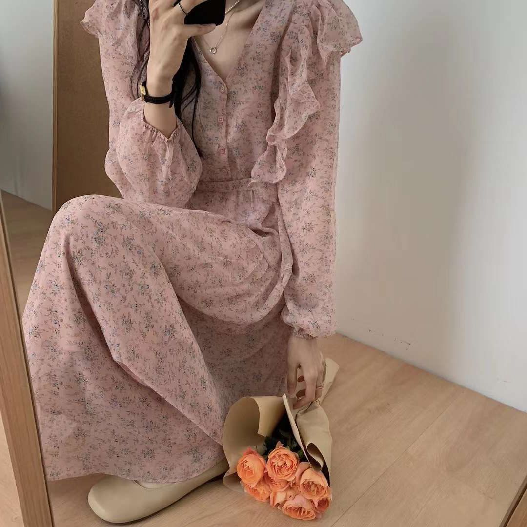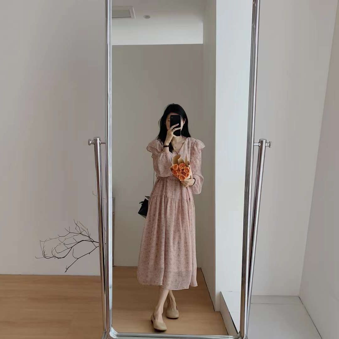 2023春季女装新款茶歇法式气质长裙子温柔显瘦仙女雪纺碎花连衣裙