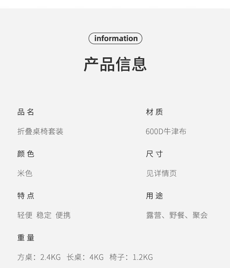 顏色分類 【新升級加強款】大號-米白(帶側兜+收納袋) 【新升級加強款】大號-黑色(帶側兜+收納袋) 【2-4人推薦】加厚白色方桌(送加厚收納包) 【2-4人推薦】加厚黑色方桌(送加厚收納包) 【3-6人推薦】米白加大95CM長桌(送加厚收納包) 【3-6人推薦】黑色加大95CM長桌(送加厚收納包) 【6-10人推薦】米白加大120CM長桌(送加厚收納包) 【6-10人推薦】黑加大120CM長桌(送加厚收納包) 米白【方桌+2個大號椅】送大號手提袋 米白【方桌+4個大號椅】送大號手提袋 黑【方桌+2個大號椅】送大號手提袋 黑【方桌+4個大號椅】送大號手提袋 米白【長桌+2個大號椅】送大號手提袋 米白【長桌+4個大號椅】送大號手提袋 米白【長桌+6個大號椅】送大號手提袋 黑色【長桌+2個大號椅】送大號手提袋 黑色【長桌+4個大號椅】送大號手提袋 黑色【長桌+6個大號椅】送大號手提袋 黑色【1.2長桌+4個大號椅】送大號手提袋 黑色【1.2長桌+6個大號椅】送大號手提袋 米白【1.2長桌+4個大號椅】送大號手提袋 米白【1.2長桌+6個大號椅】送大號手提袋
