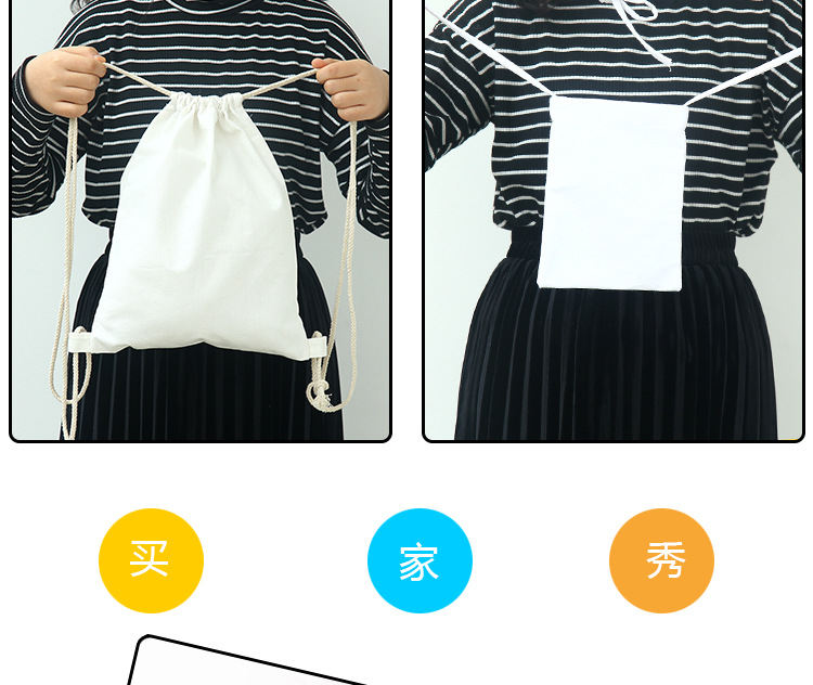 颜色 单肩包(漂白*加厚),手提包(本白*中厚),抽绳双肩背包(漂白*加厚),抽绳双肩背包(本白*中厚),抽绳包小包(本白*中厚),抽绳包大包(本白*中厚),斜跨长带包(漂白*中厚),中号福袋(本白*中厚)