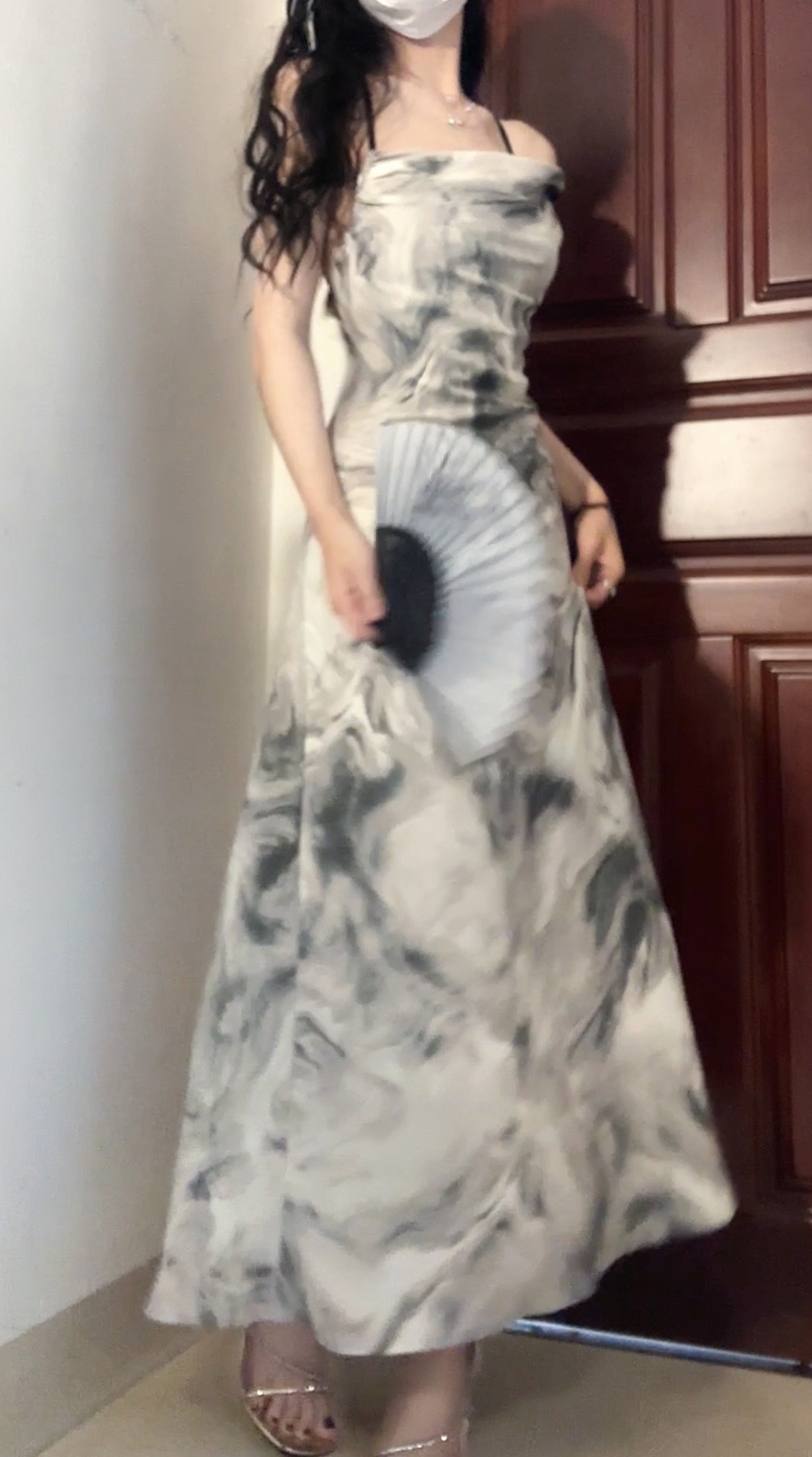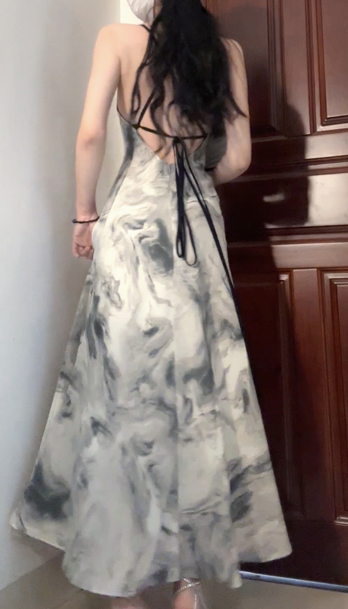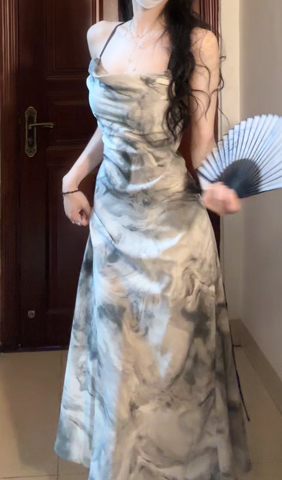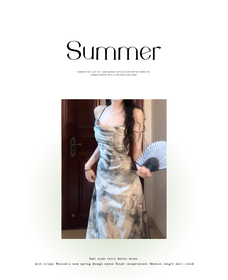 復古水墨畫洋裝女裝夏季純欲風性感露背吊帶裙紮染裙子法式長裙