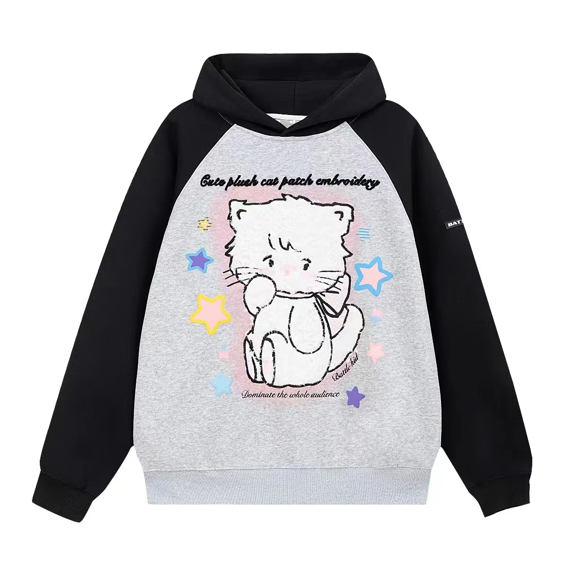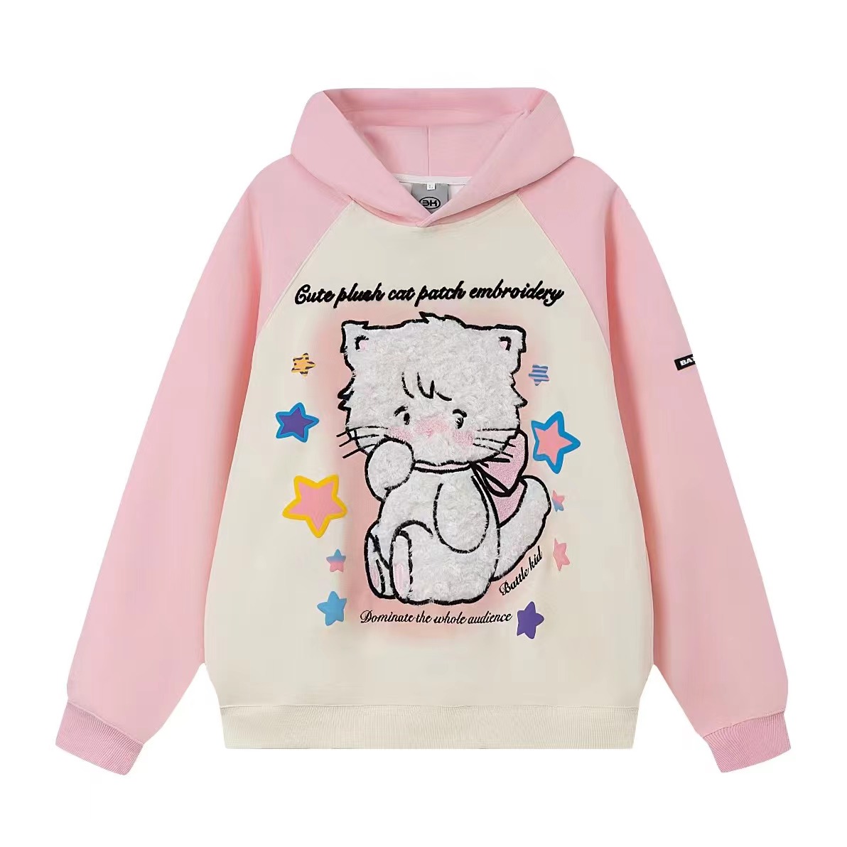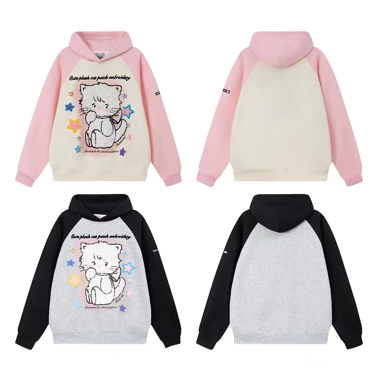 crazkilo-可愛甜美毛絨布貼刺繡貓咪卡通連帽運動衫情侶