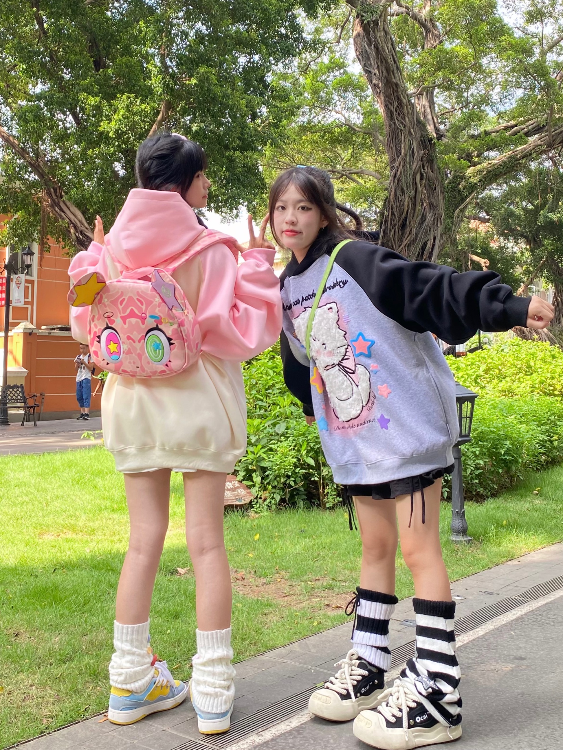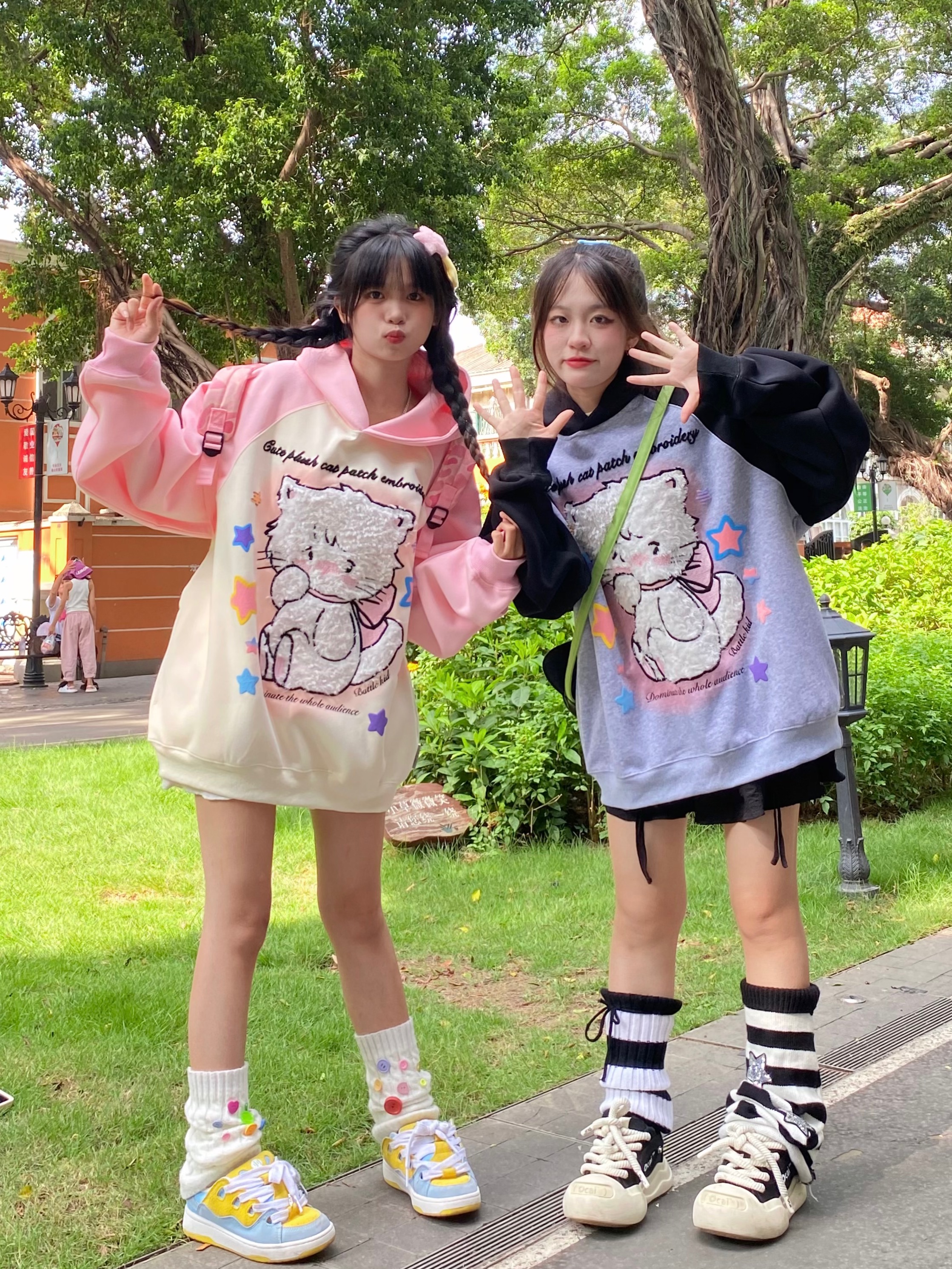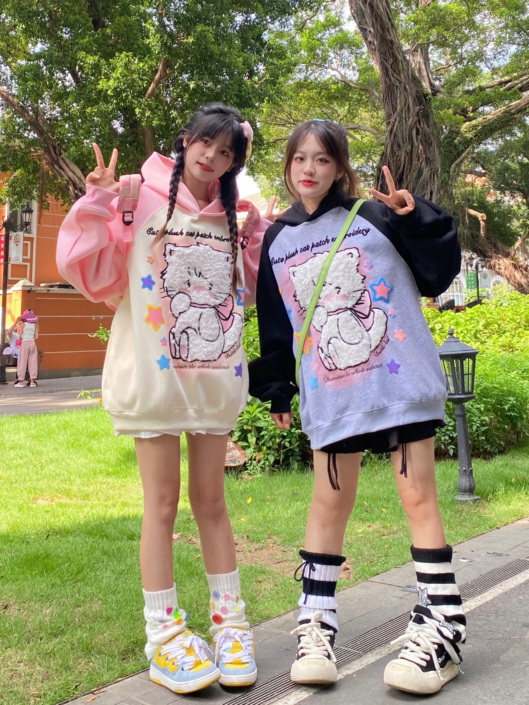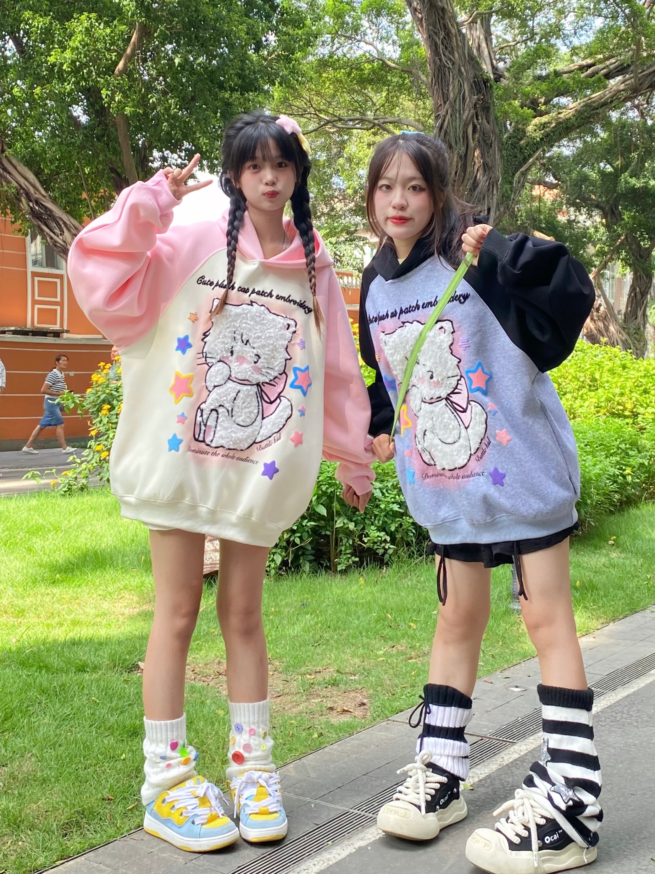 crazkilo-可愛甜美毛絨布貼刺繡貓咪卡通連帽運動衫情侶