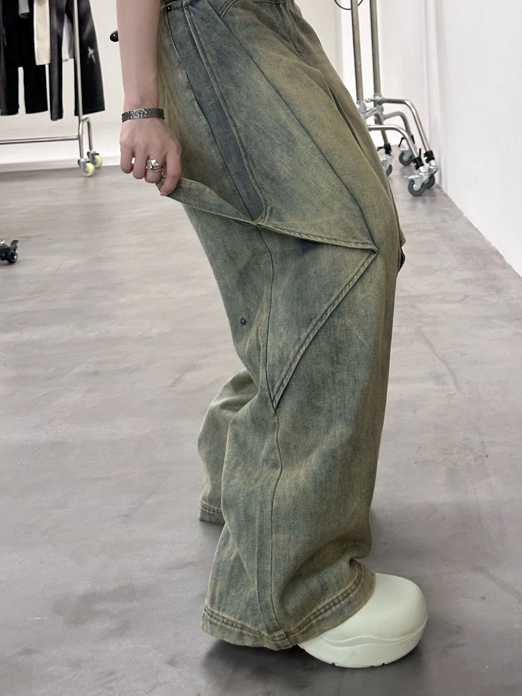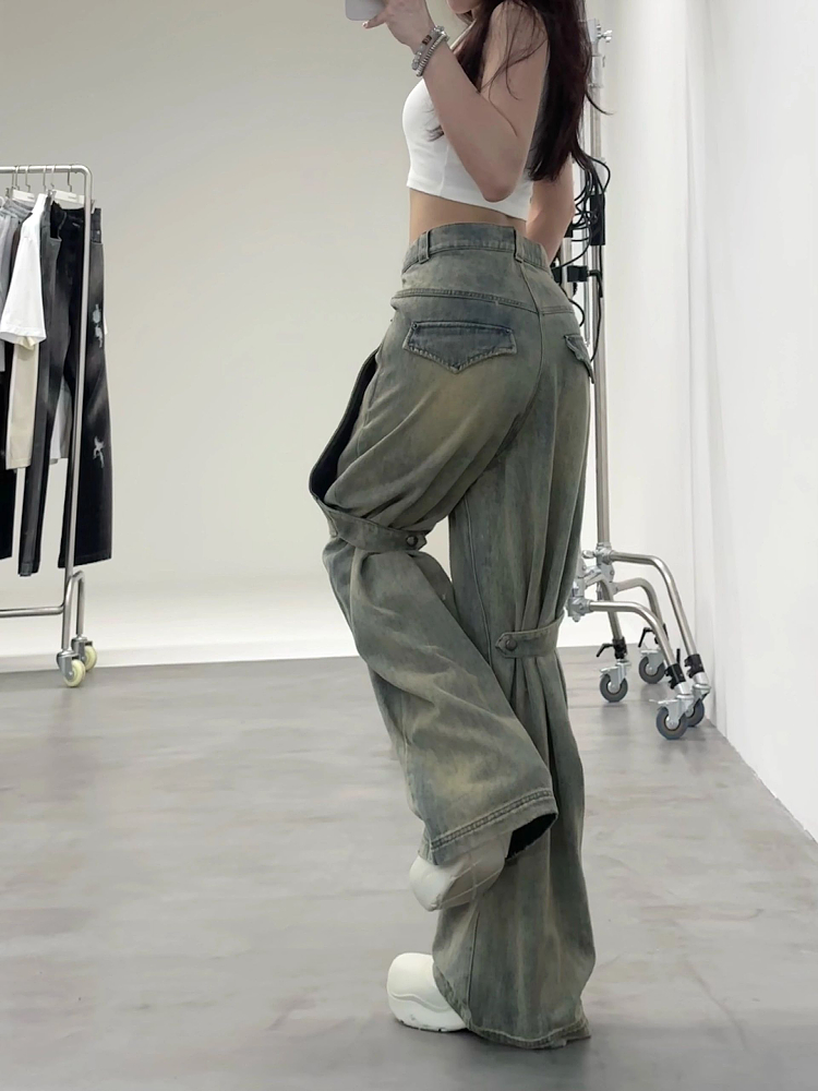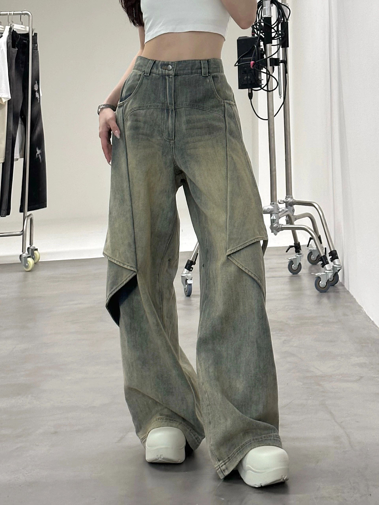 歐美式vibe復古水洗多穿法牛仔褲女設計感高腰寬鬆闊腿墜感拖地褲