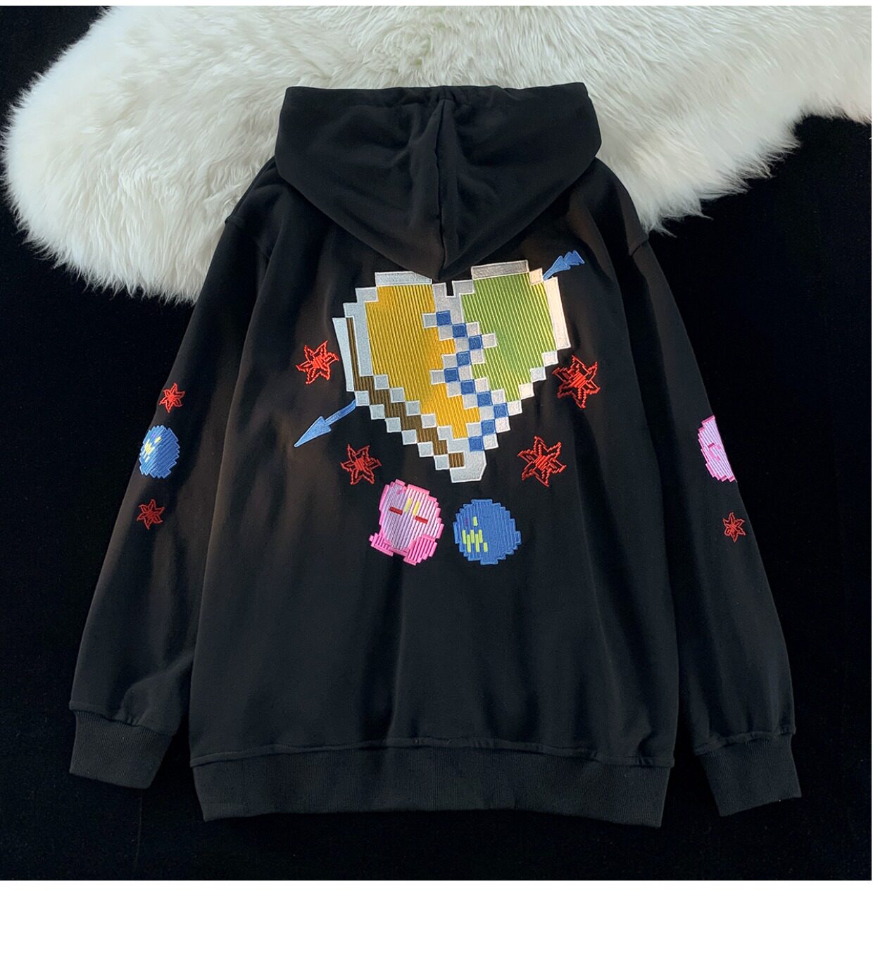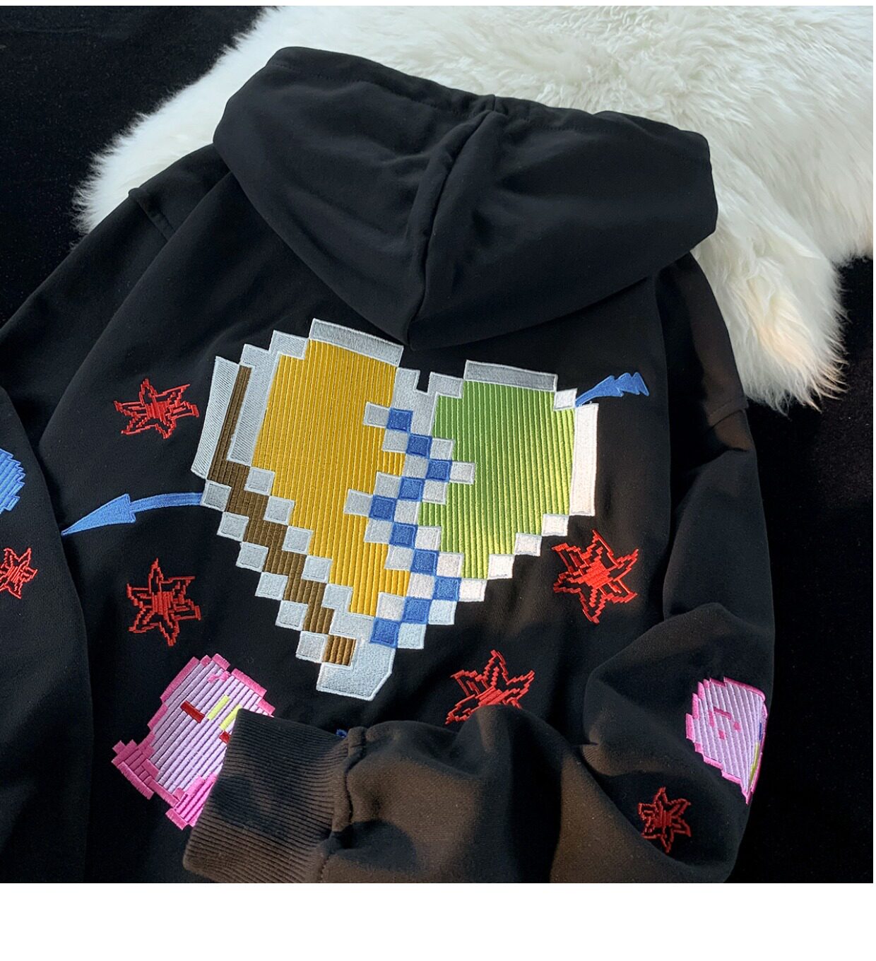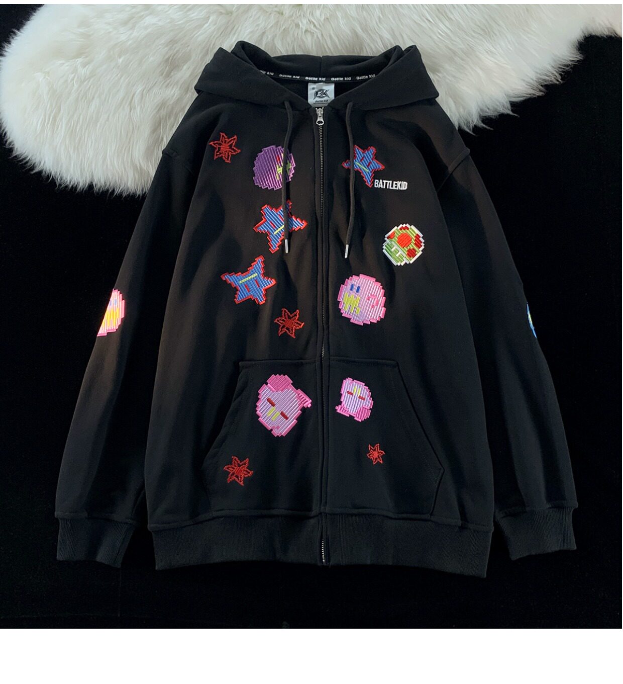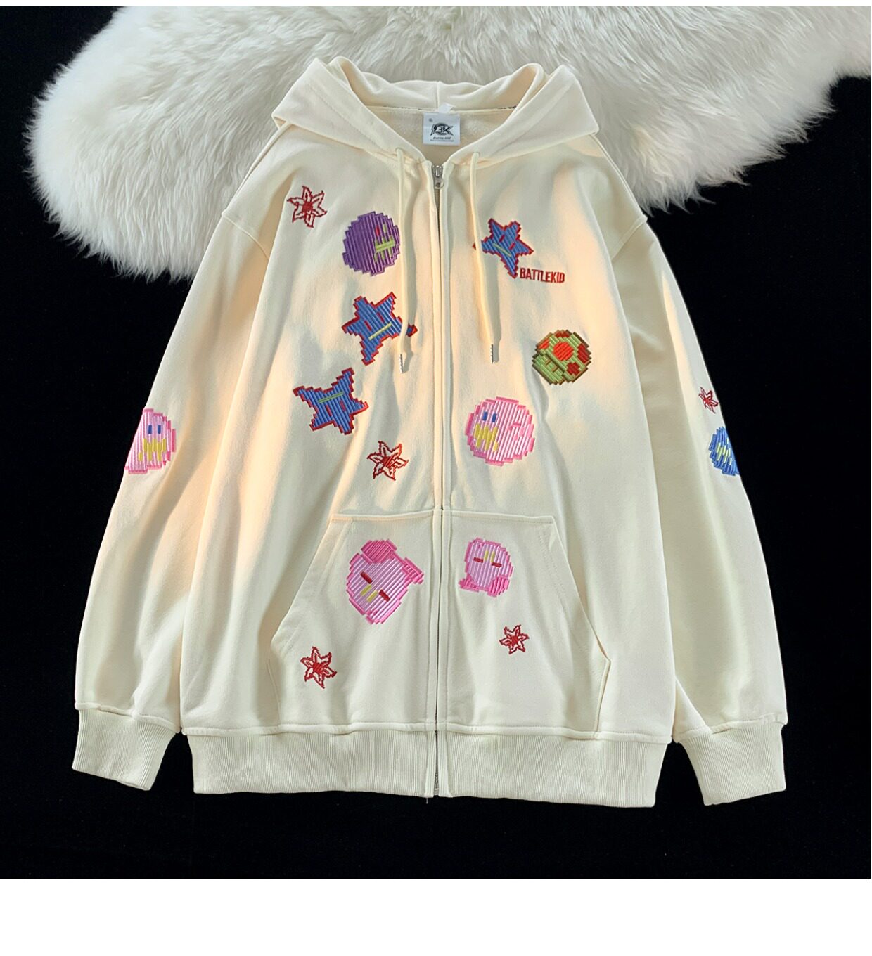 JIANYINZ可愛卡通塗鴉刺繡連帽開衫衛衣男女慵懶風拉鍊情侶外套潮