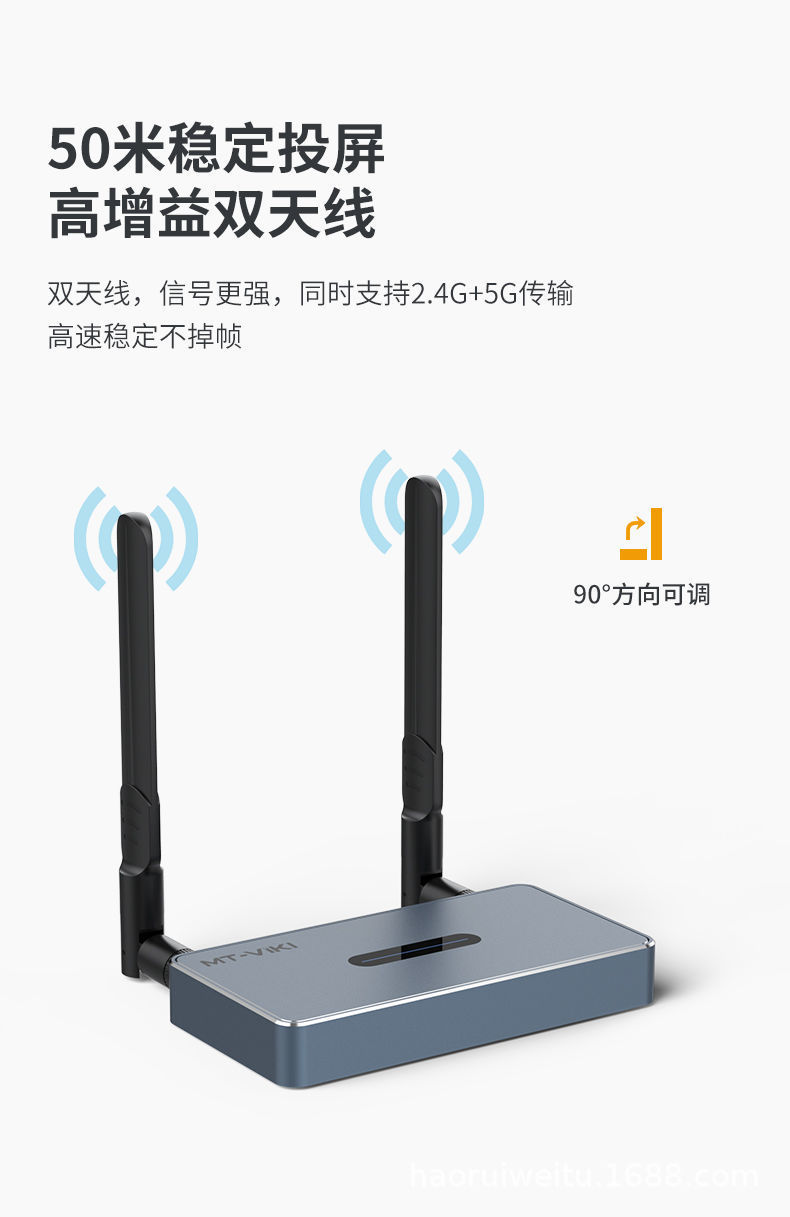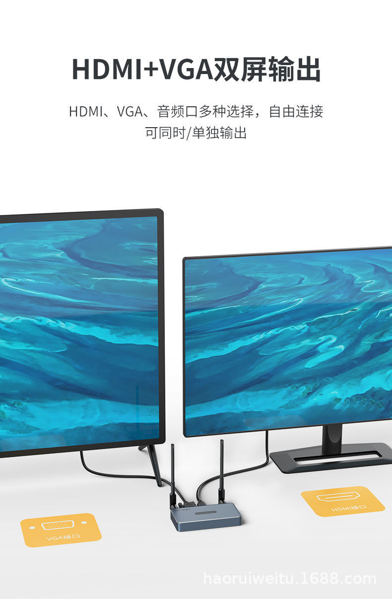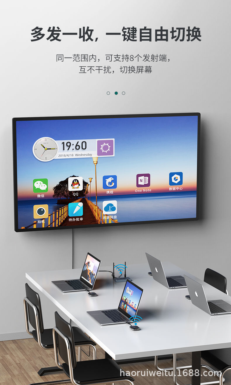 可以支持手机,电脑,平板,高清展台,摄像机等信号源设备无线传输HDMI高清视频到电视机,投影机等显示设备;可以支持8发1收,可以支持50米无线传输,免除工程布线的烦恼。
