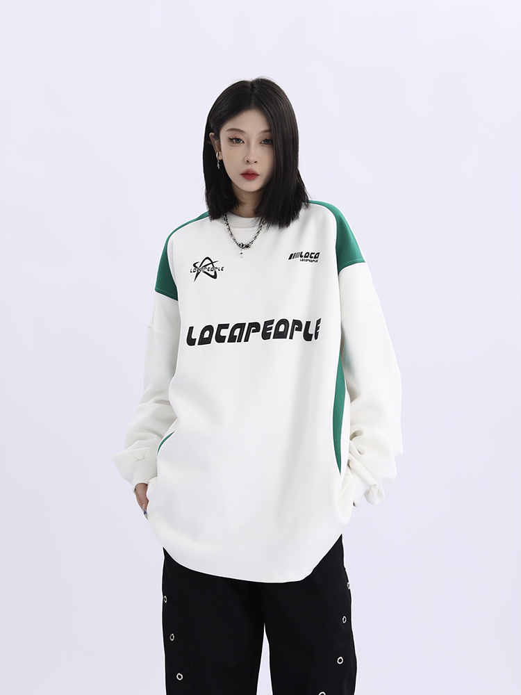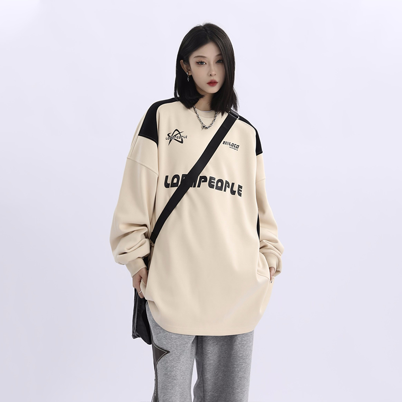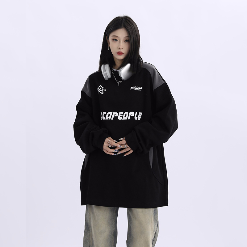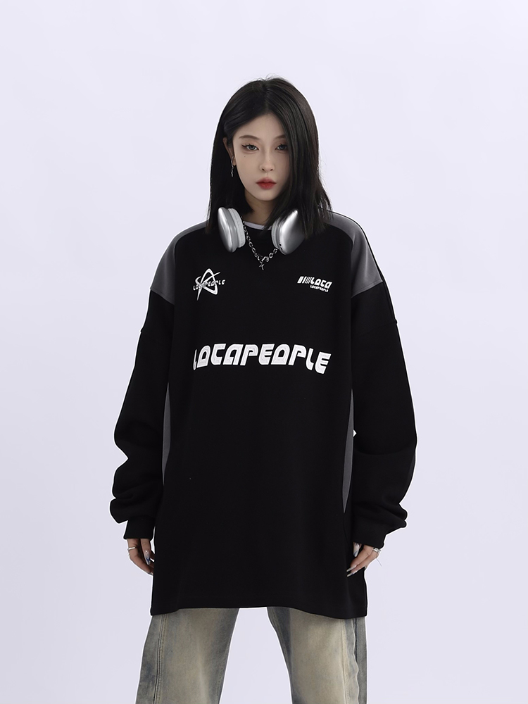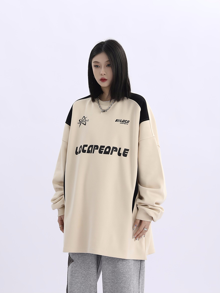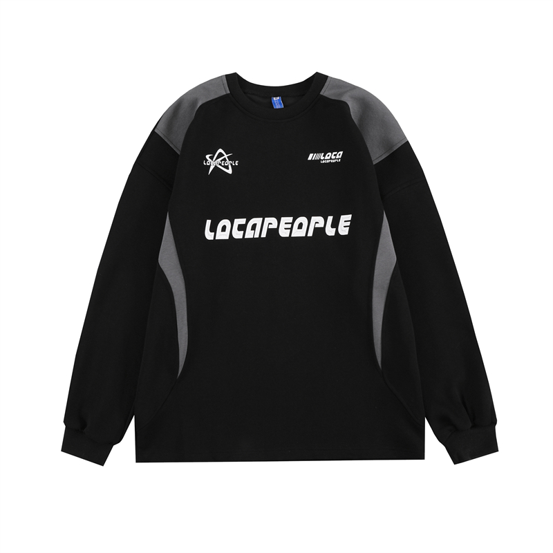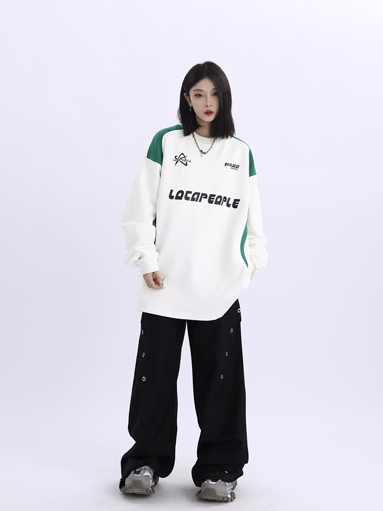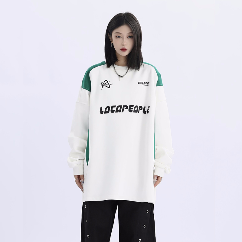 野生阿子美式街頭賽車元素圓領長袖厚棉T男女寬鬆春季百搭情侶上衣