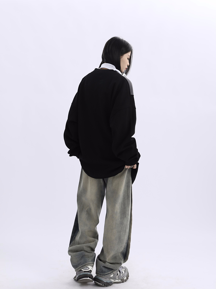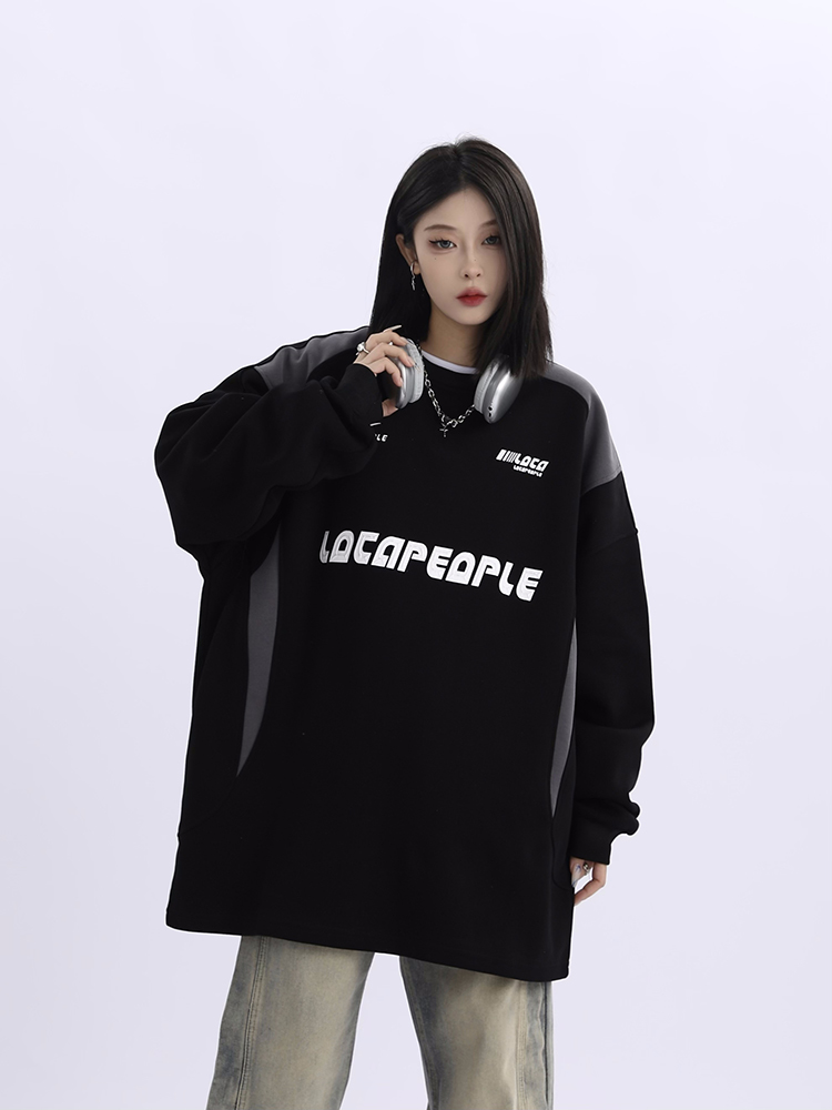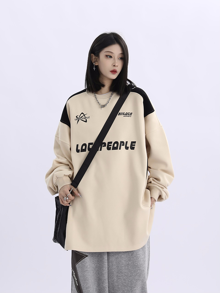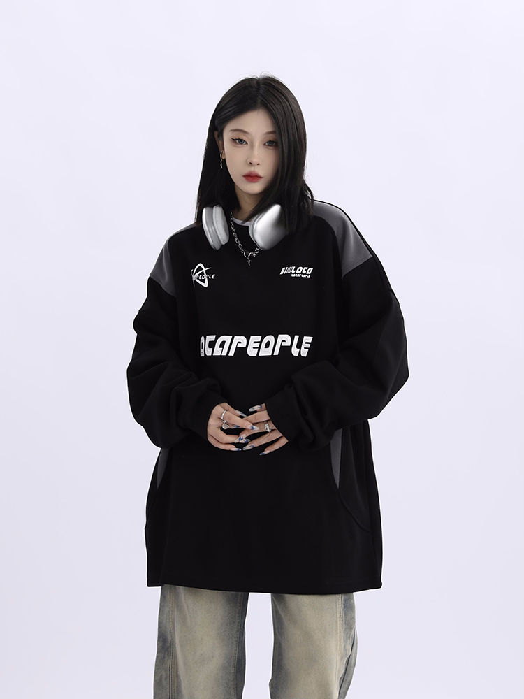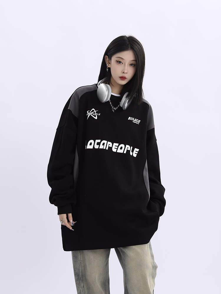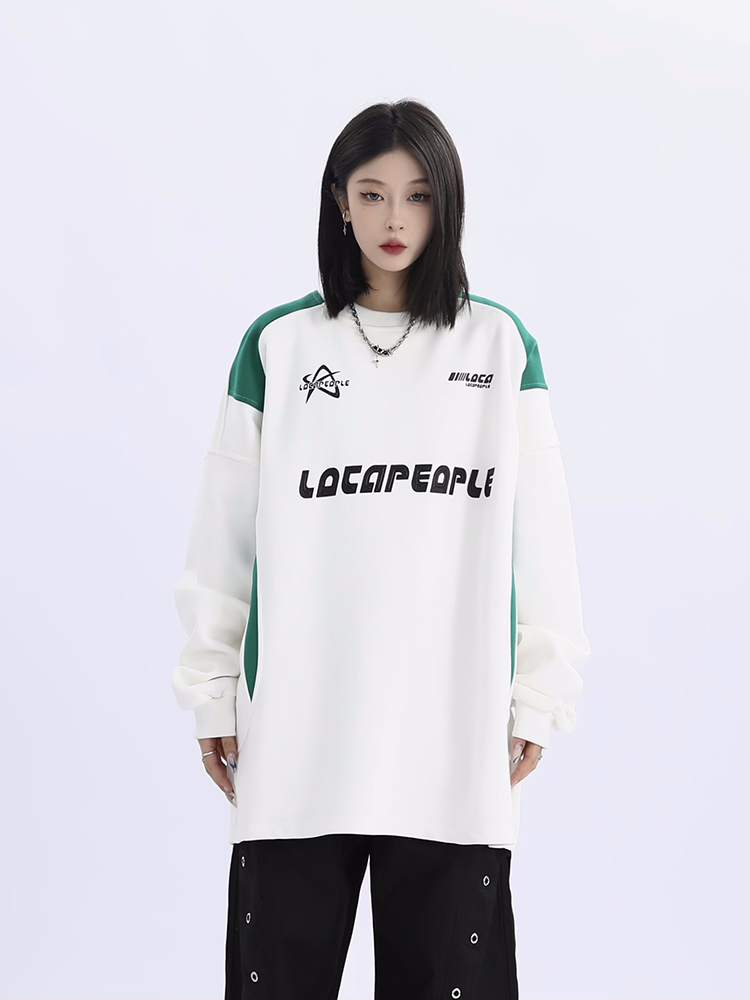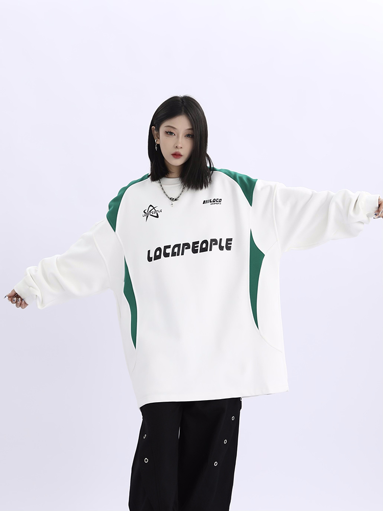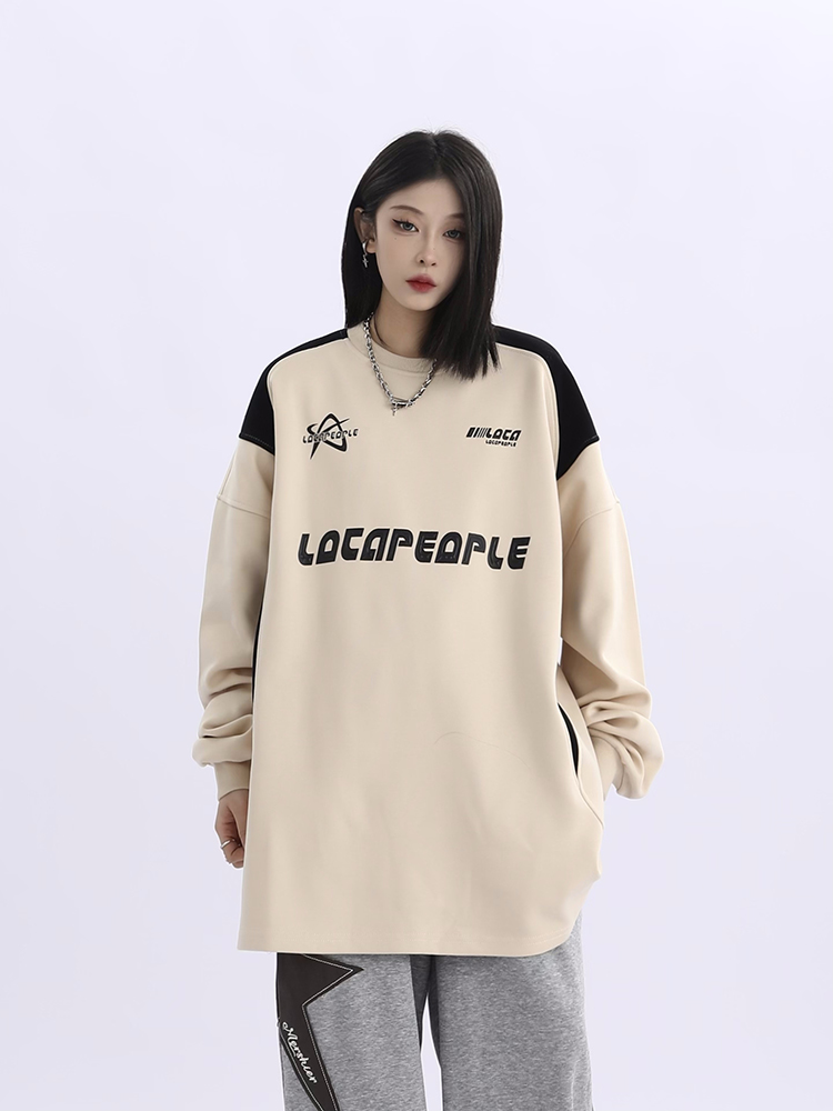 野生阿子美式街頭賽車元素圓領長袖厚棉T男女寬鬆春季百搭情侶上衣