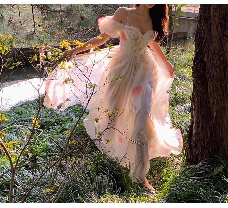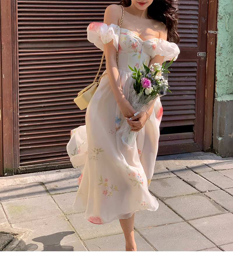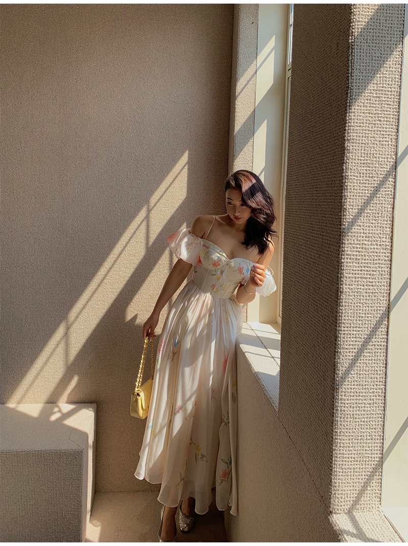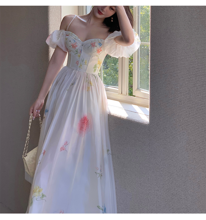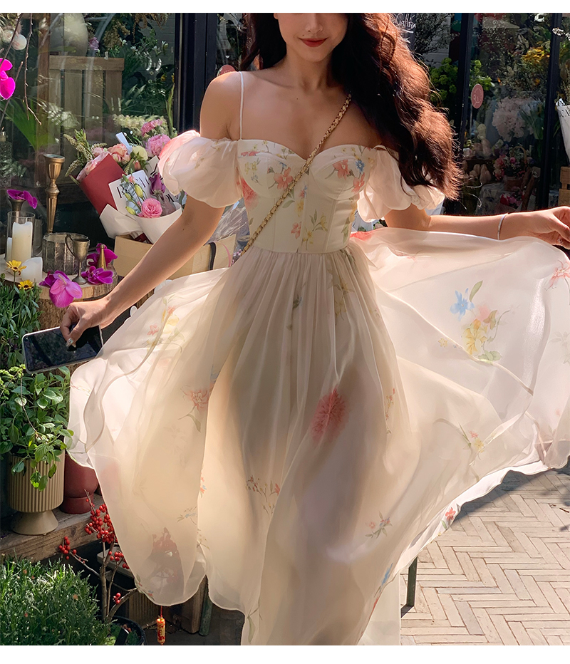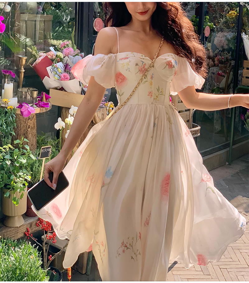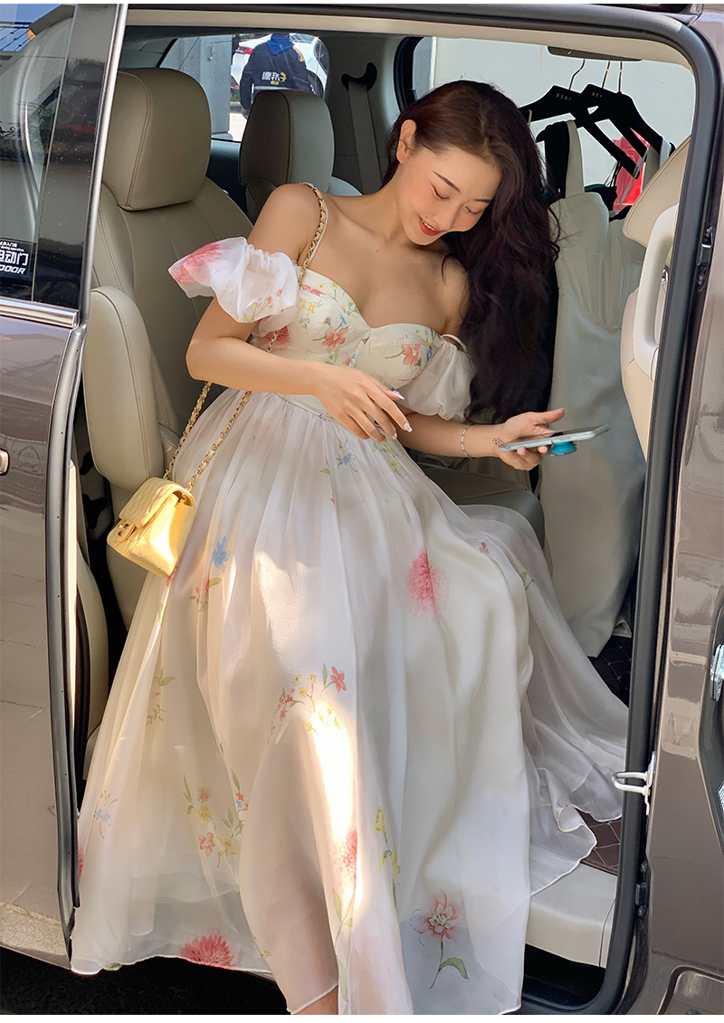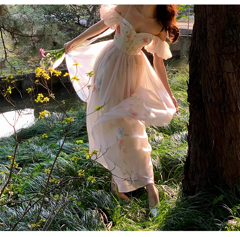 小麗XIAOLI腮紅一字肩泡泡袖吊帶碎花洋裝長裙女夏法式氣質紗裙子