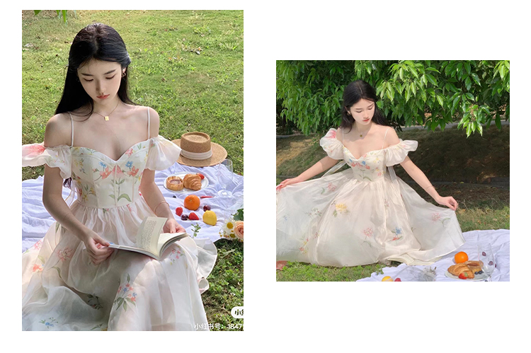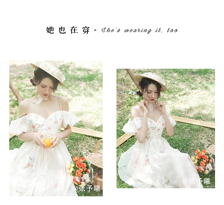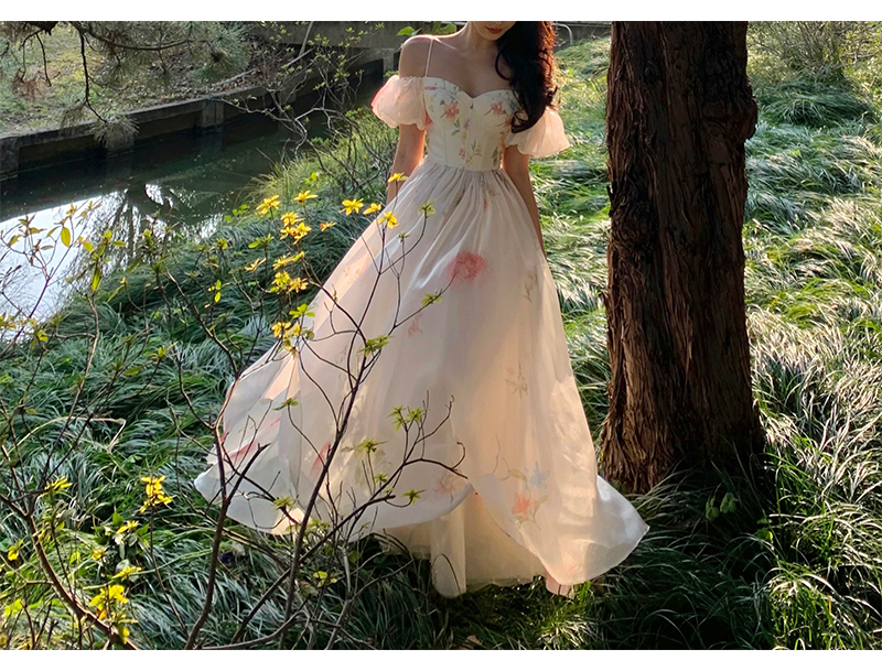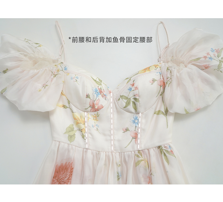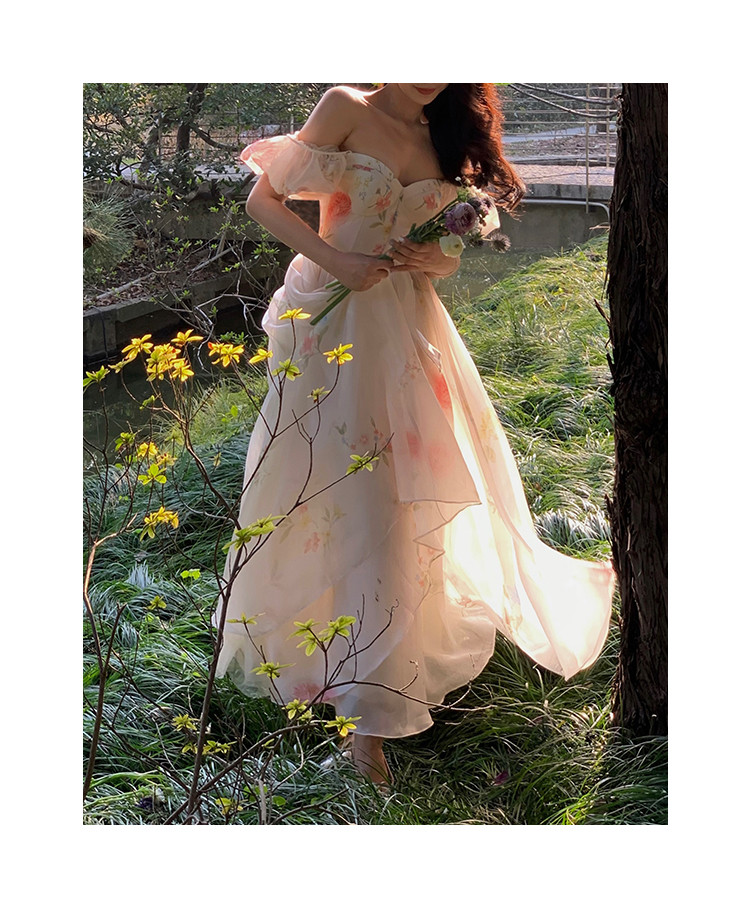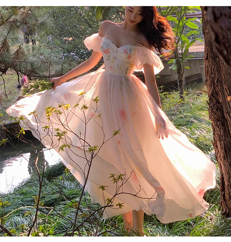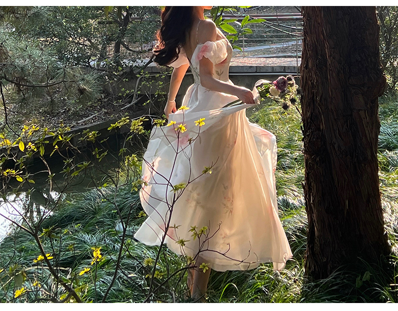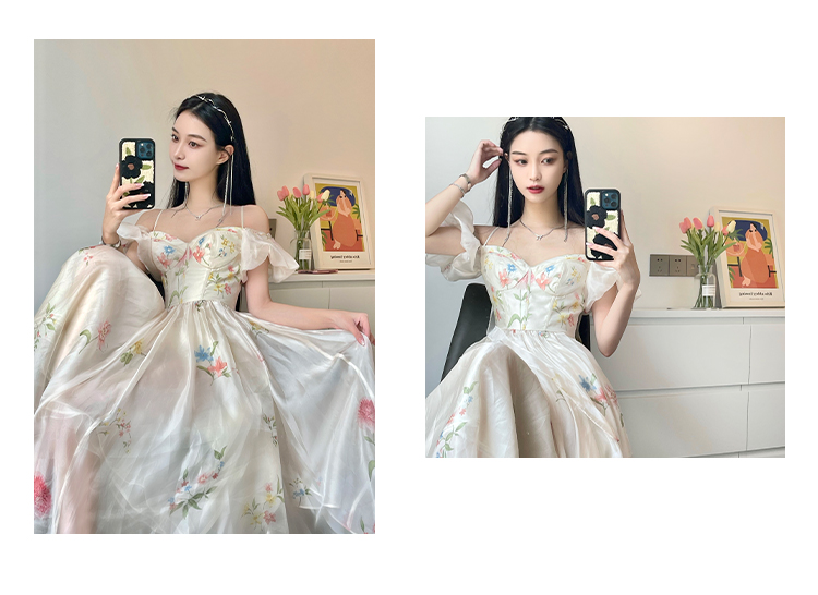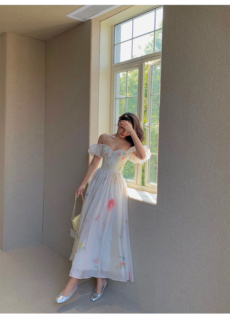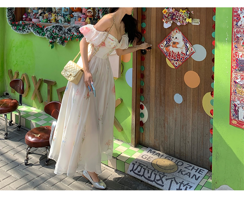 小麗XIAOLI腮紅一字肩泡泡袖吊帶碎花洋裝長裙女夏法式氣質紗裙子