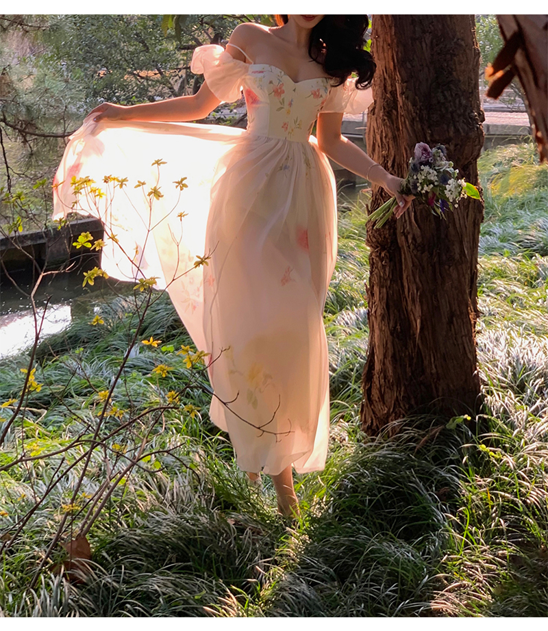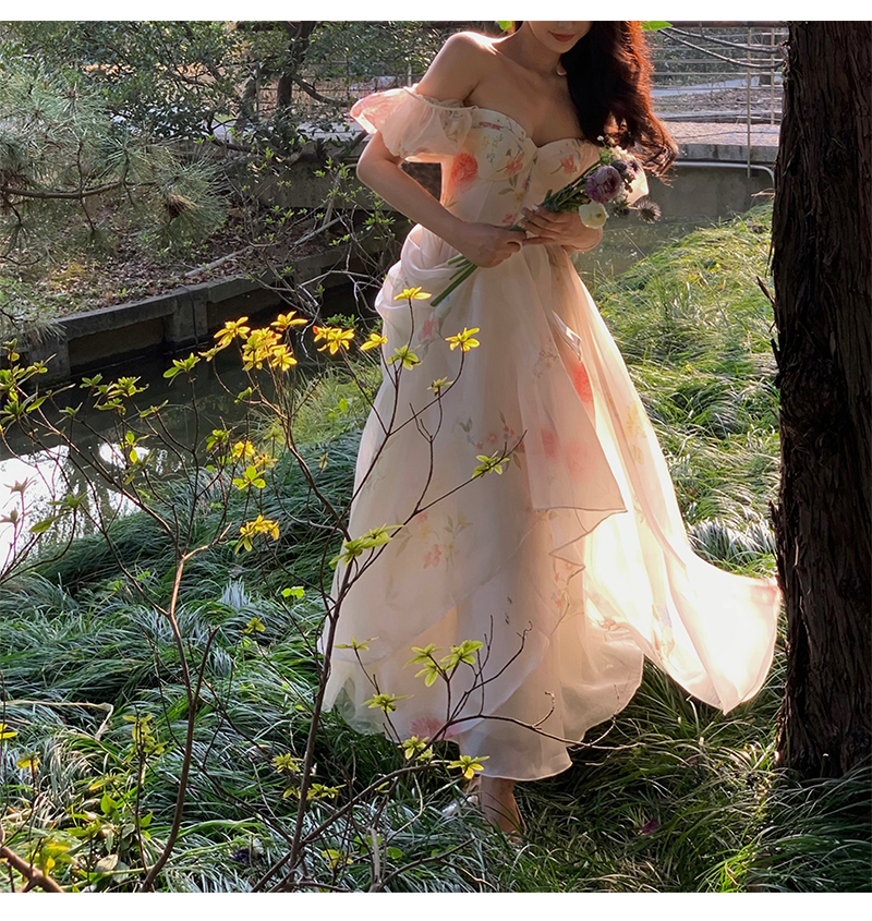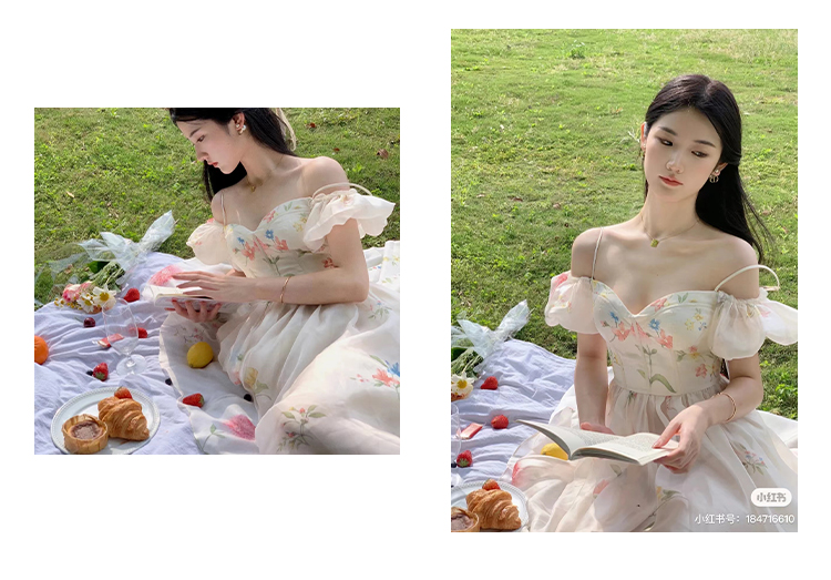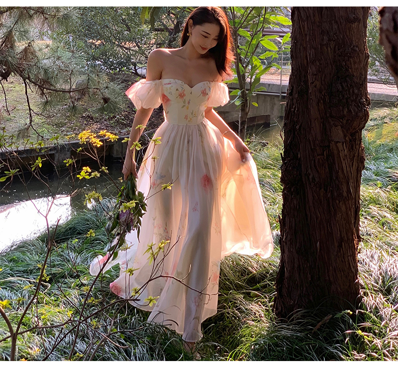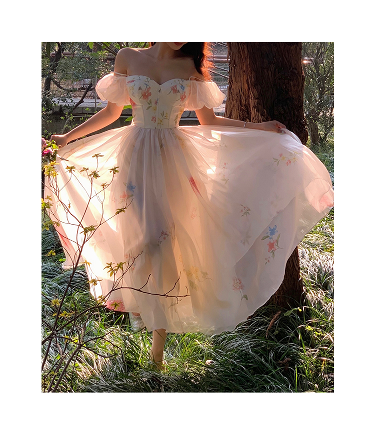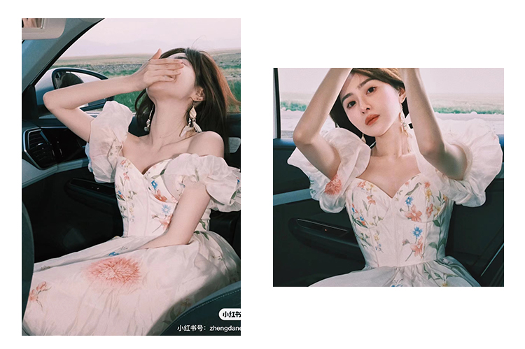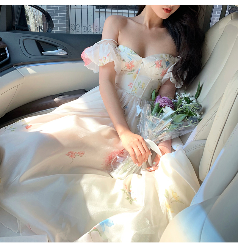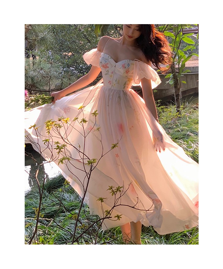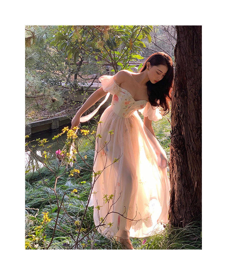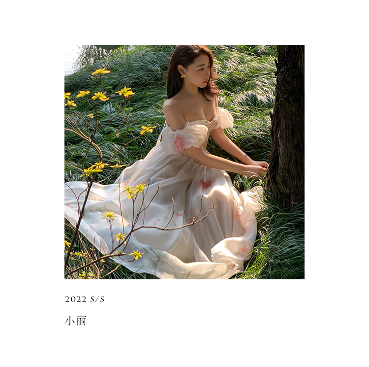 小麗XIAOLI腮紅一字肩泡泡袖吊帶碎花洋裝長裙女夏法式氣質紗裙子