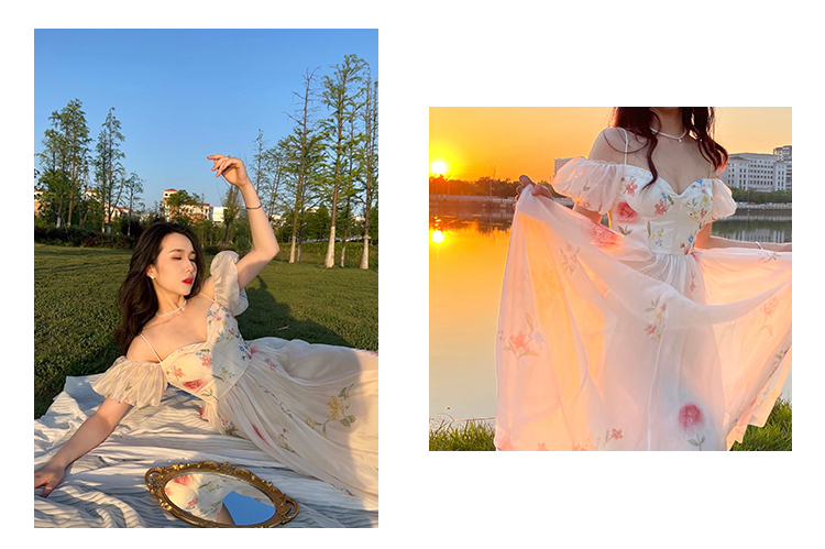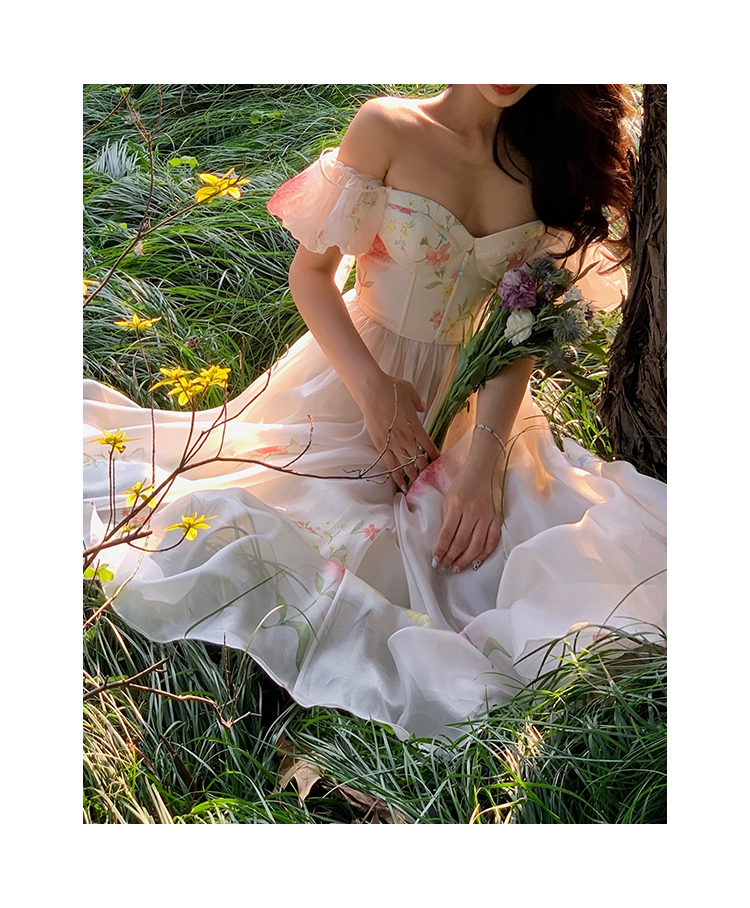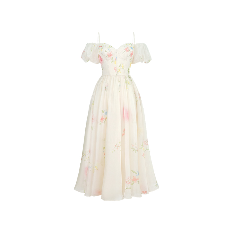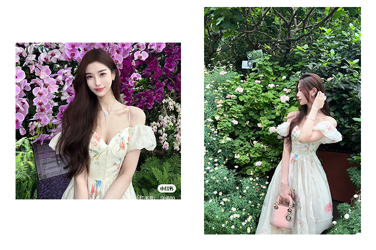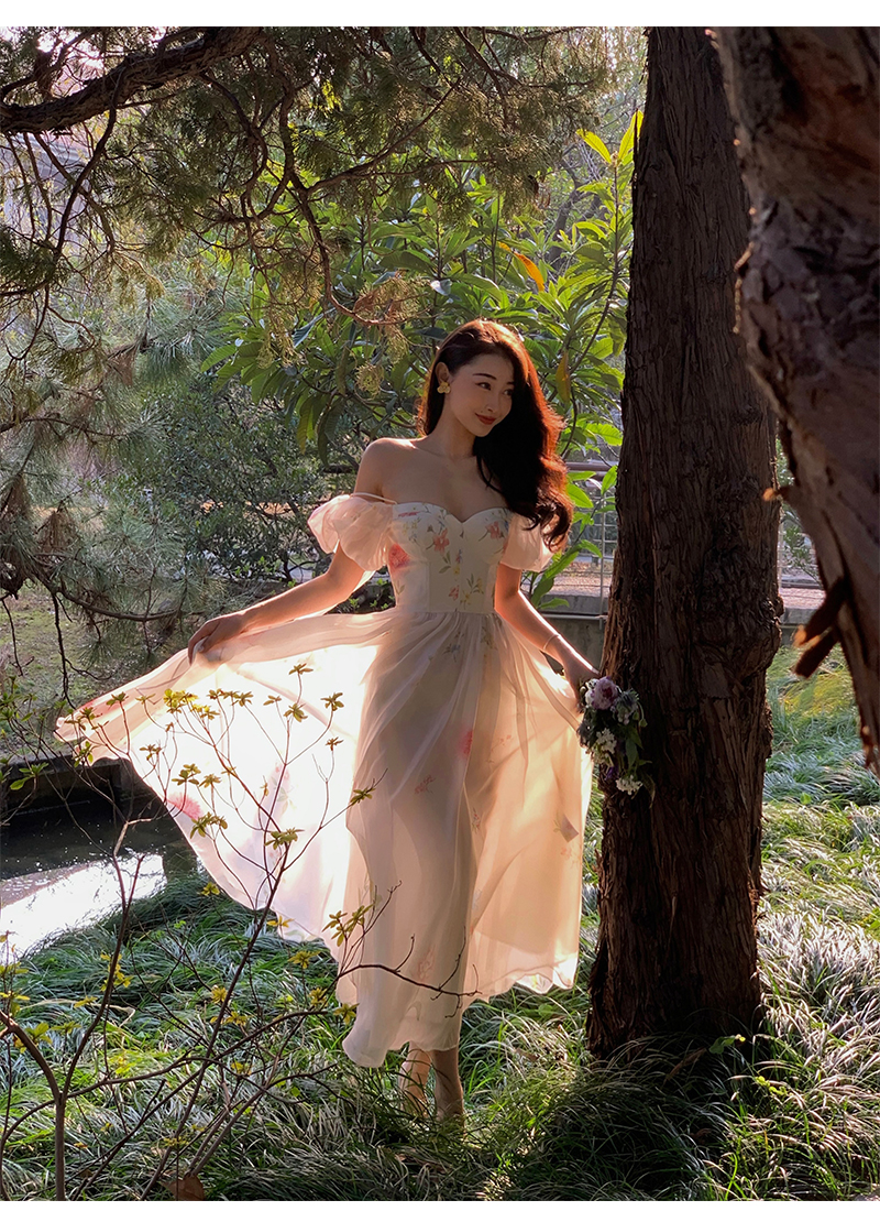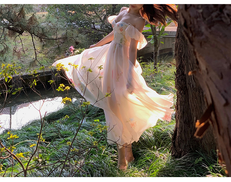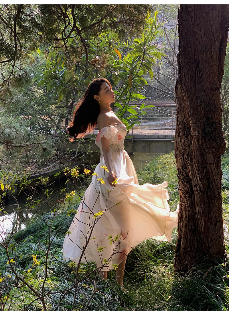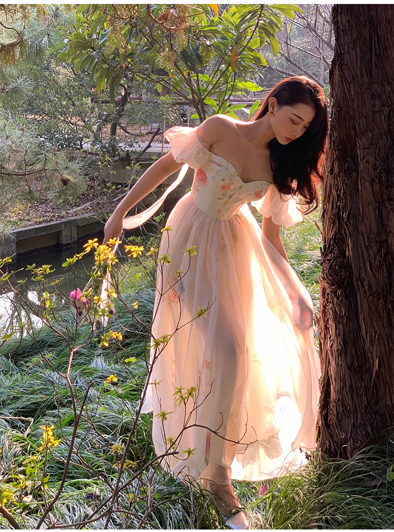 小麗XIAOLI腮紅一字肩泡泡袖吊帶碎花洋裝長裙女夏法式氣質紗裙子