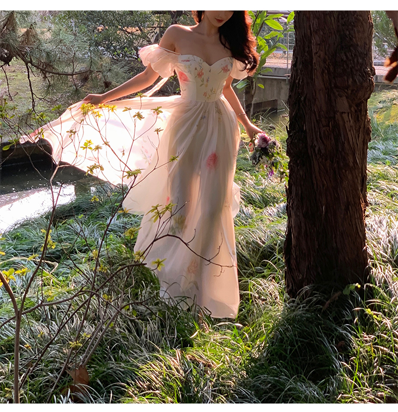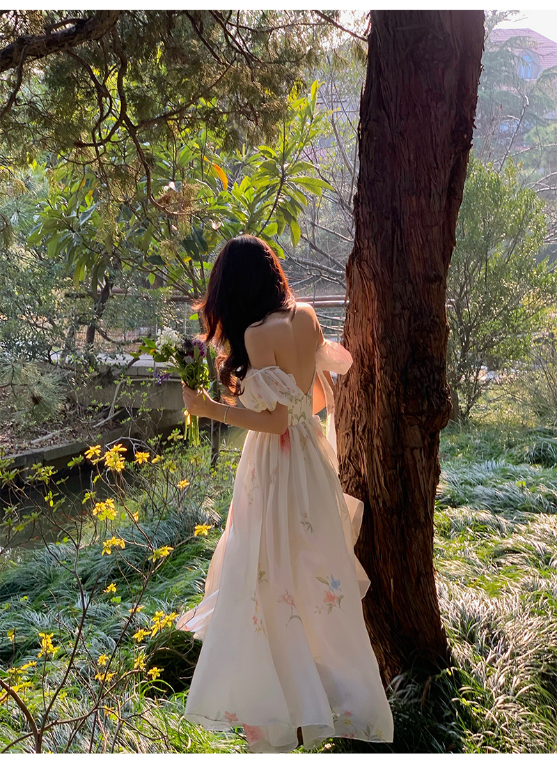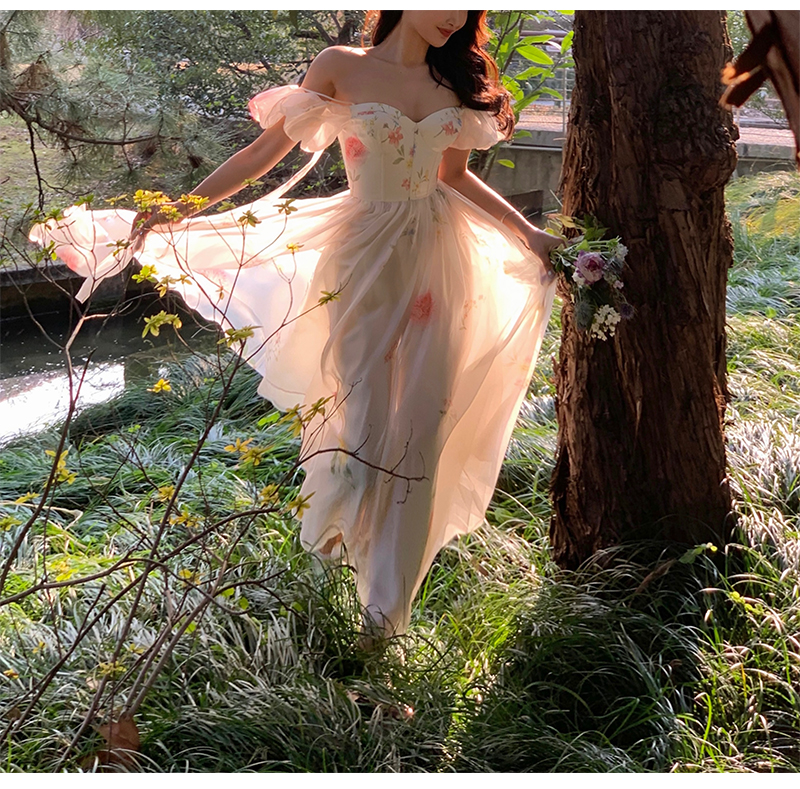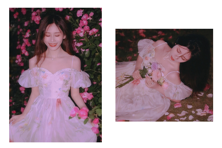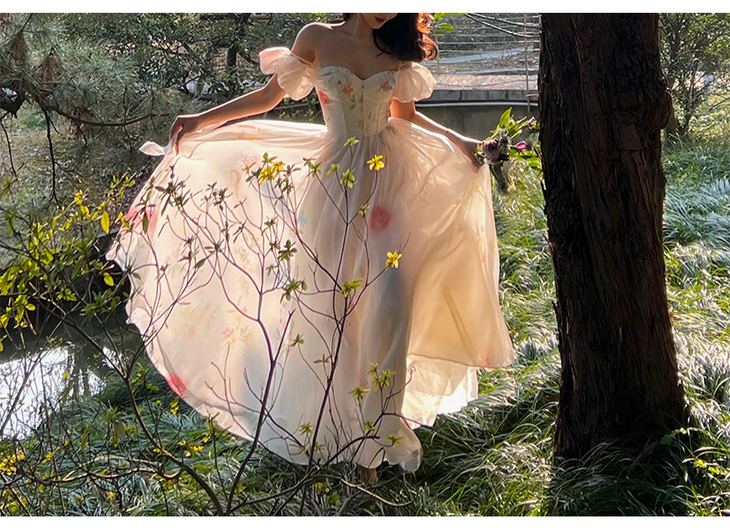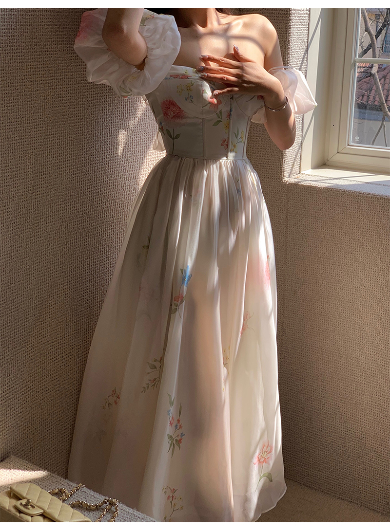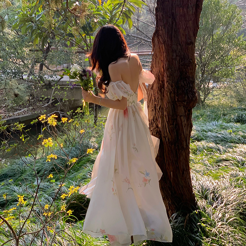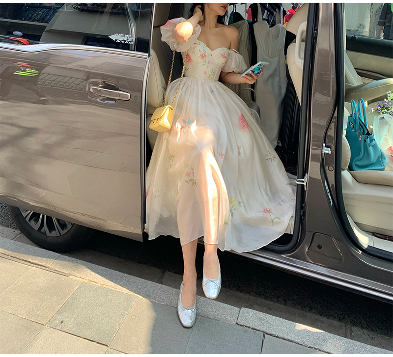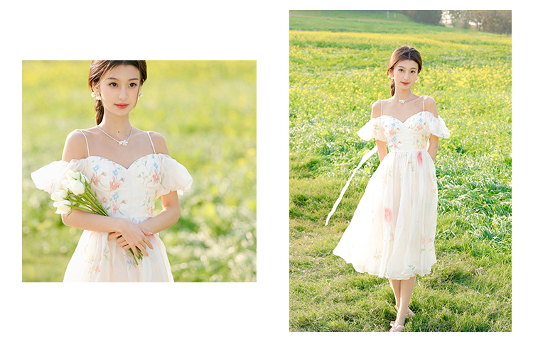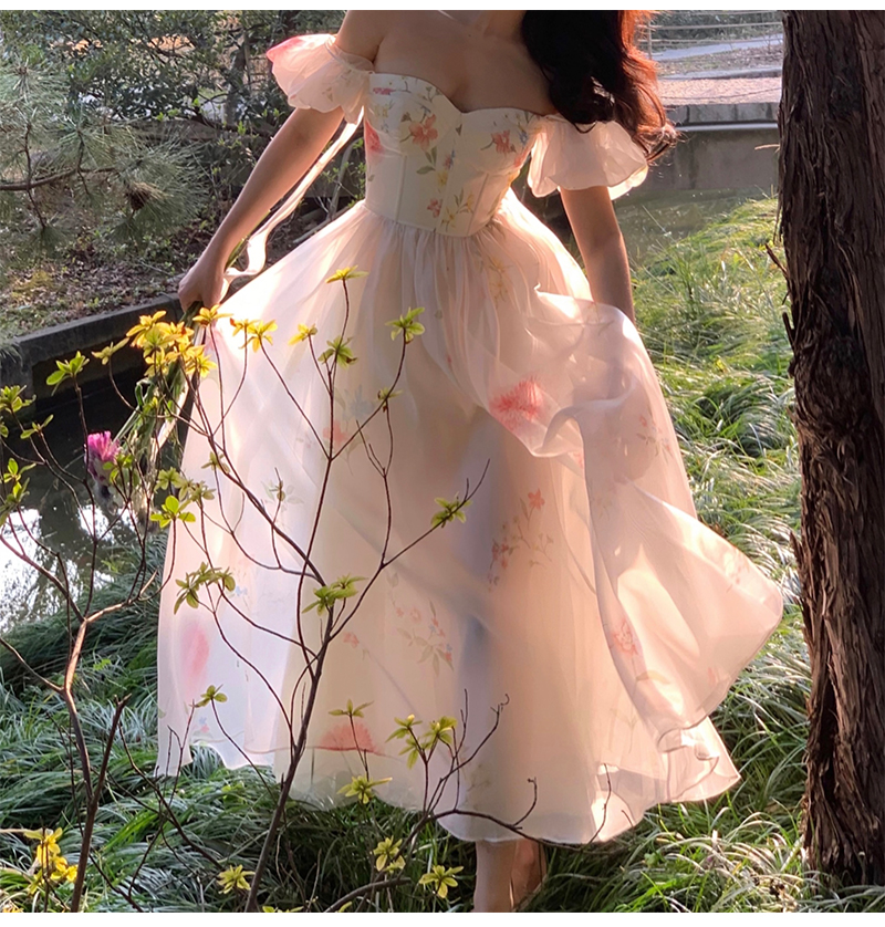 小麗XIAOLI腮紅一字肩泡泡袖吊帶碎花洋裝長裙女夏法式氣質紗裙子
